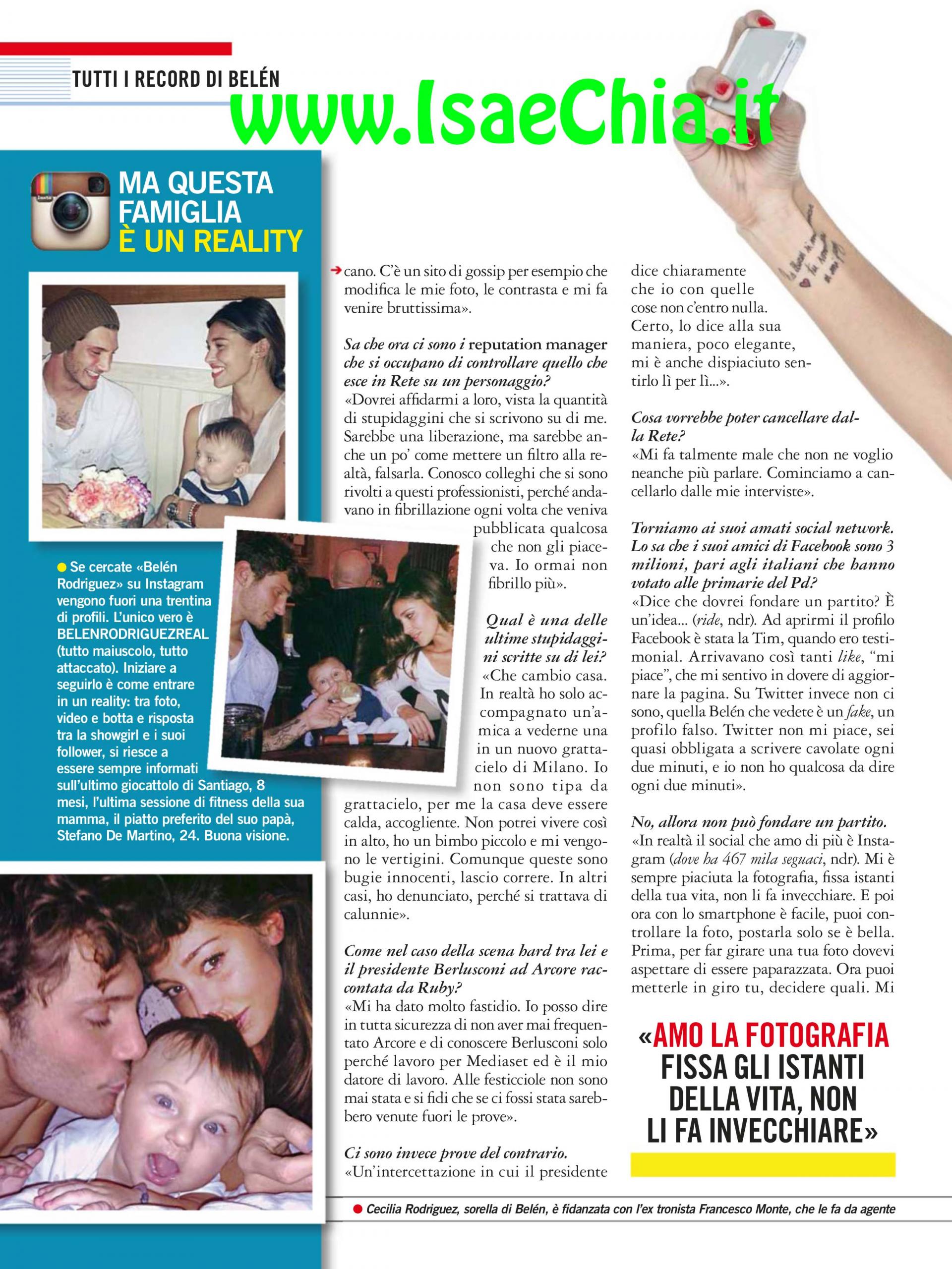 I lettori di Oggi.it hanno eletto “donna più sexy del 2013” Belén Rodriguez. Lei arriva all’appuntamento per l’intervista un po’ in ritardo e spiega: “Sono stata bloccata dalle manifestazioni dei Forconi. Se avessi potuto, sarei scesa anch’io a manifestare con loro. Era tanto tempo che mi chiedevo come mai gli Italiani, che subiscono da anni una situazione inaccettabile, non scendessero in piazza. Mi permetto di parlare solo perché ho conosciuto la crisi devastante in Argentina di 15 anni fa: so cosa vuol dire passare dal ceto medio a non avere l’acqua calda in casa. Siamo scesi in piazza, abbiamo avuto molti morti, ma abbiamo ottenuto le leggi per agevolare l’economia del nostro Paese”. Quando invece le si chiede come mai gli Italiani l’abbiano preferita a Scarlett Johansson e Angelina Jolie e il suo matrimonio abbia registrato il picco di ricerche su internet, risponde: “E che ne so! E’ curiosità. Mi cerco su Google e vedo cosa dicono di me: un sito mette delle foto che mi imbruttiscono: dovrei affidarmi a dei reputation manager! Conosco dei colleghi che lo hanno fatto, ma mi sembrerebbe di falsare la realtà. Una delle ultime stupidaggini scritte è che cambio casa, mentre avevo solo accompagnato un’amica a vedere un grattacielo a Milano. In altri casi ho denunciato, perché si trattava di calunnie. Ad esempio, posso dire molto bene di non conoscere Arcore e di conoscere Silvio Berlusconi solo perché lavoro per Mediaset. C’è un’intercettazione in cui il Presidente dice che io non c’entro niente con quelle storie, anche se in modo poco elegante”. Infine, quando parla dei suoi follower su Facebook, che sono 3 milioni come gli Italiani che hanno votato per le primarie del PD, risponde: “Potrei fondare un partito! Il profilo me l’ha aperto la Tim quando ho fatto lo spot per loro. Quello di Twitter, invece, è un fake: non mi piace, non ho qualcosa da dire ogni due minuti. Quello che amo di più è Instagram: mi è sempre piaciuta la fotografia, ho un ruolo attivo e allento la pressione dei paparazzi. La regola perfetta per l’autoscatto è tenere la mano più su del viso: mai inquadrarsi dal basso, poi controllare le luci e fare più scatti, da selezionare”. E a quanto pare quest’autopromozione serve, dato che è testimonial di una decina di marche diverse, compresa la Imperfect, di cui è socia: “Lavoro tutti i giorni, a qualsiasi ora: è uno dei motivi per cui ho detto no a Ballando con le stelle argentino. Vabbuò, guadagno molto” E sul “vabbuò” commenta: “Stando con mio marito Stefano De Martino ho cominciato a intercalare “vabbuò” e “assai”. Non vengo da una famiglia ricca né ho sposato un miliardario: sono una turbodonna. Lavoro molto, ma pago anche delle tasse altissime. In questo Paese fanno di tutto per farti venir voglia di andartene, ad esempio ho scoperto che se vendi casa prima di 5 anni dall’acquisto, devi pagare tantissimo. Finché l’italiano dirà “vabbuò”, la situazione non cambierà. A Natale? Prendo mio figlio Santiago e Stefano e me ne vado dai miei in Argentina!”