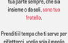 E le nostre “controindicazioni” sono proprio il motivo per cui siamo così speciali, proprio come le piccole imperfezioni della voce quando cantiamo. Chi sono io per cercare di spremere fuori da te solo il succo magico che hai dentro e filtrare tutto il resto per poi buttarlo via? Come Ying e Yang, io penso di darti invece quella profondità che a volte non riesci ad esprimere. Non ti manca la profondità fratello, hai un oceano dentro ma hai più paura di me di navigarci. Proprio come io ho una paura tremenda di stare in superficie e avere gli occhi puntati addosso, anche se a volte ci scambiamo quasi in simbiosi, per compensarci.