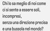 E anche se indosso una maschera e un’armatura per far sembrare che vada tutto ok ogni tanto ho momenti di lucidità come questo e ammetto a me stesso che non c’è vergogna a essere vulnerabili. Entrambi siamo stati persi per tanti anni, ci siamo persi crescendo e ci perdiamo costantemente. E anche se odio sentirmi “perso” preferisco questa insicurezza che il falso senso di sicurezza di una vita con il freno a mano tirato. Io qui ti scrivo per dirti che anni fa ci siamo trovati, e potremmo farlo di nuovo.