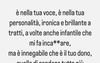 Ora invece voglio parlarti in maniera più esplicita e sincera possibile, senza filtri e mezzi termini: sono sicuro che da soli possiamo fare grandi cose ma la verità è che insieme siamo una forza della natura. E te lo dico questo, non per cercare di sminuirci individualmente, ma al contrario spronarci a stringere la mano una volta ancora e ricordarci che insieme nulla è impossibile. Sarà che quando ti ho accanto, qualche dubbio me lo togli. E forse quando mi hai accanto, qualche dubbio te lo tolgo.