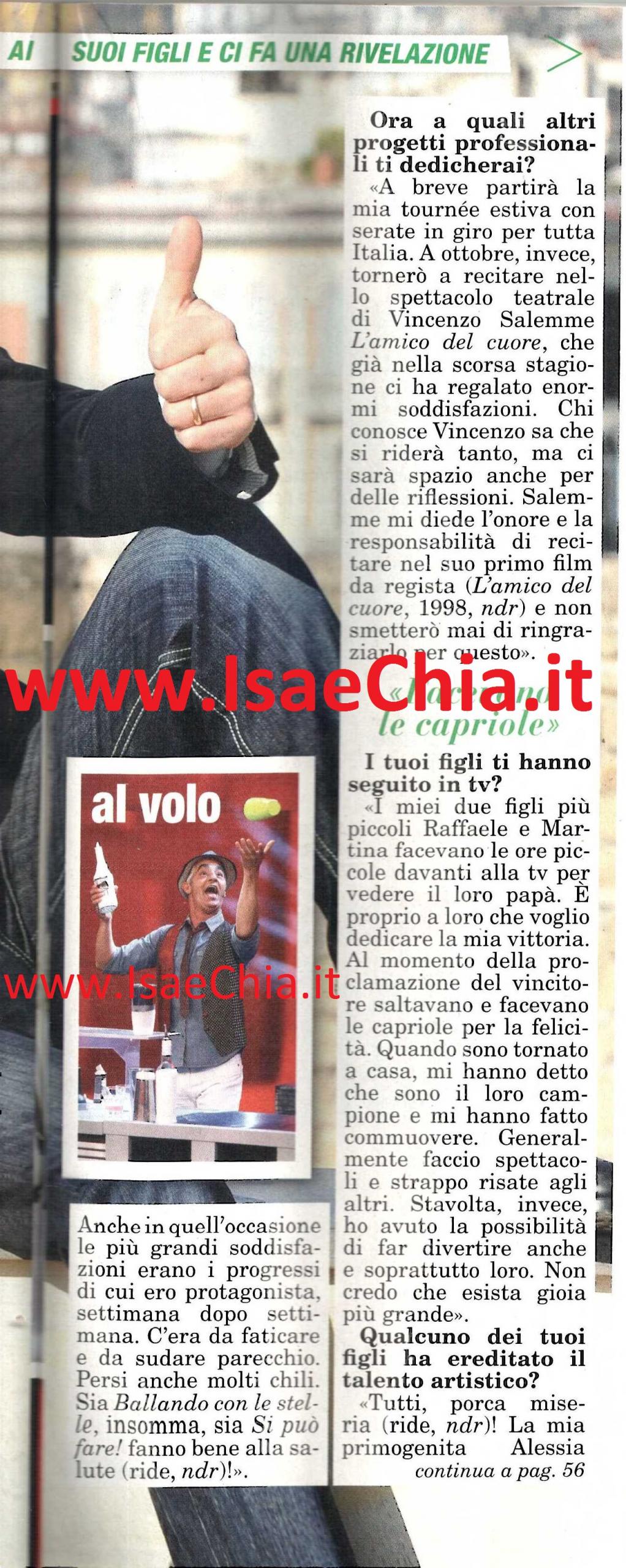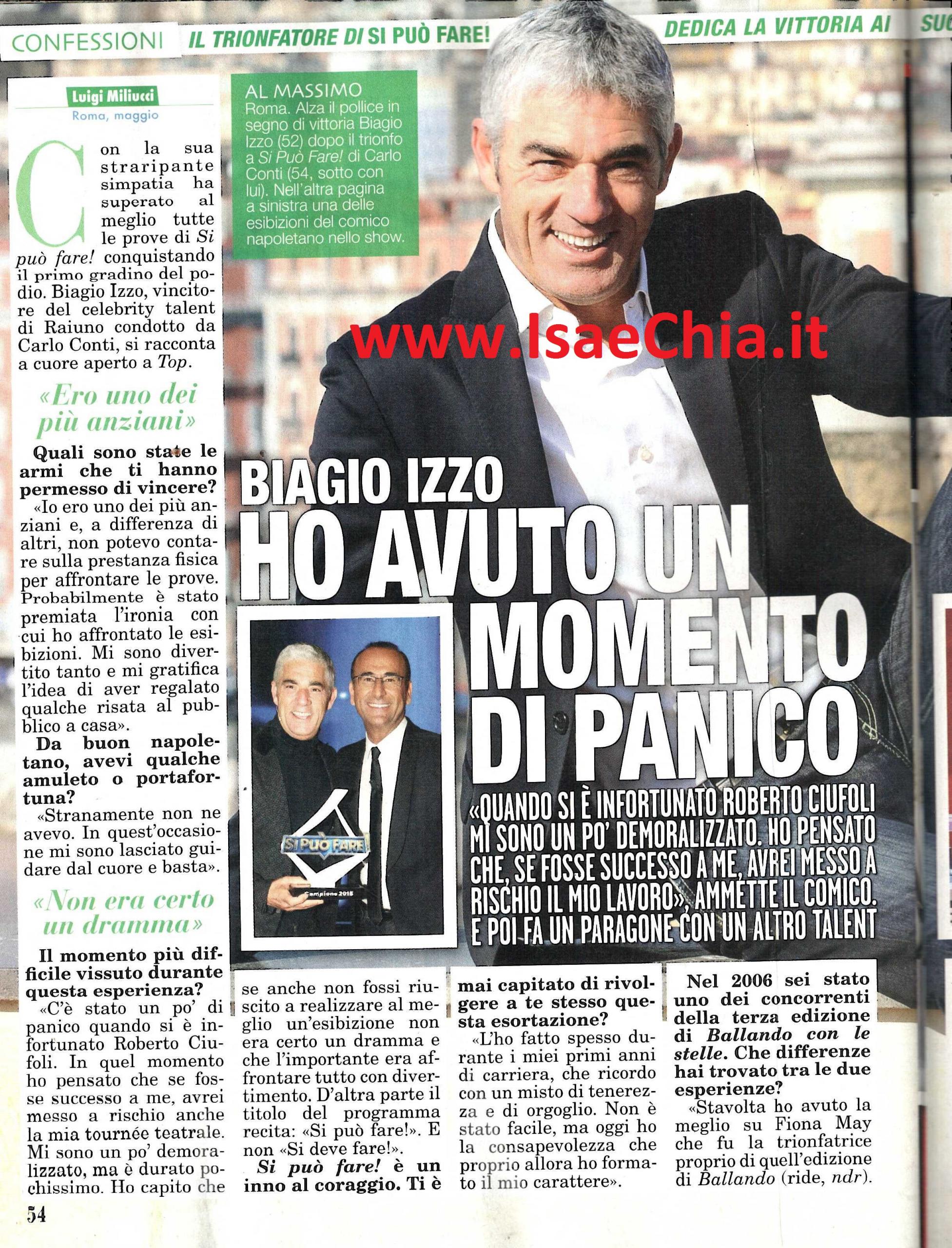 Con la sua straripante simpatia, l’attore Biagio Izzo ha superato al meglio tutte le prove di Si può fare, uscendo vincitore dal programma. Quando gli si chiede quali siano state le armi che gli hanno permesso di vincere, il comico napoletano risponde: “Io ero uno dei più anziani e, a differenza di altri, non potevo contare sulla prestanza fisica. Probabilmente è stata premiata l’ironia con cui ho affrontato le esibizioni. Mi sono divertito tanto e mi gratifica l’idea di aver regalato qualche risata al pubblico“. Quando gli si chiede invece del momento più difficile, risponde: “C’è stato un po’ di panico quando si è infortunato il mio collega Roberto Ciufoli. in quel momento ho pensato che se fosse successo a me, avrei messo a rischio anche la mia tournée teatrale. Mi sono un po’ demoralizzato, ma è durato pochissimo. Ho capito che anche se non fossi riuscito a realizzare al meglio un’esibizione, non era certo un dramma e che l’importante era affrontare tutto con divertimento. D’altra parte il titolo del programma è ‘Si può fare’ e non ‘Si deve fare!’. Mi sono rivolto spesso quest’esortazione nei primi anni della mia carriera, che ricordo con un misto di tenerezza e orgoglio. Non è stato facile, ma oggi ho la consapevolezza che proprio allora ho formato il mio carattere“. Ma per Biagio non è la prima esperienza in un programma simile: nel 2006, infatti, aveva partecipato a Ballando con le stelle, proprio nella stessa edizione in cui vinse Fiona May: “Questa volta, però, ho avuto la meglio su Fiona! Anche in quell’occasione le più grandi soddisfazioni erano i progressi di cui ero protagonista settimana dopo settimana. C’era da faticare parecchio e persi anche molti chili: sia Ballando che Si può fare fanno bene alla salute!“. E adesso, quali progetti lo aspettano? “A breve partirà la mia tournée estiva con serate in tutta Italia, a ottobre sarò nello spettacolo teatrale di Vincenzo Salemme, L’amico del cuore. Chi lo conosce sa che si riderà tanto, ma ci sarà spazio anche per le riflessioni“. Infine, quando gli si chiede dei suoi figli e se lo hanno seguito in tv, lui racconta: “I più piccoli, Raffaele e Martina, facevano le ore piccole davanti alla tv ed è a loro che dedico la mia vittoria: al momento della proclamazione facevano le capriole per la felicità. Quando sono tornato mi hanno detto che sono il loro campione e mi hanno fatto commuovere. Di solito strappo risate agli altri, stavolta ho fatto divertire anche loro. Tutti i miei figli hanno ereditato il mio ‘talento artistico’! La primogenita Alessia è laureata in Regia e produzione televisiva e sta facendo esperienza come assistente alla regia; la seconda, Valeria, vuole diventare attrice e presto reciterà in uno spettacolo diretto proprio dalla sorella. Martina ha 10 anni e vuole fare la ballerina, mentre Raffaele ha 7 anni, è bello come la mamma ed ha un’irresistibile simpatia da scugnizzo napoletano. Ama la musica e l’altro giorno ha fatto un saggio di flauto, che mi ha lasciato a bocca aperta: il suo insegnante mi ha chiesto di averlo con sé in uno spettacolo. Il dna ha trasmesso a tutti l’amore per il mondo artistico!“