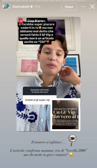 Non andrò al Grande Fratello Vip. Mia mamma mi ha mandato questa notizia estrapolata da Chi in cui Signorini dice: “Bianca Balti farà il Grande Fratello Vip“. No, non faro il Grande Fratello Vip, tra l’altro Signorini che partecipa direttamente e attivamente sia a Chi che al Grande Fratello Vip, sa benissimo che non è vero, mi fa piacere. Grazie Signorini, vuol dire che probabilmente creo hype se bisogna creare questa falsa notizia, perché di sicuro non… cioè non mi è neanche stato chiesto fra l’altro, ma comunque non chiedetemelo perché ho altro da fare, grazie!