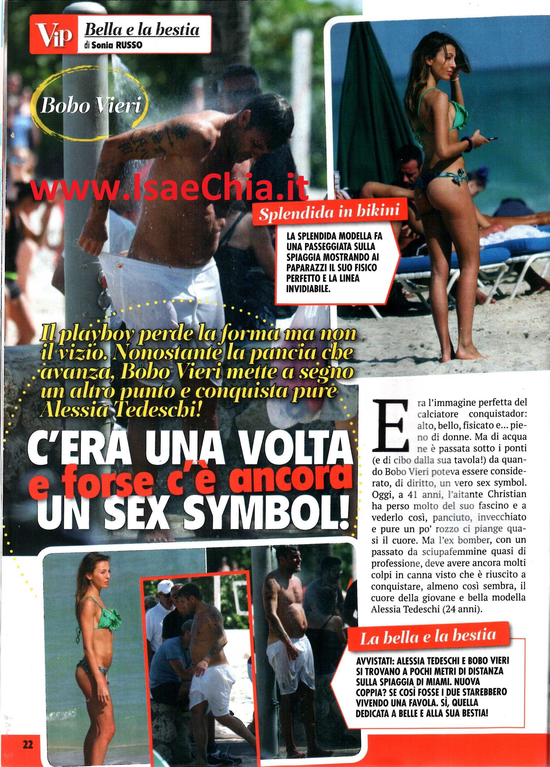 Da queste foto, si stenterebbe a riconoscerlo, eppure si tratta di Bobo Vieri. Il calciatore era l’immagine del conquistatore: bello, alto, fisicato e pieno di donne! Ma da quando ha smesso di giocare (e di ballare, dopo la partecipazione a Ballando con le stelle), pare che Bobo si sia lasciato andare e oggi, a 41 anni, non appare più in forma smagliante. Panciuto, un po’ rozzo con un costume da bagno extra-large, ci fa un po’ piangere il cuore al ricordo delle sue storie con le ex Veline Elisabetta Canalis e Melissa Satta. Eppure, non ha perso il suo sex-appeal: avvistata a pochi metri da lui, sulla stessa spiaggia a Miami, c’è la bella modella 24enne Alessia Tedeschi. Nel 2013 lei è stata protagonista di un brutto incidente, nel quale era presene anche la Canalis: è finita tra le eliche di un tender su cui viaggiava e ancora oggi si nota la cicatrice sulla schiena. Il fotografo la riprende mentre lega i capelli e si stende a prendere il sole, mentre Bobo si rinfresca con una doccia all’aperta. Mentre lei mantiene la sensualità anche sulla sabbia bollente, lui fa delle facce e delle mosse…animalesche!