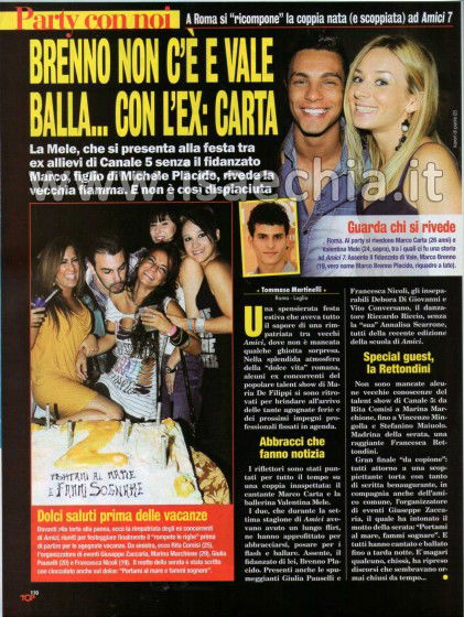 Una trama degna di Beautiful quella creata ad arte dai giornalisti di Top, che non hanno perso occasione per ricomporre la coppia scoppiata di Amici 7: il caso però vuole che, mentre il sex symbol Marco Carta sia single, Valentina Mele sia felicemente fidanzata con Brenno Placido, figlio di Michele, che non sarà contento di passare perennemente per il cornuto di turno.