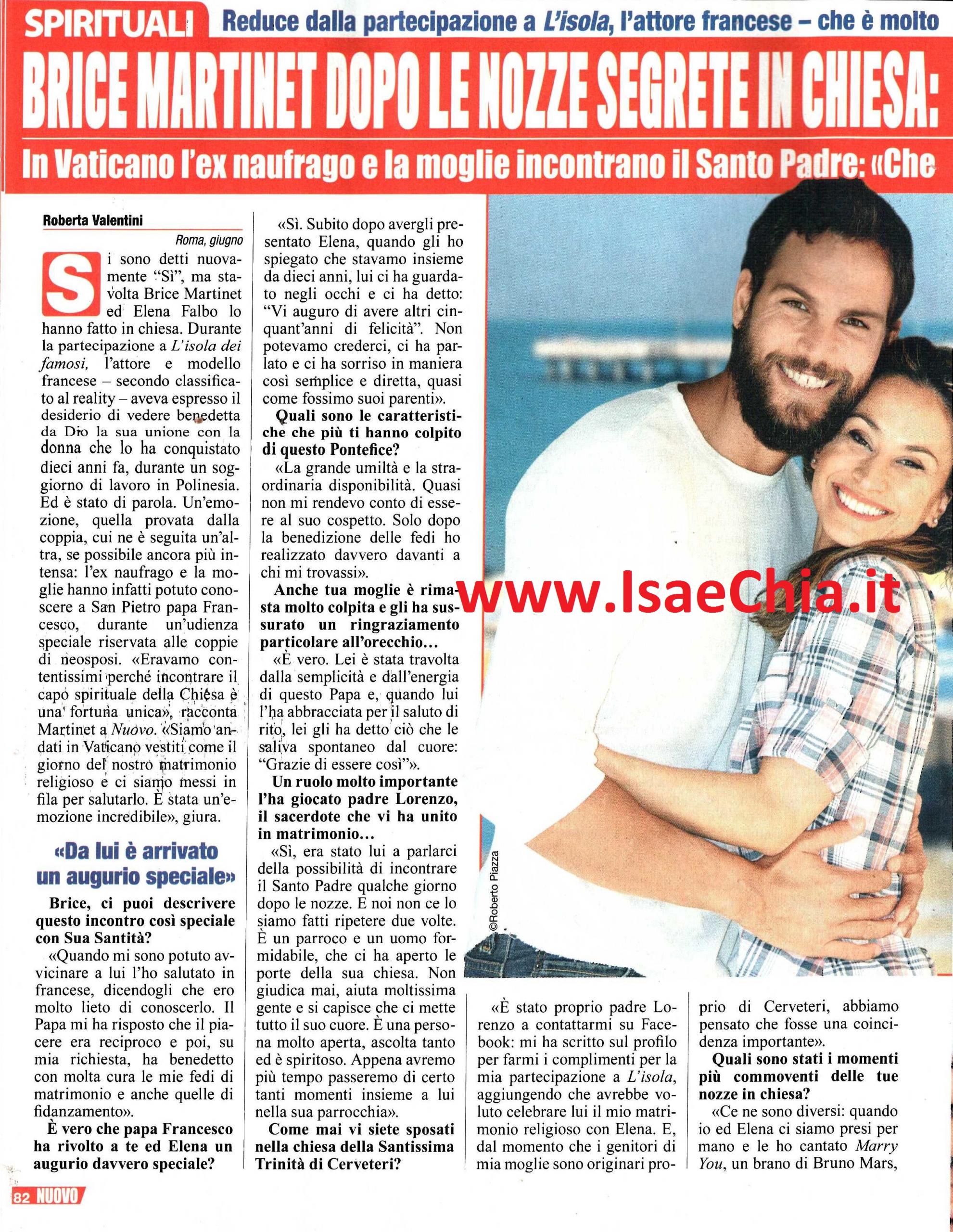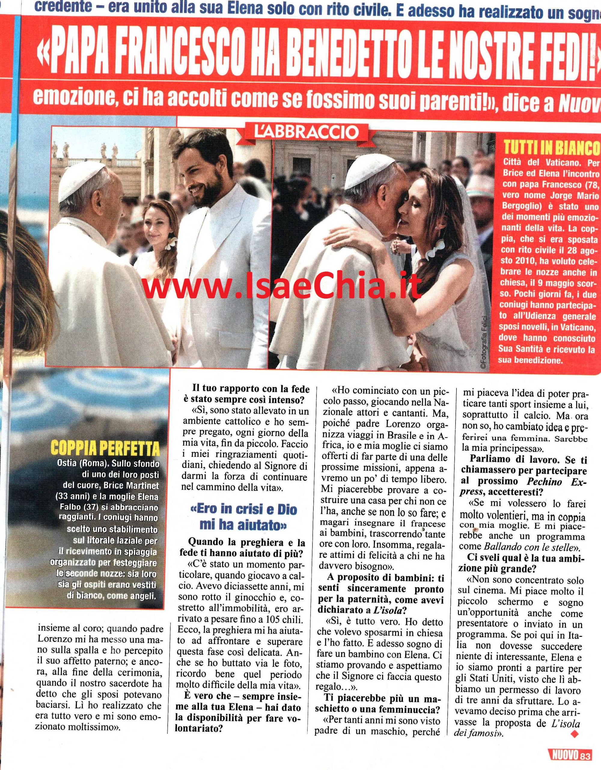 Durante l’Isola dei famosi 10, il modello e attore francese Brice Martinet aveva promesso che avrebbe sposato con cerimonia religiosa la sua Elena Falbo, che aveva conosciuto durante una vacanza in Polinesia. Ed hanno mantenuto la promessa. Ma soprattutto, i due hanno fatto benedire la loro unione anche da Papa Francesco I durante un’udienza speciale per le coppie di neosposi: “Eravamo contentissimi perché incontrare il capo spirituale della Chiesa è un’emozione unica. Siamo andati lì vestiti con gli stessi abiti del matrimonio e abbiamo fatto la fila per salutarlo. Quando mi sono avvicinato a lui, l’ho salutato in francese e gli ho detto che ero felice di conoscerlo. Mi ha risposto che il piacere era reciproco e, in seguito alla mia richiesta, ha benedetto le nostre fedi nuziali e di fidanzamento. Dopo avergli presentato Elena, dicendogli che stiamo insieme da dieci anni, ci ha augurato altri 50 anni di felicità. Ci ha parlato e sorriso in modo così semplice e diretto, come se fossimo parenti. Mi hanno colpito la sua umiltà e la sua disponibilità. Mia moglie è rimasta colpita dalla semplicità e dall’energia di questo Papa e quando lui l’ha abbracciata, gli ha detto ciò che le è venuto spontaneo: ‘Grazie per essere così’. Era stato padre Lorenzo, il sacerdote che ci ha uniti in matrimonio, a parlarci della possibilità di incontrare il Papa e noi non ce lo siamo fatti ripetere due volte. Ci siamo sposati nella Chiesa della SS. Trinità di Cerveteri perché padre Lorenzo mi aveva contattato su Facebook e mi ha riempito di complimenti per la mia partecipazione all’Isola, aggiungendo che avrebbe voluto celebrare il nostro matrimonio. E dal momento che i genitori di Elena sono originari proprio di Cerveteri, abbiamo pensato che fosse una bella coincidenza“. Quando gli si chiede dei momenti più belli della celebrazione, Brice risponde: “Ce ne sono tanti, come quando le ho cantato Marry you di Bruno Mars. Sono stato cresciuto in un ambiente cattolico e la fede mi è stata d’aiuto in un periodo difficile della mia vita. Quando mi sono rotto il ginocchio, ero costretto a letto e sono arrivato a pesare 105 chili, la preghiera mi ha aiutato. Don Lorenzo organizza missioni in Africa e in Brasile e noi ci siamo proposti per aiutare: mi piacerebbe insegnare a costruire una casa a chi non lo sa fare, o insegnare francese ai bambini“. E, a proposito di bambini, quando gli si chiede se ora lui e Elena sono pronti ad averne uno, confessa: “Sì, sono pronto. Ho detto che volevo sposarmi in chiesa e l’ho fatto. Adesso voglio un bambino da Elena. Ci stiamo provando e speriamo che il Signore ci faccia questo regalo. Per tanti anni mi sono visto padre di un maschietto a cui insegnare a giocare a calcio, ma ora ho cambiato idea e preferirei una femmina: sarebbe la mia principessa”. E sul lavoro? “Se mi chiamassero per il prossimo Pechino Express direi di sì, ma solo in coppia con mia moglie! Mi piacerebbe anche un programma come Ballando con le stelle. Non sono concentrato molto sul cinema. Mi piace molto il piccolo schermo e sogno il ruolo di presentatore o inviato. Se in Italia non dovessi trovare niente di interessante, siamo pronti per gli Stati Uniti!“.