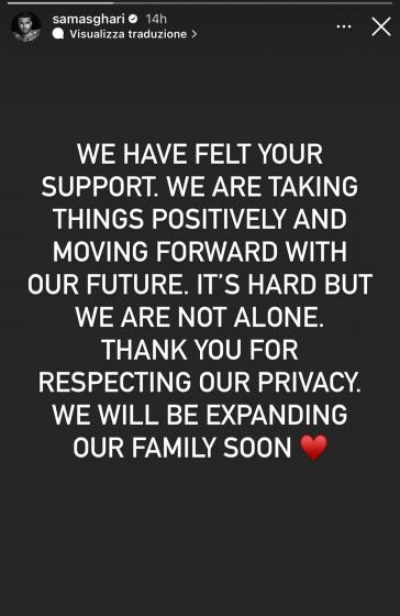 Abbiamo sentito il vostro sostegno. Stiamo prendendo positivamente le cose e andiamo avanti con il nostro futuro. È difficile ma non siamo soli. Grazie per rispettare la nostra privacy. Espanderemo la nostra famiglia presto.