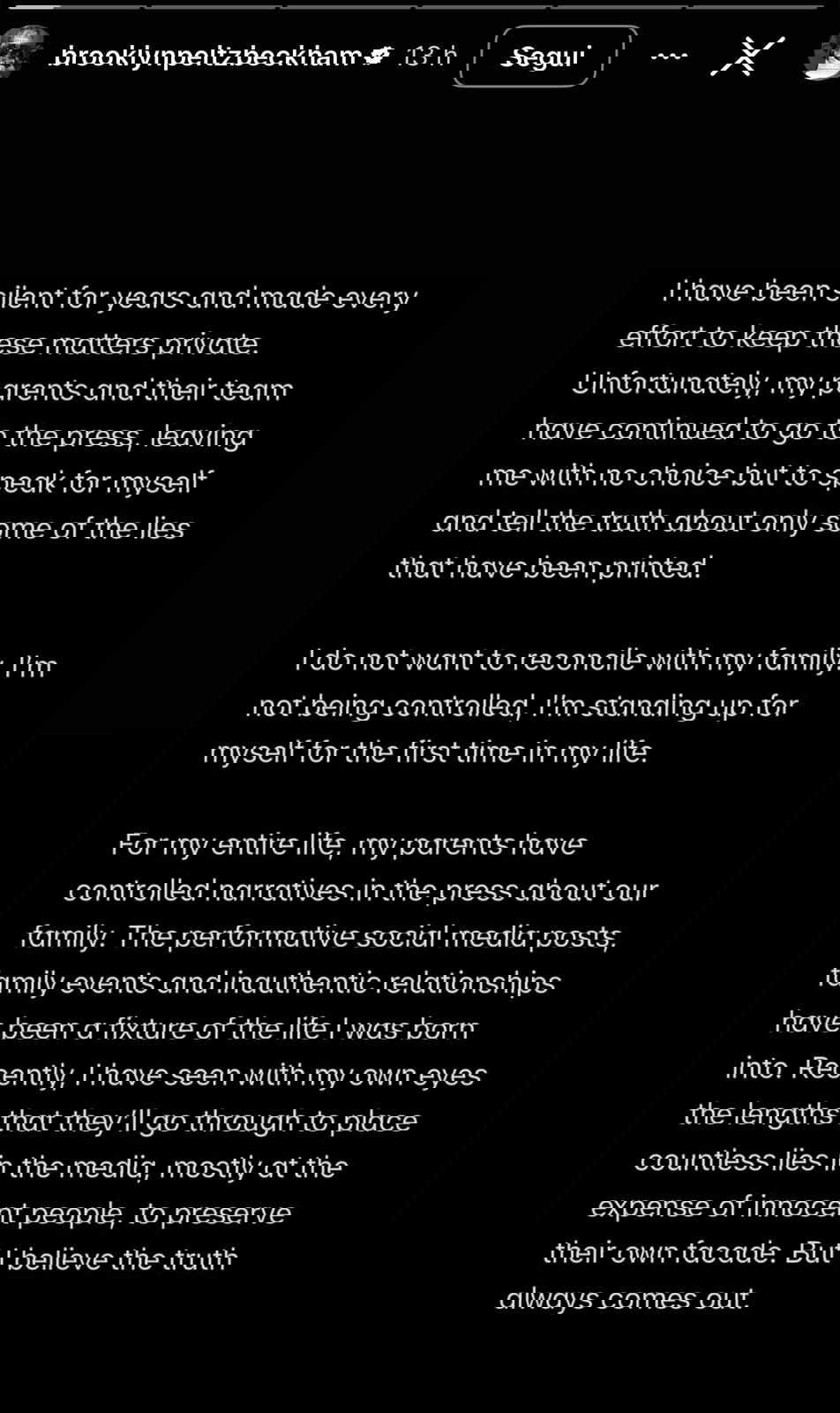 Purtroppo i miei genitori e il loro team hanno continuato a rivolgersi alla stampa, lasciandomi senza altra scelta se non quella di parlare per me stesso e raccontare la verità su alcune delle bugie che sono state pubblicate. Non voglio riconciliarmi con la mia famiglia. Non sono controllato, mi sto difendendo da solo per la prima volta nella mia vita. Per tutta la mia vita, i miei genitori hanno controllato la narrazione sulla nostra famiglia nei media. I post sui social studiati a tavolino, gli eventi familiari e le relazioni non autentiche sono sempre stati una costante della vita in cui sono nato. Di recente ho visto con i miei occhi fino a che punto sono disposti a spingersi pur di piazzare innumerevoli bugie sui media, spesso a spese di persone innocenti, per preservare la loro facciata. Ma credo che la verità venga sempre a galla.