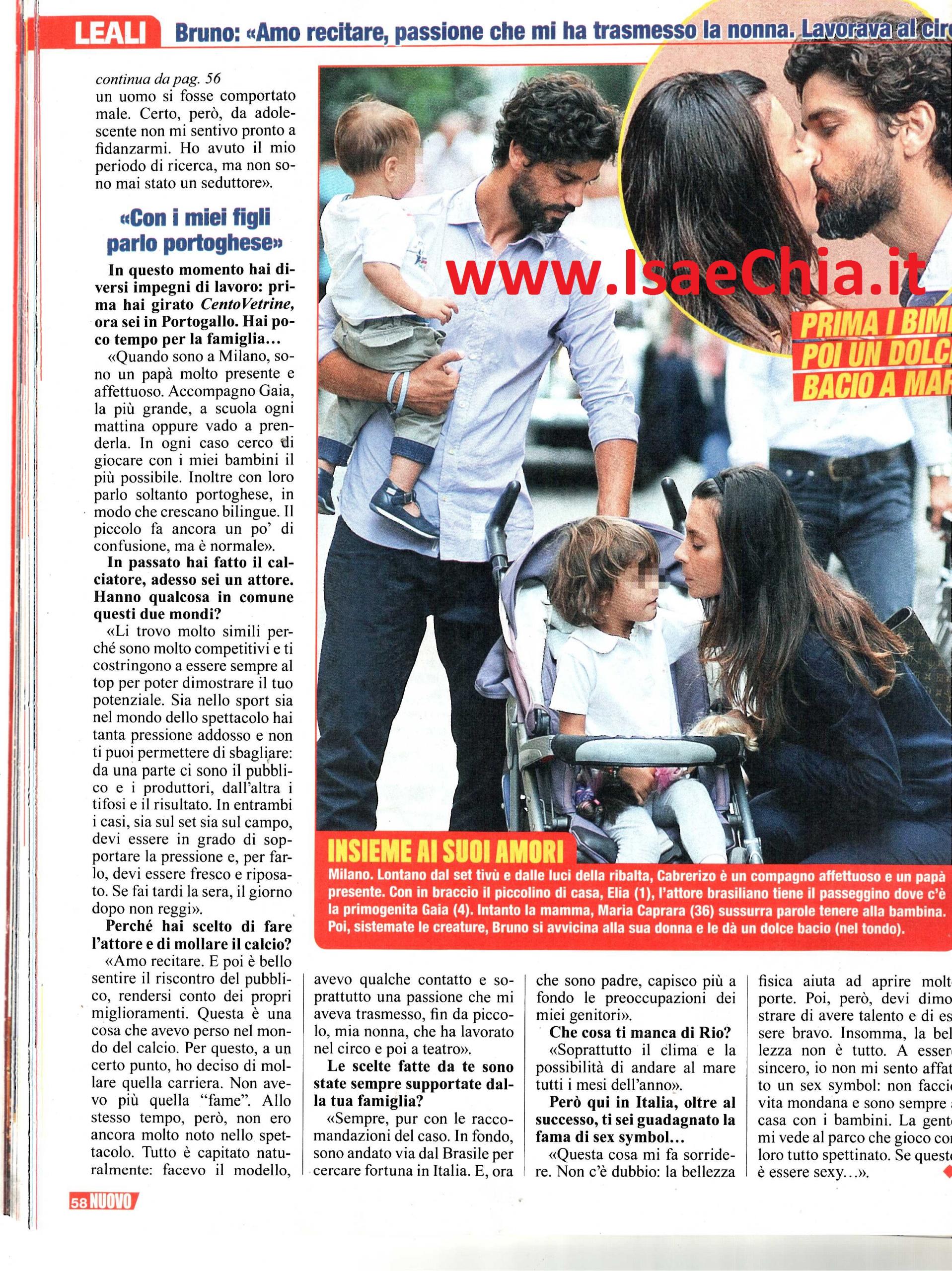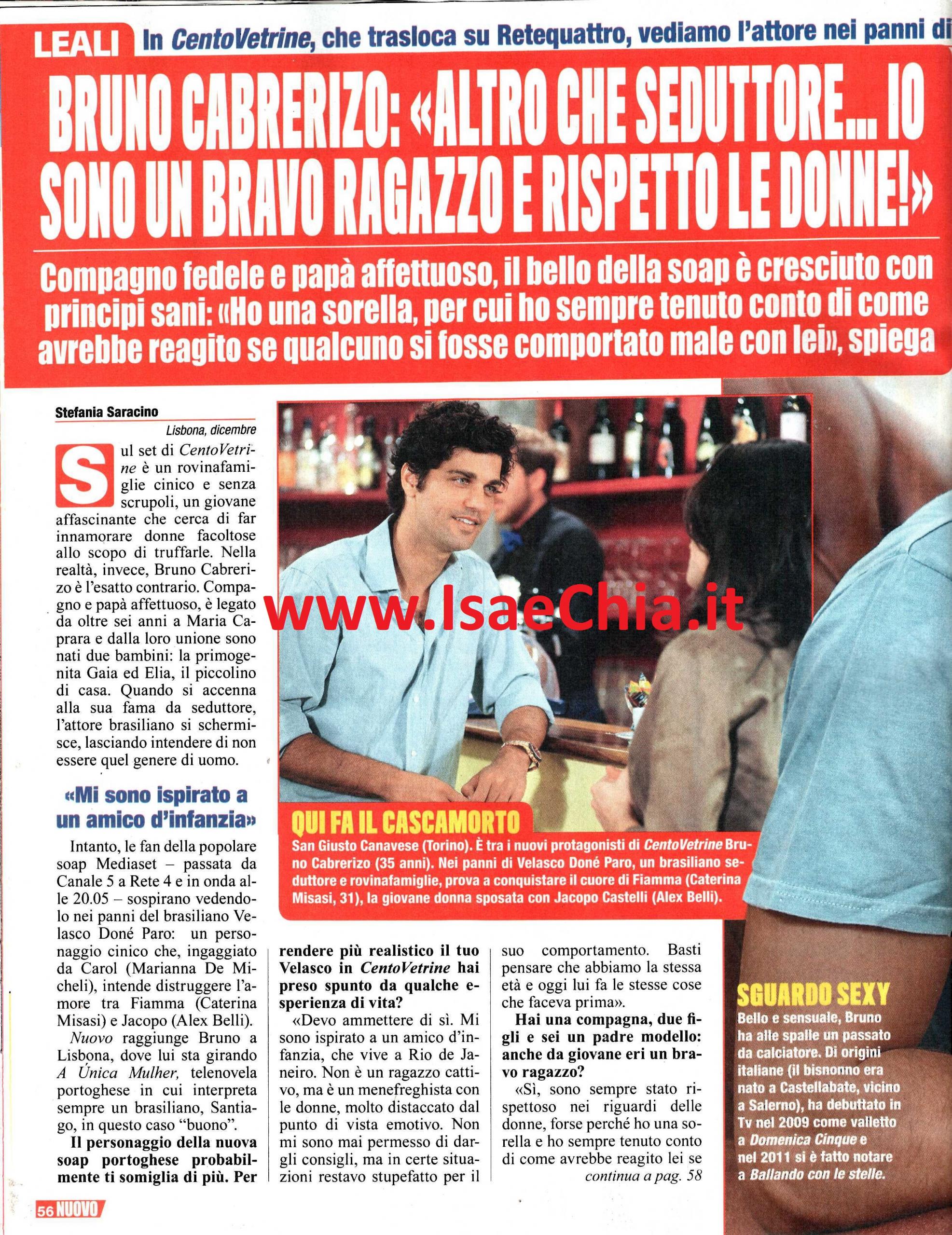 Nella soap Centovetrine, Bruno Cabrerizo interpreta un cinico rovinafamiglie senza scrupoli, un giovane che cerca di far innamorare donne facoltose per truffarle. Nella realtà, è legato alla sua donna, Maria Caprara, da sei anni e da lei ha avuto due figli: Gaia ed Elia. Il personaggio della fiction che sta girando a Lisbona, A unica mulher, forse, il buon brasiliano Santiago, gli somiglia decisamente di più: “Devo ammettere di sì. Per interpretare Velasco in Centovetrine mi sono ispirato ad un amico d’infanzia che vive a Rio De Janeiro; non è cattivo, ma è uno menefreghista con le donne, molto distaccato dal punto di vista emotivo. In certe situazioni rimanevo stupefatto per il suo comportamento. Abbiamo la stessa età e lui fa le stesse cose che faceva prima! Anche da giovane io sono sempre stato rispettoso nei confronti delle donne, forse perché ho una sorella e ho sempre tenuto conto di come avrebbe reagito lei se un uomo si fosse comportato male. Quando sono a Milano, sono un papà affettuoso, vado a prendere Gaia a scuola e cerco di giocare con i piccoli il più possibile. Con loro parlo solo portoghese, in modo che imparino due lingue” rivela lui. Bruno, in realtà, ha iniziato come calciatore e ha dimostrato la sua sportività anche nel programma Jump! e a Ballando con le stelle, dove è arrivato fino in finale. Quando gli si chiede della differenza tra fare lo sportivo e fare l’attore, risponde: “Sono simili perché due mondi competitivi, che ti spingono a dare il top. In entrambi i casi hai tanta pressione addosso, non puoi permetterti di sbagliare. Per sopportare la pressione devi riposare, se fai tardi la sera, il giorno dopo non reggi. Amo recitare, è bello sentire il riscontro del pubblico, rendersi conto dei propri miglioramenti. Questa è una cosa che avevo perso nel mondo del calcio, perciò ho deciso di lasciare quella carriera. Tutto è capitato molto naturalmente: facevo anche il modello, avevo qualche contatto e soprattutto avevo la passione che mi aveva trasmesso mia nonna, che lavorava al circo e al teatro. Le mie scelte sono sempre state supportate dalla mia famiglia. In fondo, sono andato via dal Brasile per cercare fortuna in Italia, e oggi, da padre, capisco più a fondo le preoccupazioni dei miei genitori“. E in Italia, in effetti, si è guadagnato la fama di sex symbol…”Questa cosa mi fa sorridere. Non c’è dubbio: la bellezza fisica apre molte porte. Poi, però, devi dimostrare di avere talento ed essere bravo. Non mi sento affatto un sex symbol, non faccio vita mondana e sono sempre a casa con i bambini. La gente mi vede al parco giochi tutto spettinato. Se questo è essere sexy…“