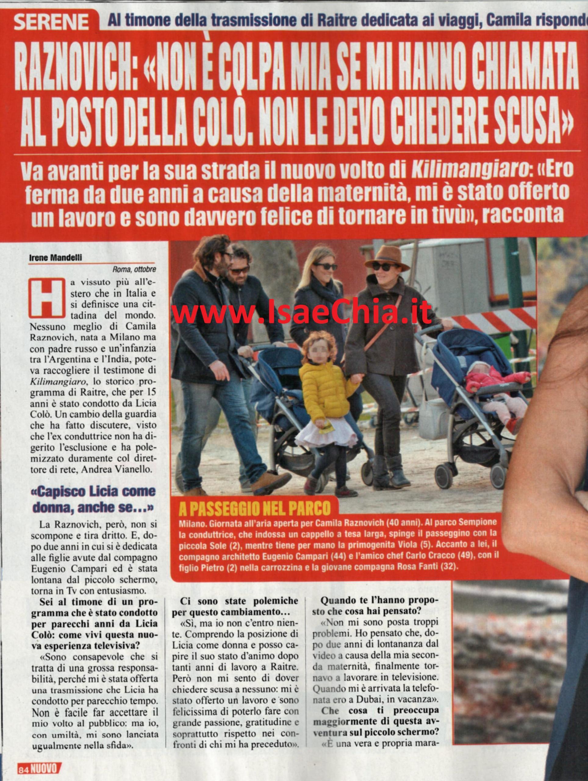 Nessuno più di Camila Raznovich, che ha vissuto più in giro per il mondo che in Italia e si definisce “cittadina del mondo” poteva essere adatta a condurre Kilimangiaro, il programma sui viaggi di Raitre che per 15 anni è stato condotto da Licia Colò. “Sono consapevole che si tratta di una grande responsabilità, perché mi è stata offerta una trasmissione che Licia ha condotto per molto tempo. Non è facile far accettare il mio volto al pubblico, ma mi sono buttata comunque. Ci sono state polemiche per questo cambiamento, ma io non c’entro niente. Comprendo la posizione della Colò come donna e il suo stato d’animo dopo tanti anni di lavoro su Raitre, però non mi sento di dover chiedere scusa a nessuno: mi è stato offerto un lavoro e sono contenta di poterlo fare con grande passione e soprattutto con gratitudine verso chi mi ha preceduta. Quando sono stata contattata, ero a Dubai e ho pensato che, dopo due anni d’assenza dal video a causa della mia seconda maternità, finalmente tornavo in tv. Cosa mi preoccupa? E’ una vera e propria maratona: sarò in onda per 4 ore di fila per ben 25 domeniche di fila. Gli ascolti sono importanti, ma stiamo puntando sulla qualità e a me interessa fare un buon prodotto. La concorrenza è agguerrita, ma proponiamo una domenica pomeriggio diversa dagli altri e questo è il nostro punto di forza”. Quando le si fa notare che forse, grazie a lei, Kilimangiaro sarà guardato da un pubblico più giovane, risponde: “Credo di sì. Il fatto di avermi chiamata indica il cambiamento di target, visto che il mio pubblico è composto essenzialmente da giovani”. Infine, spiega come farà combaciare lavoro e famiglia: “Mi ritengo privilegiata perché durante la settimana posso stare con le bimbe ed è importante che la domenica stiano solo con il padre. Da Milano mi sono trasferita a Roma, dove c’è la redazione del programma; nel week-end il padre si sposta da Milano alla Capitale, mentre io vado a Napoli per registrare. Le mie bambine amano viaggiare come me e spero che crescano come me: i miei mi hanno cresciuta in India per i primi 10 anni e non vedo l’ora di portarci anche loro”.