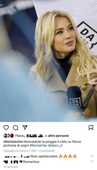 Qualche giorno fa poi era stata la Leotta a postare una foto poco dopo la partita Roma-Inter con la scritta “Nonostante la pioggia il cielo su Roma profuma di sogni”: