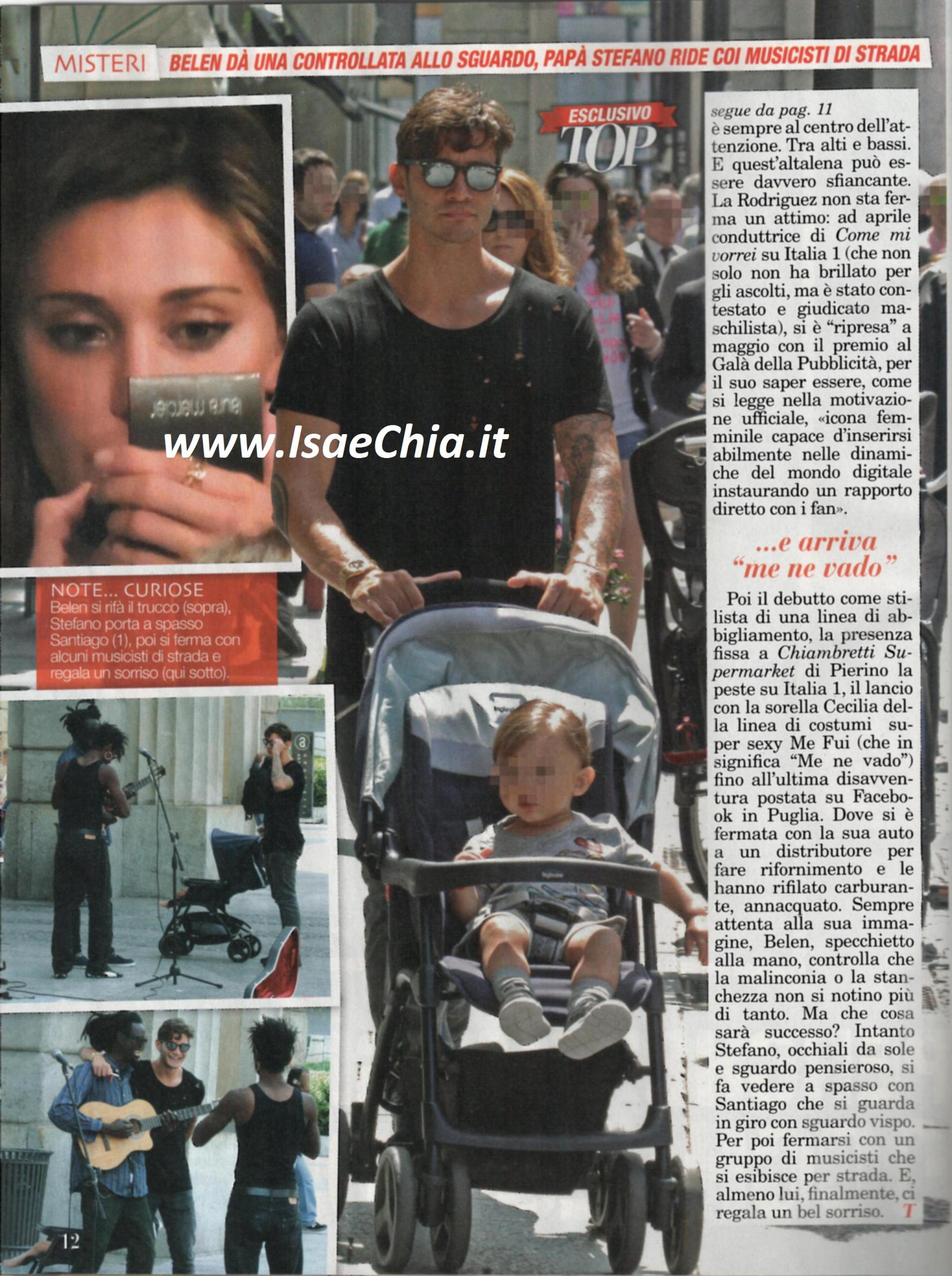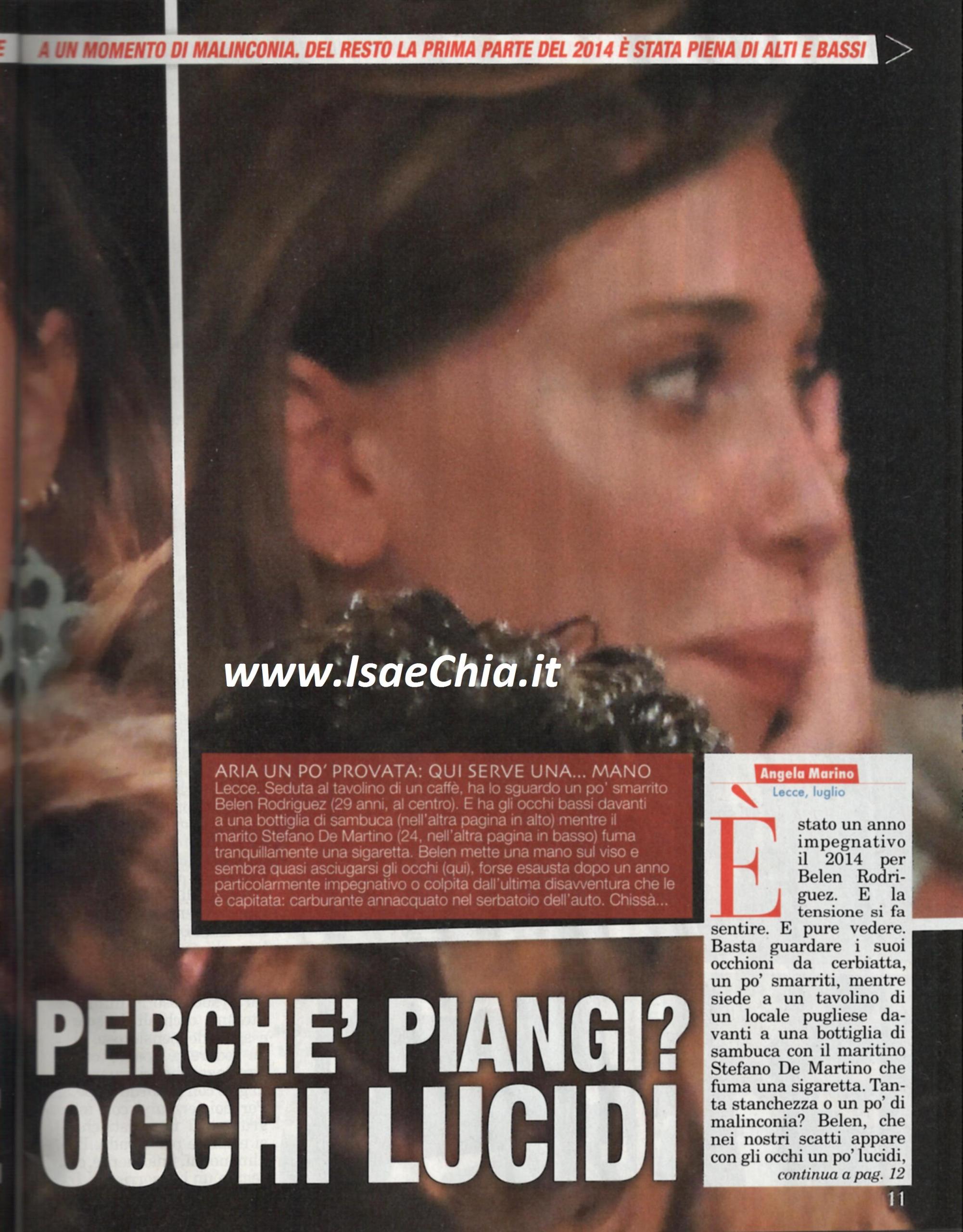 Il 2014 è stato un anno impegnativo e difficile per Belén Rodriguez e la stanchezza si fa sentire. Basta vedere i suoi occhioni da cerbiatta, lucidi e smarriti, mentre siede ad un tavolino di un bar di Lecce insieme a suo marito Stefano De Martino. Davanti ad una bottiglia di sambuca, lui fuma una sigaretta tranquillo, mentre lei appare stanca e triste. Dopo il flop di Come mi vorrei, che non solo non ha brillato per ascolti, ma è stato anche giudicato maschilista, Belén si è ripresa grazie al Galà della pubblicità, al quale è stata premiata per essere “un’icona femminile capace di inserirsi nelle dinamiche del mondo digitale, instaurando un rapporto diretto con i fan”. A seguire, il debutto con la sua linea di abbigliamento e la presenza fissa al Chiambretti Supermarket. Infine, il lancio dei costumi da bagno Me fui con sua sorella Cecilia e, ultima in ordine cronologico, la disavventura in Puglia: fermatasi ad un distributore per fare rifornimento, le hanno dato il carburante annacquato ed è rimasta a piedi. Dopo un po’, Belen apre lo specchietto e si rifà il trucco, pronta a scacciar via la malinconia. Stefano, invece, prende il piccolo Santiago e lo porta in giro; si ferma con un gruppo di musicisti per strada e, almeno lui, ci regala un sorriso!