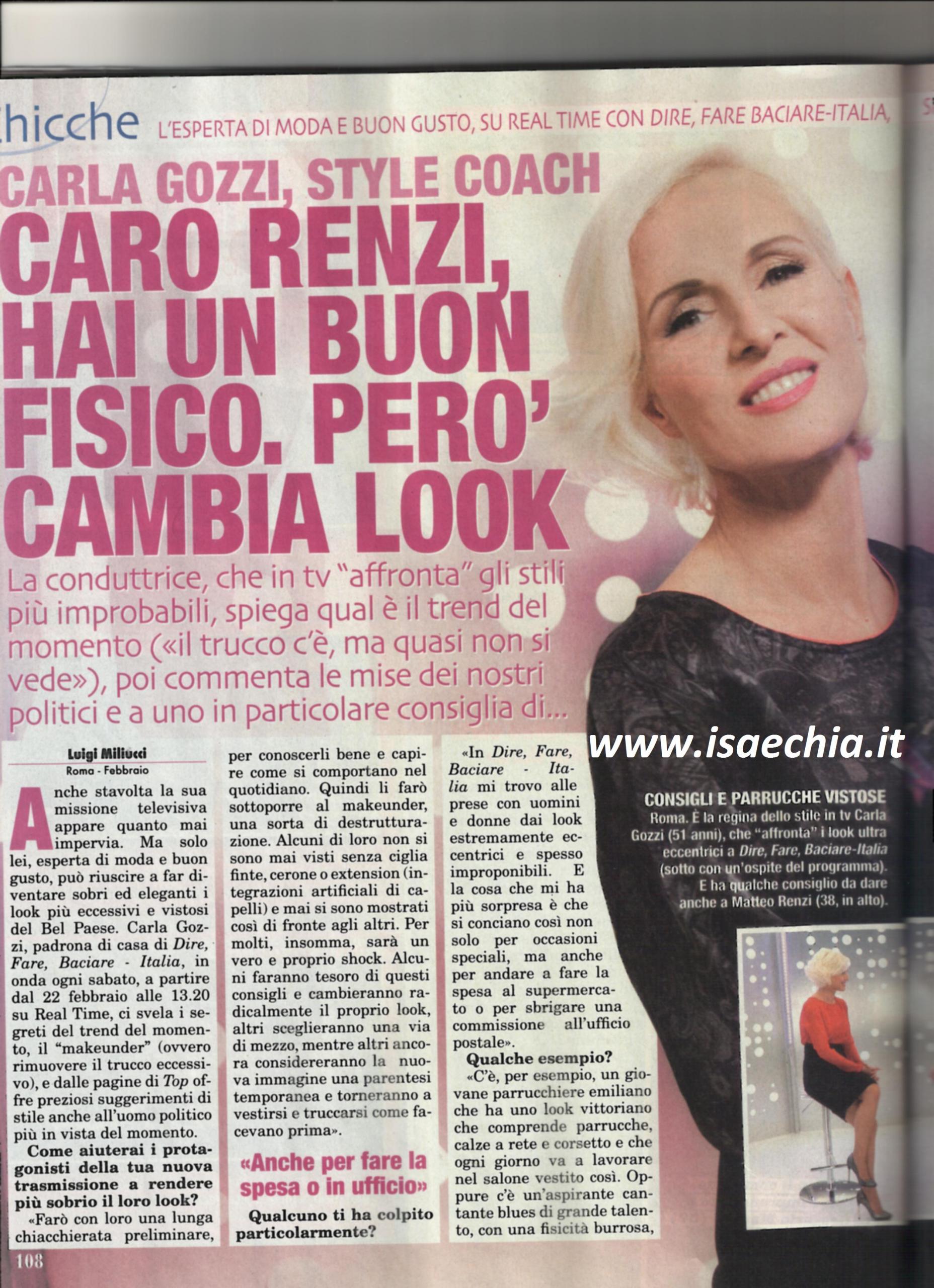 Carla Gozzi, padrona di casa di Dire, fare, baciare su Real Time, parla del suo programma che mira a “togliere il trucco”: “Farò con loro una lunga chiacchierata per conoscerli bene. Poi li sottoporrò a un makeunder, una sorta di destrutturazione: alcuni non si sono mai visti senza cerone e ciglia finte. Alcuni cambieranno look, altri lo fanno solo temporaneamente, altri trovano vie di mezzo. Ci sono uomini e donne con look improponibili ed eccentrici, che usano anche quando vanno a fare la spesa, tra cui un parrucchiere emiliano che ha un look vittoriano, incluse parrucche e calze e va anche a lavoro così. Caricare troppo il look trasformandosi in macchiette non va di moda, anche per quanto riguarda il trucco si tende a coprire meno la pelle. Chi continua a farlo, si nasconde dietro una vera e propria corazza”. Poi, quando le si chiede se in Italia sono sempre i politici quelli che si vestono peggio, la style coach risponde: “Che tragedia! Ogni volta che li vedo in tv mi preoccupo: loro rappresentano il made in Italy all’estero! Confido molto in Matteo Renzi: è giovane e ha un buon fisico, ma può far di meglio. E’ un ex sportivo, un uomo dinamico, quindi non lo vedrei con abiti classici, ma con dei completi tipo principe di Galles, tre bottoni, pochette a giorno e gemelli: uno stile trasandato chic”.