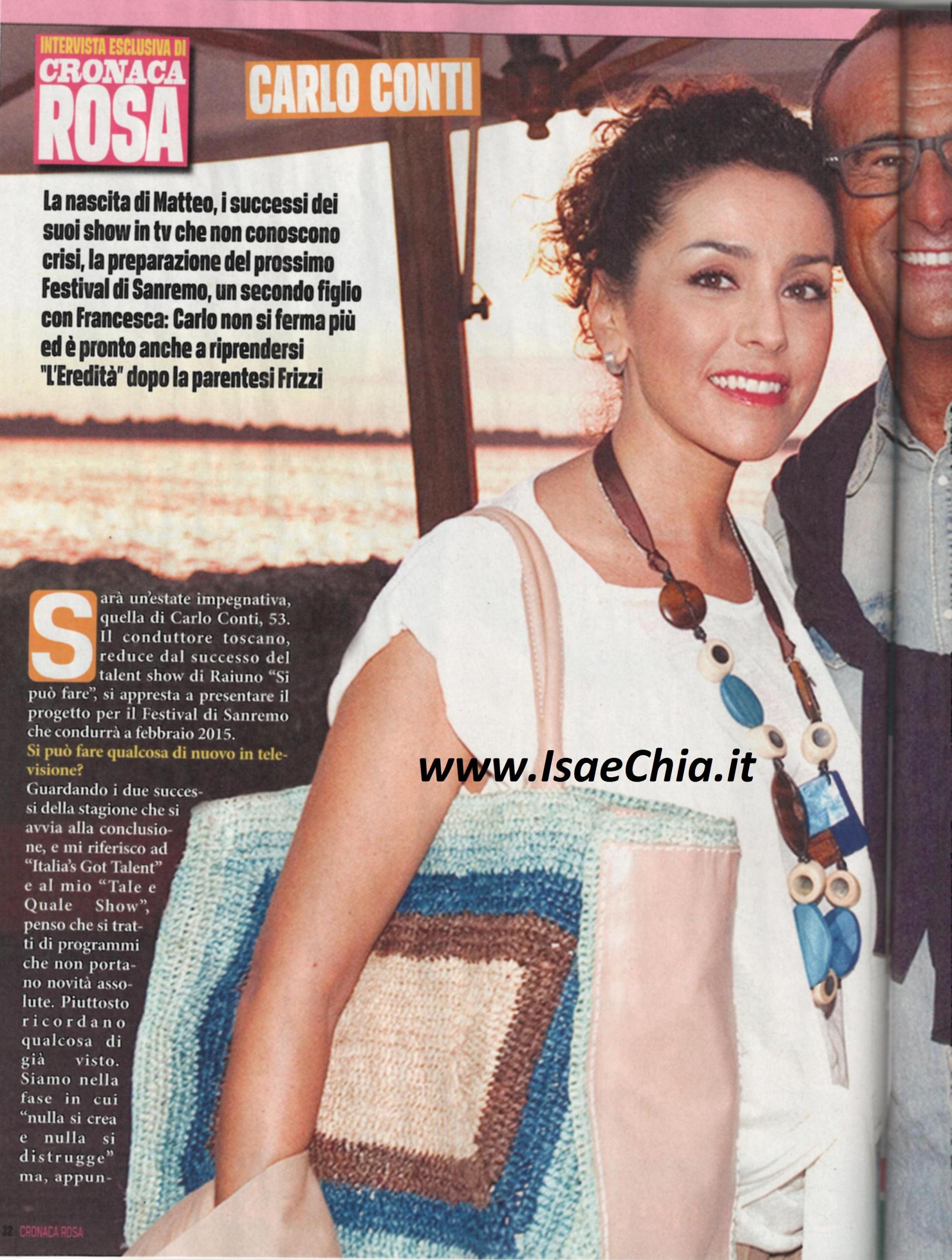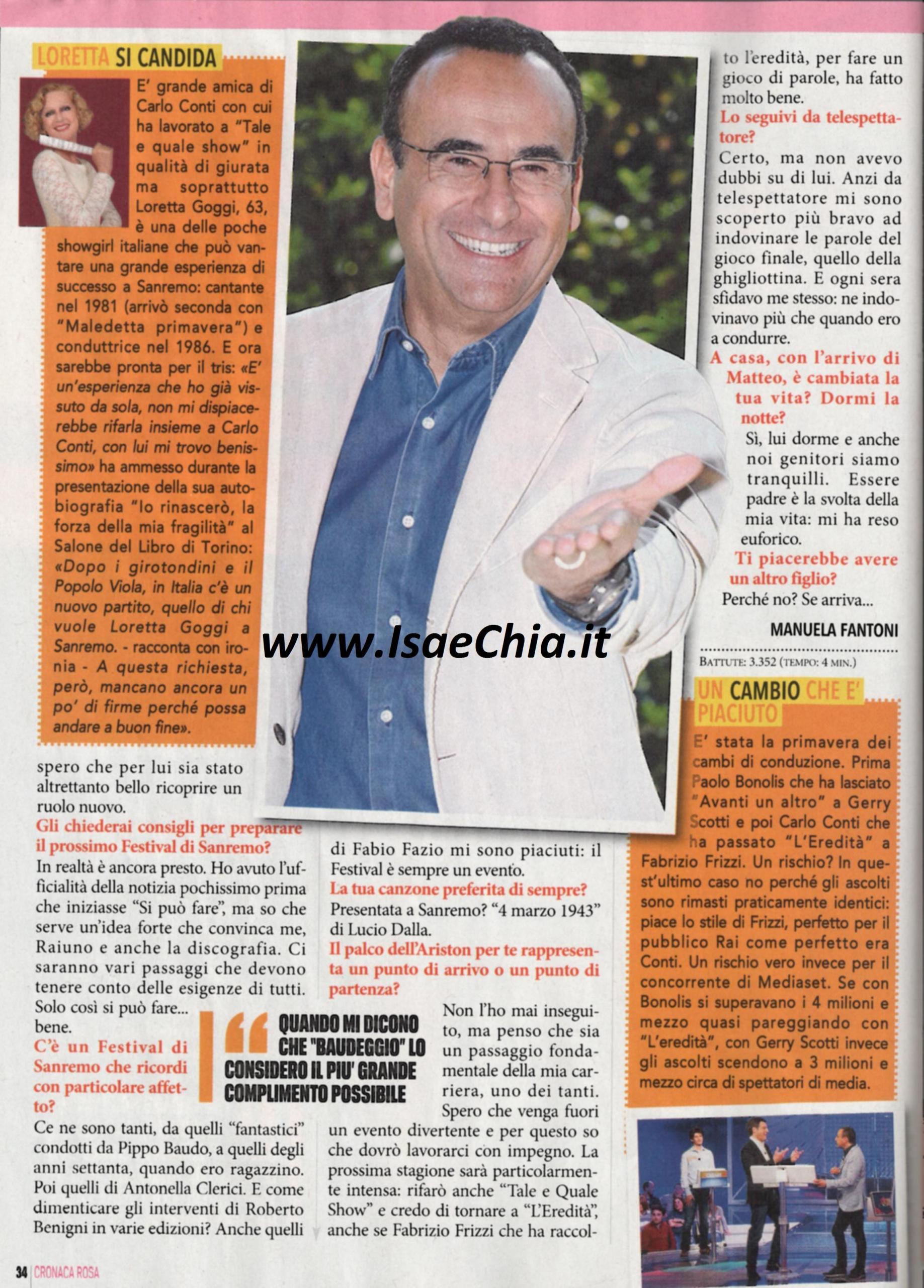 Sarà Carlo Conti a condurre il Festival di Sanremo 2015. Ma nell’attesa dell’evento, il conduttore commenta quest’anno televisivo: “Considerato il successo del mio Tale e quale show e di programmi come Italia’s got talent, direi che si tratta di programmi che non portano novità assolute. Siamo nella fase in cui nulla si crea e nulla si distrugge, ma si trasforma. Noi che facciamo tv dobbiamo esser bravi a recuperare l’idea del passato: Italia’s got talent riprende l’idea de La Corrida, ma con un linguaggio moderno e una giuria. Tale e quale show si ispira a Re per una notte, il programma anni Novanta di Gigi Sabani“. Quando gli si chiede di commentare la presenza di Pippo Baudo nel suo show Si può fare, risponde: “Quando mi si dice che “baudeggio” e che sono il suo erede, lo considero il più grande complimento possibile. E’ stato un onore averlo nel mio programma e spero lo sia stato per lui. Per il festival è ancora presto, ma so che serve un’idea che convinca me, RaiUno e la discografia. Non ho mai inseguito il palco dell’Ariston, ma credo sia uno dei tanti passaggi fondamentali nella mia carriera. Spero che venga fuori un evento divertente e per questo so che dovrò lavorarci con impegno. Sarà una stagione intensa, perché rifarò Tale e quale e forse tornerò a L’eredità“. Infine, qualche parola sul nuovo ruolo di papà: “Matteo dorme e siamo genitori tranquilli. Essere padre è la svolta della mia vita: sono euforico. Un altro figlio? Se viene…!”