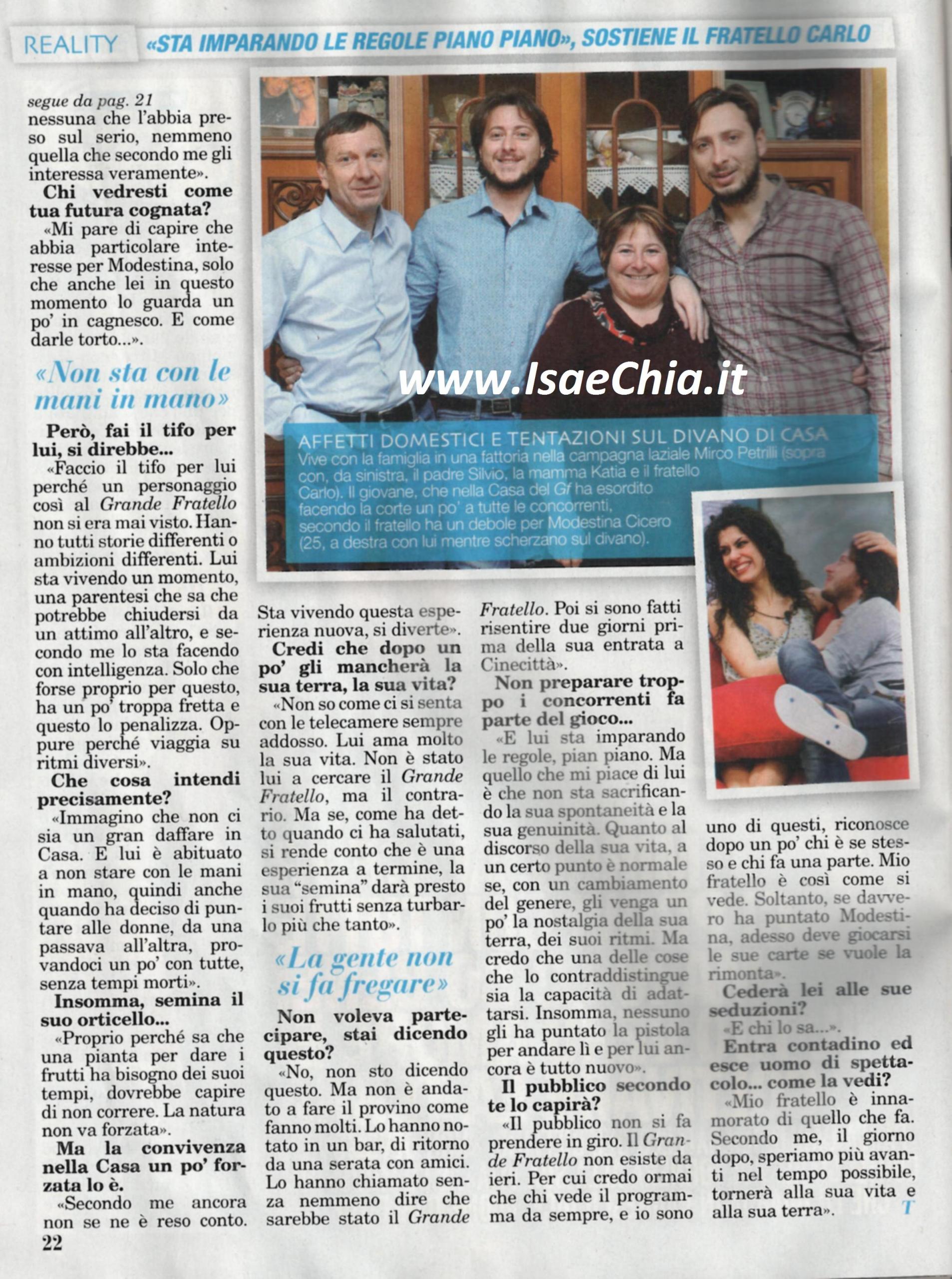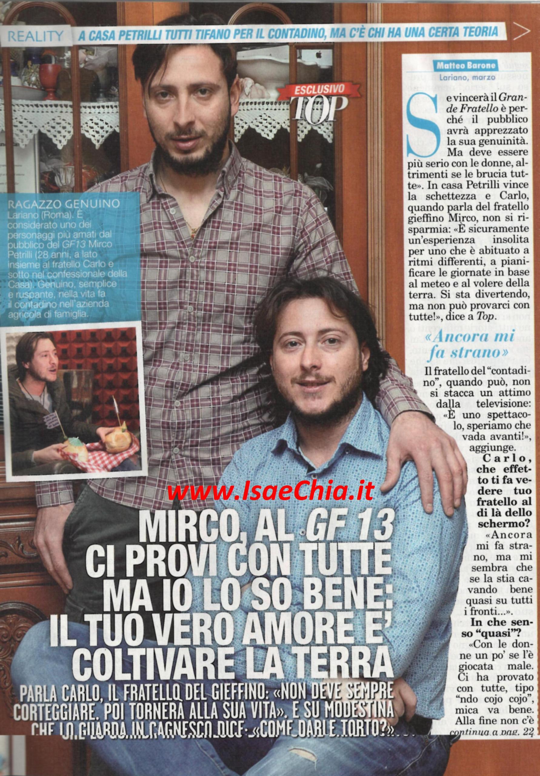Mirco Petrilli, il contadino laziale del Grande fratello 13, ha colpito il pubblico per la sua genuinità. Mentre lui continua il suo percorso nella Casa, suo fratello Carlo dichiara: “Mi fa ancora strano vederlo in tv, ma mi pare che se la stia cavando bene su tutti i fronti. Con le donne, però, se l’è giocata male: ci ha provato un po’ “ndò cojo cojo”e così nessuna l’ha preso sul serio. Mi pare di capire che ha più interesse per Modestina Cicero, ma lei in questo momento lo guarda un po’ in cagnesco. Faccio il tifo per lui perché un personaggio così non si era mai visto al GF. Sta vivendo al momento una parentesi che potrebbe chiudersi da un momento all’altro, solo che forse proprio per questo lo sta facendo con troppa fretta. Non è abituato a stare con le mani in mano e quindi ha deciso di puntare alle donne, da una passava all’altra, senza tempi morti. Mirco non è andato a fare il provino come tanti altri, lo hanno pescato loro in un bar. Lo hanno chiamato senza nemmeno dire che erano del Grande fratello e poi si sono fatti risentire due giorni prima del programma. Avrà nostalgia della sua terra e delle sue abitudini, ma sa adattarsi. Il pubblico non si fa prendere in giro e riconosce chi è se stesso e chi fa una parte. Mio fratello è così come si vede. Solo che, se davvero ha puntato a Modestina, deve giocarsi le sue carte…”