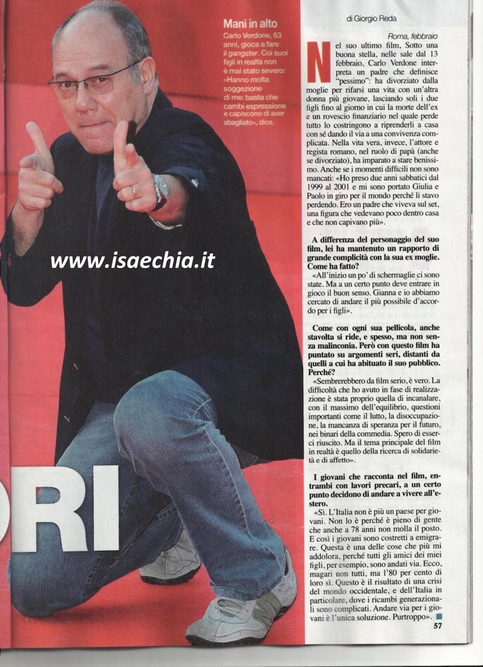 Dopo l’incredibile successo di La grande bellezza, Carlo Verdone torna con un altro film, Sotto una buona stella, con Paola Cortellesi, dove interpreta un padre “pessimo”, che abbandona i propri figli per una donna più giovane, finché la morte dell’ex moglie e un rovescio finanziario lo costringono a riprenderli in casa. A proposito del suo ruolo di padre, Verdone rivela: “Dal 1999 al 2001 mi sono preso due anni sabbatici, in cui ho portato i miei figli Paolo e Giulia per il mondo, perché li stavo perdendo: ero un padre che viveva sul set, una figura che vedevano poco dentro casa e non capivano più. All’inizio ci sono state schermaglie con la mia ex moglie, ma poi io e Gianna abbiamo cercato di andare il più possibile d’accordo per i figli. La difficoltà che ho avuto in questo film è stato incanalare questioni importanti come il lutto e la disoccupazione nei canali della commedia. I giovani nel film, con lavori precari, decidono di lavorare all’estero: l’Italia non è più un Paese per i giovani: gente di 78 anni non lascia il lavoro e i giovani sono costretti a emigrare. Questa è una delle cose che più mi addolora, perché l’80% dei figli dei miei amici è andato via: è l’unica soluzione, purtroppo”.