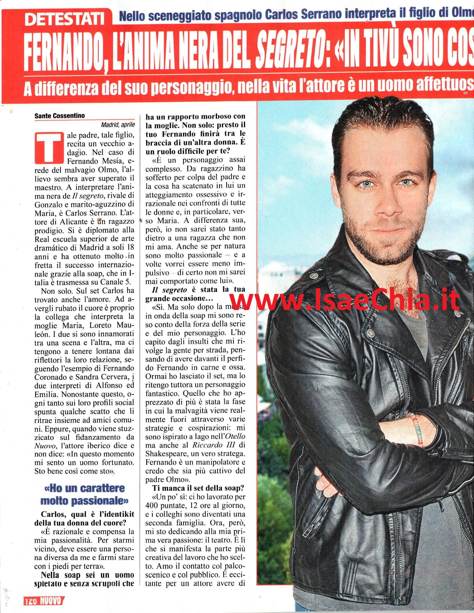 ‘Tale padre, tale figlio’ recita un vecchio detto. E pare sia valido anche per i personaggi de Il Segreto Olmo e Fernando Mesia. Quest’ultimo, infatti, è spietato quanto suo padre e non si fa scrupoli a far soffrire sua moglie Maria. Nella realtà, Fernando è Carlos Serrano, un ragazzo prodigio che a 18 anni si era già diplomato alla Real Escuela Superior de Arte Dramatico di Madrid e lui e l’attrice che interpreta Maria, Loreto Mauleon, sono davvero innamorati. Quando gli si chiede la differenza tra quello che è Carlos e Fernando, lui risponde: “Fernando è un personaggio assai complesso. Da ragazzino ha sofferto per colpa del padre e la cosa ha scatenato in lui un atteggiamento ossessivo e irrazionale nei confronti di tutte le donne e in particolare verso Maria. Io, invece, non sarei mai stato tanto dietro una ragazza che non mi ama, anche se per natura sono passionale. La mia donna ideale, infatti, è razionale e quindi diversa da me, mi compensa“. Il Segreto è stato senza dubbio la sua grande occasione. Quando gli si chiede se gli manca il set della soap, l’attore spagnolo risponde: “Solo dopo la messa in onda della serie mi sono reso conto della forza del mio personaggio. L’ho capito dagli insulti che mi rivolge la gente per strada, pensando di avere davanti Fernando in carne e ossa! Ormai ho lasciato il set, ma lo ritengo un personaggio fantastico. Quello che ho apprezzato di più è stata la fase in cui la sua malvagità viene fuori attraverso le cospirazioni: mi sono ispirato a Iago nell’Otello e al Riccardo III di Shakespeare. Un po’ mi manca quel set: ci ho lavorato per 400 puntate, 12 ore al giorno e i colleghi sono diventati una seconda famiglia. Ricordo ancora le scene del matrimonio con Maria: sono state lunghe e complicate, ma ci siamo divertiti molto! Ho riso molto perché simulavo una rivalità con padre Gonzalo, ma in realtà io e Jordi Coll siamo molto amici! Ora però mi sto dedicando alla mia prima grande passione, il teatro. E’ lì che si manifesta la parte più creativa del lavoro che ho scelto. Amo il contatto col pubblico, è eccitante per un attore avere qualcuno seduto in platea senza un particolare interesse che poi, a spettacolo terminato, se ne va soddisfatto“. Infine, ripercorrendo la sua carriera, Carlos parla anche di sogni e progetti futuri: “Ho iniziato ad Alicante, la mia città, a soli 15 anni, ma volevo fare di più e a Madrid ho centrato il mio obiettivo. La tv dà una popolarità incredibile, ma ora spero di fare un grande film per il cinema perché mi farebbe crescere come attore e come persona. Ho due sogni nel cassetto: quello lavorativo è girare un film con Martin Scorsese. L’altro è trasferirmi in un posto di mare, come Barcellona o la mia Alicante!“.