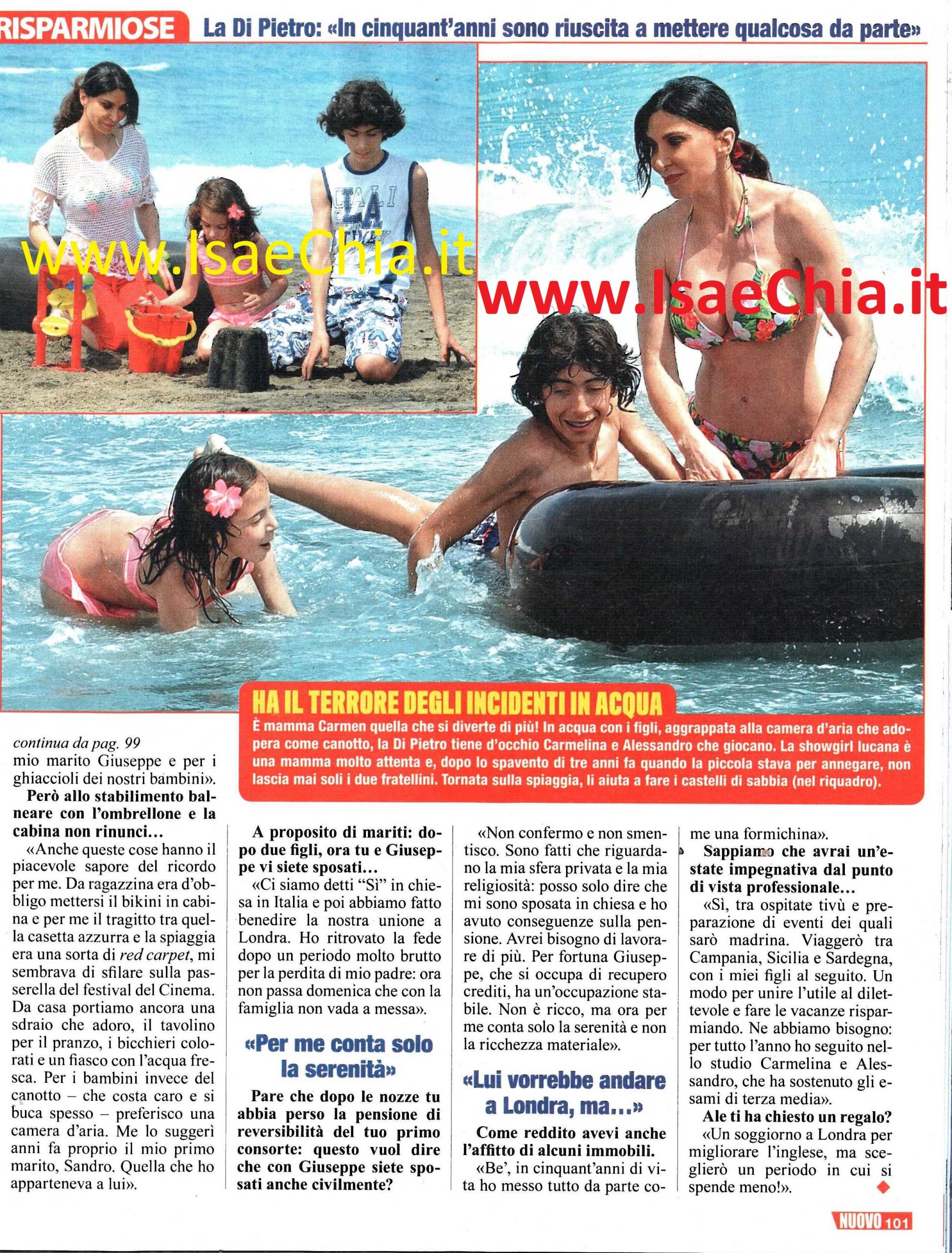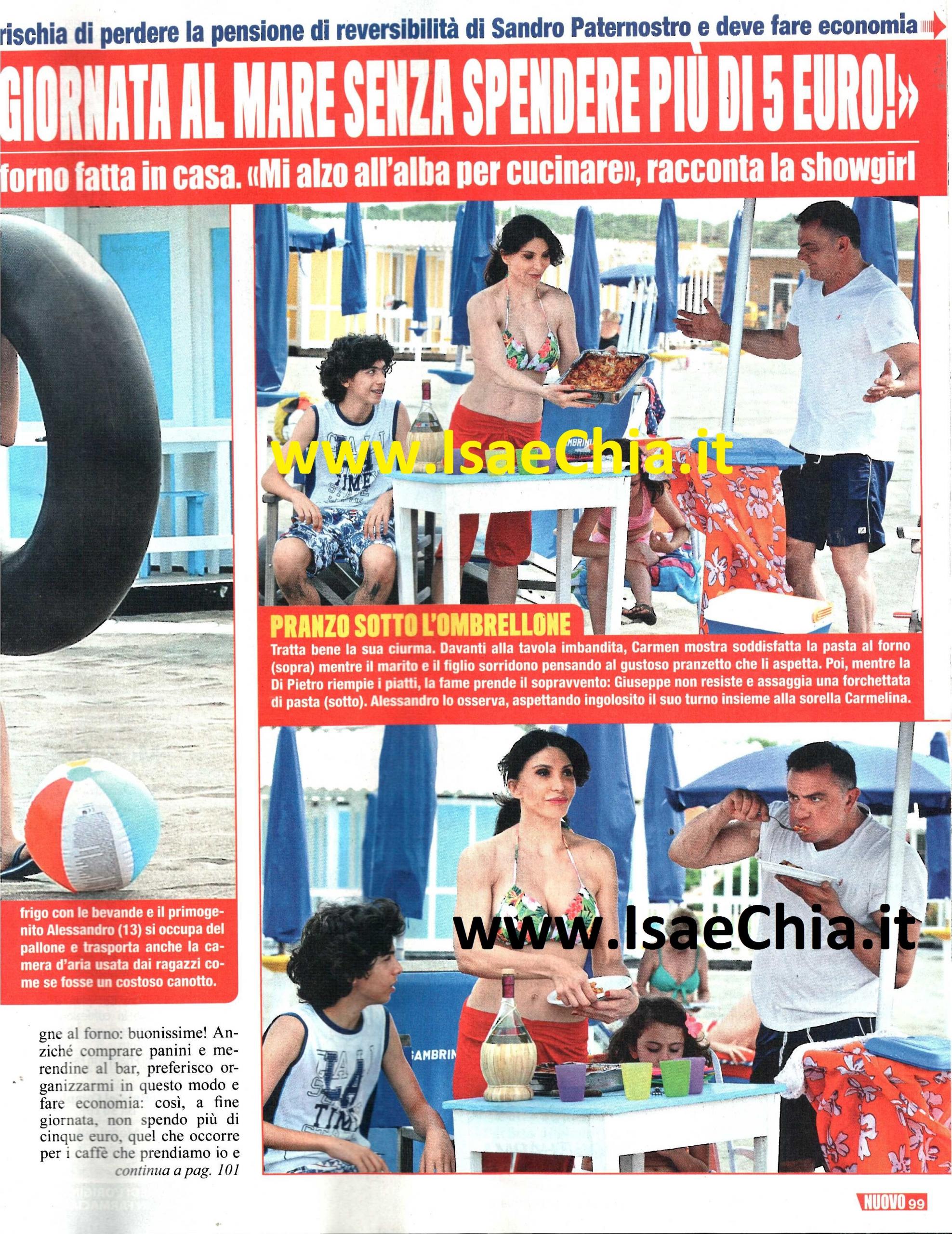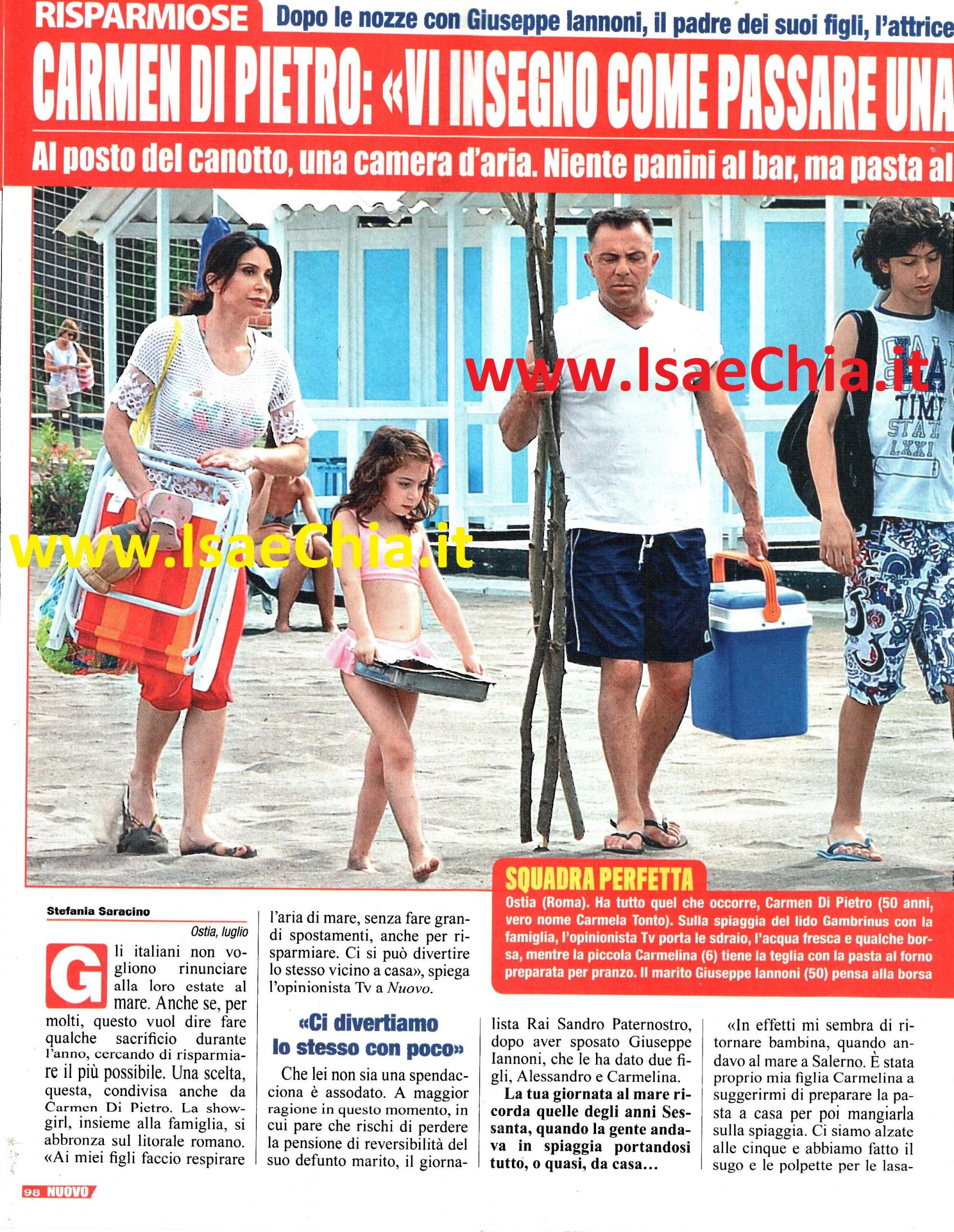 All’ex naufraga dell’Isola dei Famosi Carmen Di Pietro piace proprio tanto condividere tutti gli aspetti della sua vita privata con il pubblico. Negli scorsi mesi, infatti, ha parlato ai giornali prima delle sue nozze con lo storico compagno Giuseppe Iannoni pur non volendo rinunciare alla pensione da vedova (QUI l’articolo); poi ha parlato della sua volontà di diventare mamma nonostante i 50 anni e i tentativi non riusciti (QUA l’articolo), poi ancora dell’operazione chirurgica a cui dovrà sottoporsi sua figlia Carmelina (QUI il post). Questa volta, invece, fotografata al mare sul lido di Ostia, racconta: “Ai miei figli faccio respirare l’aria di mare, senza fare grandi spostamenti e per risparmiare!”. Eccola, infatti, mentre mostra orgogliosa la pasta al forno, mentre la sua famiglia attende affamata: “In effetti, mi sembra di tornare bambina, quando andavo al mare a Salerno. E’ stata mia figlia Carmelina a dirmi di preparare la pasta al forno per poi mangiarla sulla spiaggia. Ci siamo alzate alle 5, abbiamo fatto il sugo e le polpette. Anziché comprare panini e merendine, preferisco organizzarmi in questo modo: alla fine della giornata, non spendo più di 5 euro, quello che occorre per i caffè che prendiamo io e mio marito e per i ghiaccioli per i nostri figli. Non rinuncio al lido con ombrellone e cabina: hanno il piacevole sapore di un ricordo per me, perché quando ero ragazzina ci si metteva il bikini in cabina e per me il tragitto verso la spiaggia era come un red carpet! Portiamo da casa un fiasco d’acqua, il tavolino e una sdraio che adoro. Al posto del materassino che si buca sempre, portiamo una camera d’aria, come mi suggerì il mio compianto marito Sandro Paternostro“. A proposito, quando le si chiede se ha perso la pensione di reversibilità del primo marito e se quindi si è sposata anche civilmente con Giuseppe, Carmen spiega: “Ci siamo detti sì in chiesa e a Londra. La pensione? Non confermo e non smentisco. Sono fatti che riguardano la mia sfera personale. Posso solo dire che mi sono sposata in chiesa e che ho avuto conseguenze sulla pensione. Avrei bisogno di lavorare di più. Per fortuna Giuseppe ha un’occupazione stabile, ma per me ora non contano i soldi, bensì la serenità. Quest’estate viaggerò tra Campania, Sicilia e Sardegna, tra ospitate tv ed eventi in cui sarò madrina. E porterò con me i miei figli, un modo per unire l’utile al dilettevole e fare le vacanze risparmiando. Mio figlio Alessandro ha sostenuto l’esame di terza media e mi ha chiesto anche un soggiorno a Londra per imparare l’inglese, ma sceglierò un periodo in cui si spende meno!“.