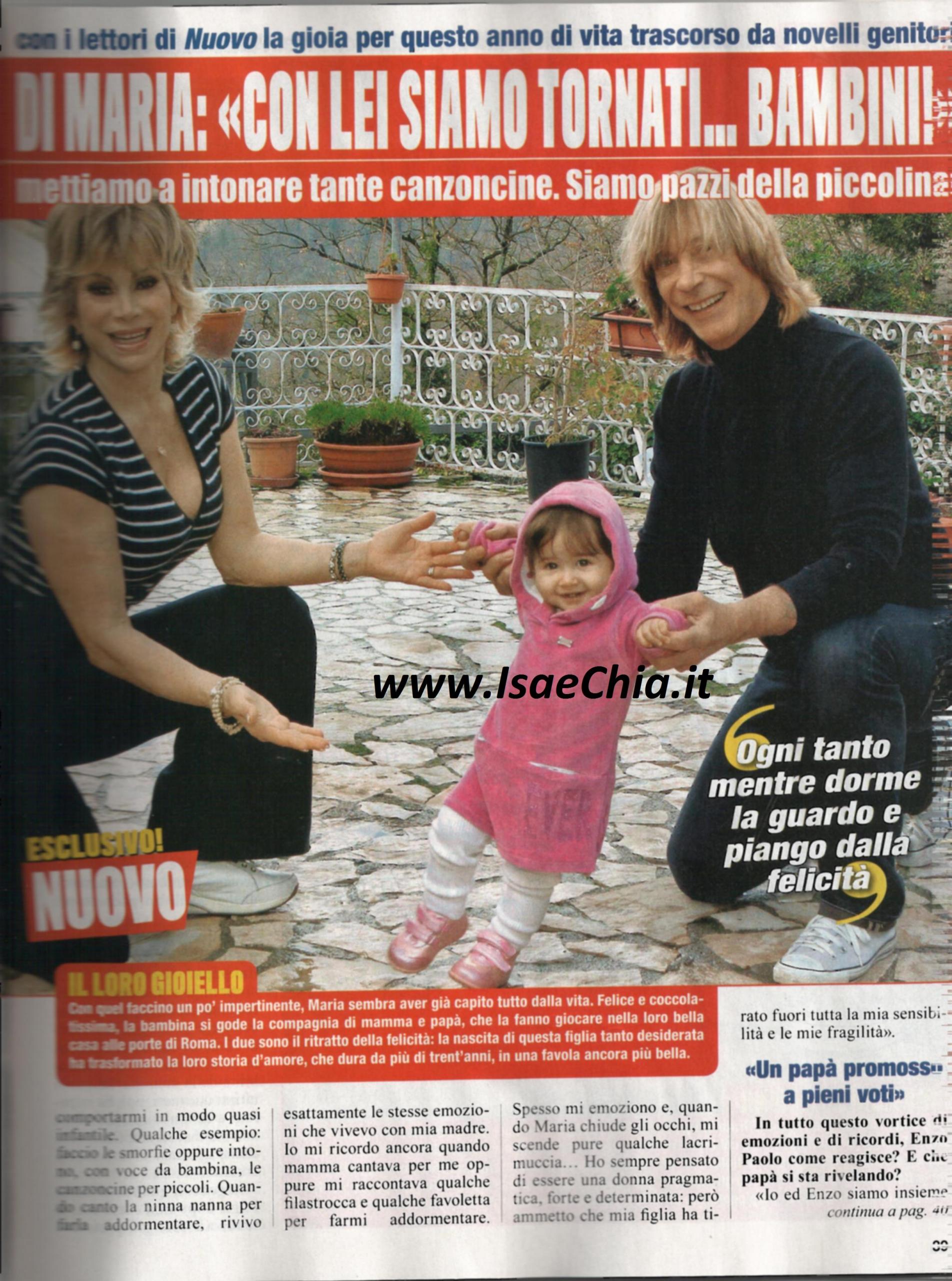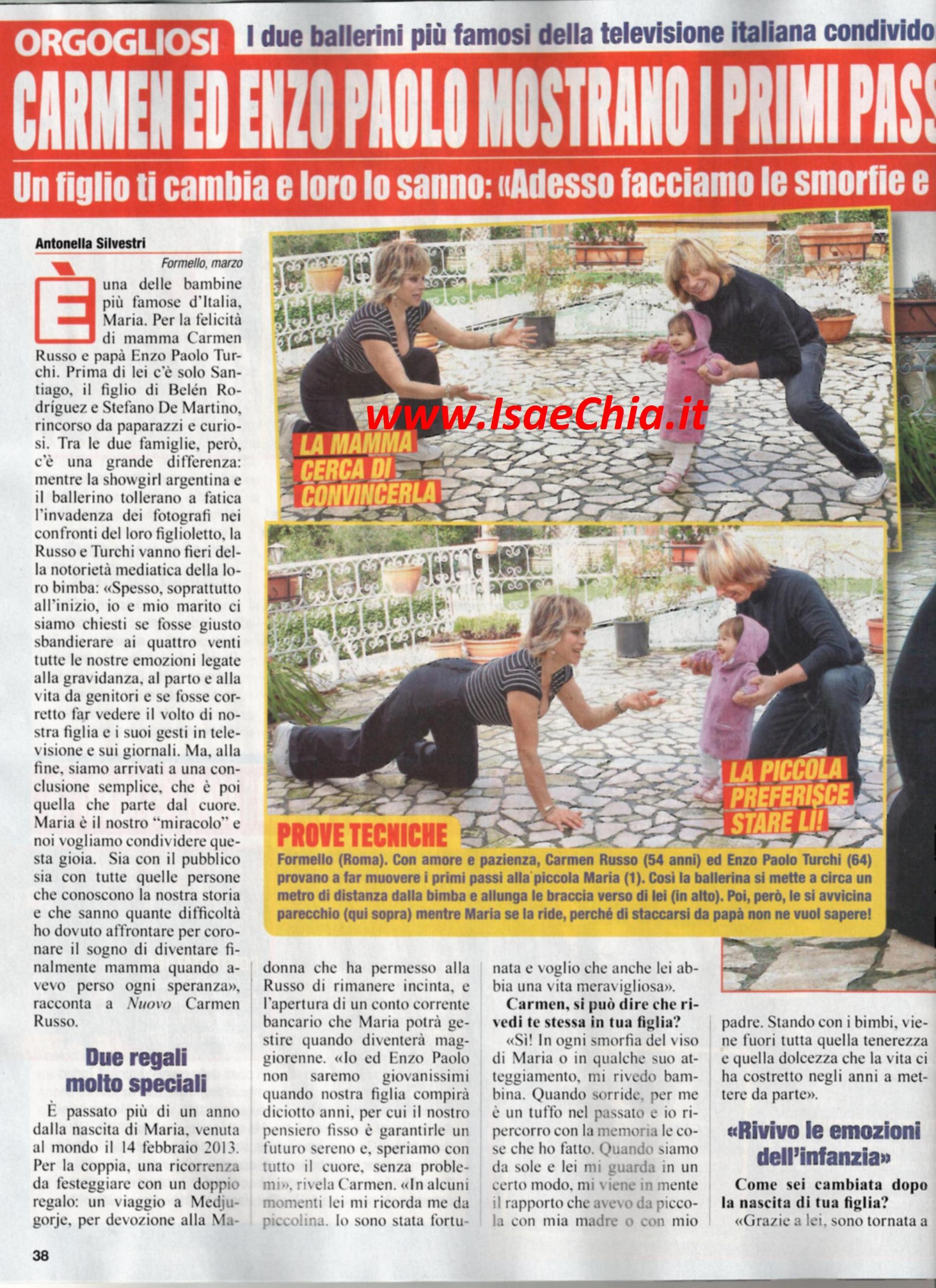 Gli ex naufraghi Carmen Russo ed Enzo Paolo Turchi hanno dichiarato: “Spesso ci siamo chiesti se fosse corretto far vedere il volto di nostra figlia Maria sui giornali, ma poi siamo arrivati ad una conclusione semplice. Lei è il nostro “miracolo” e noi vogliamo condividere questa gioia col pubblico e con le persone che sanno quante difficoltà abbiamo dovuto affrontare”. In occasione del suo primo compleanno, oltre ad un viaggio a Medjugorje per ringraziare la Madonna, i due le hanno regalato un conto corrente: “Quando avrà 18 anni, noi non saremo più giovani, per cui il nostro pensiero fisso è garantirle un futuro serena. Io mi rivedo in lei da piccola, in ogni suo gesto e quando mi guarda rivedo il rapporto con mia madre. Grazie a lei sono tornata a comportarmi in modo infantile: le faccio le smorfie, le canto le canzoncine con la voce da bambina. Spesso mi emoziono e mi scende qualche lacrimuccia. Ho sempre pensato di essere una persona forte e pragmatica; ora ammetto che mia figlia ha tirato fuori la mia sensibilità. Enzo Paolo è il marito ideale e lo è anche come papà. Abbiamo scelto di crescere nostra figlia senza una baby-sitter e non ci è pesato. Lui a volte è capace di tranquillizzarla quando piange a dirotto, non so come fa. E’ una bambina molto vispa: alla festa per il suo primo compleanno, ha giocato con tutti i bambini, anche quelli più grandi. Da circa due mesi ha imparato a camminare e da allora non sta mai ferma: in questo ha preso da me!” dice Carmen. E quando le si chiede se chi diventa genitore in tarda età tende ad essere più protettivo, risponde: “Enzo Paolo è campano e al Sud tendono ad assecondare di più i capricci; io non sono severissima, ma ho imposto qualche regola. L’idea di fare un altro figlio sarebbe uno schiaffo al destino, una sfida alla natura. Il Signore ha voluto donarci questo fiore che abbiamo aspettato per anni! Resterà figlia unica, ma riceverà tanto amore dai suoi genitori! Io ed Enzo Paolo non riusciamo più ad avere l’intimità di una volta? Pazienza, abbiamo già dato! Prima difficilmente c’era tensione tra noi, ora litighiamo, ma solo per Maria”. Infine, la ballerina rivela dei doni che Maria ha ricevuto: “La sua madrina di battesimo Valeria Marini le ha regalato una croce con diamanti, mentre il suo padrino, il medico di famiglia Antonio Longo le ha preso un’intera parure in diamanti. Lui, coi suoi modi di fare, mi ricorda molto il mio papà!”