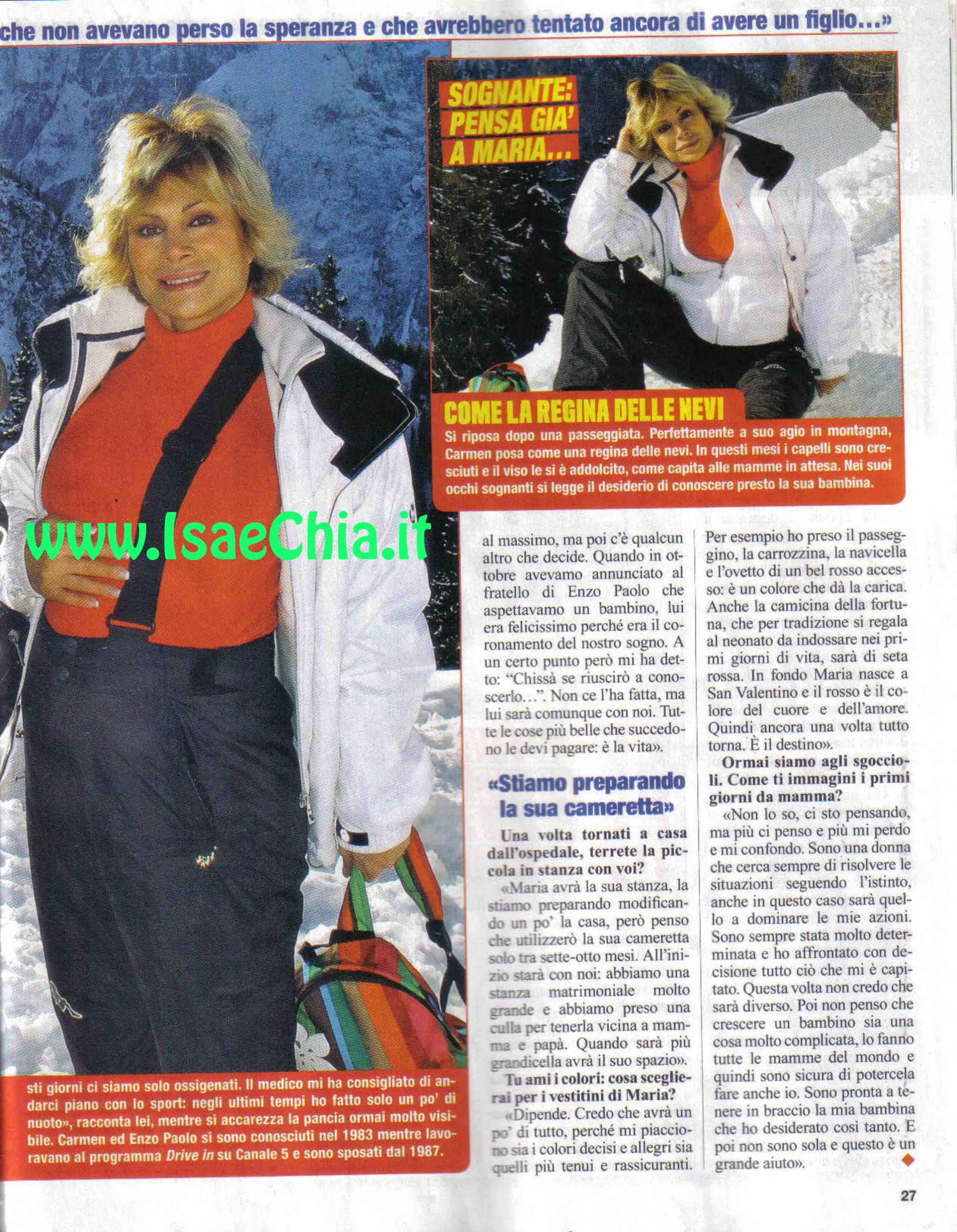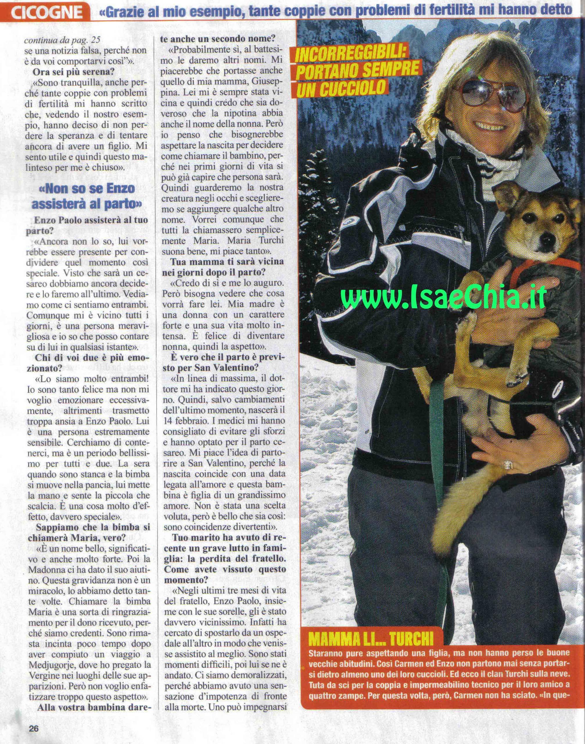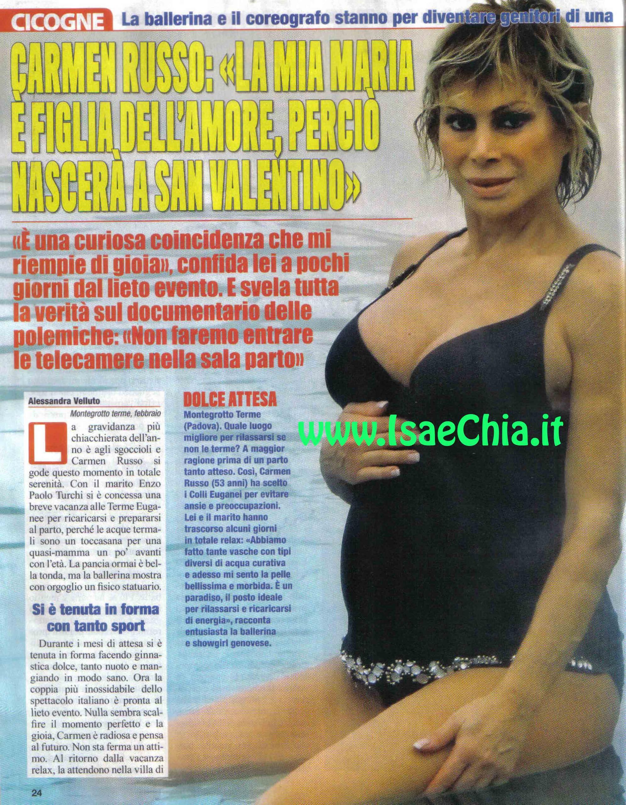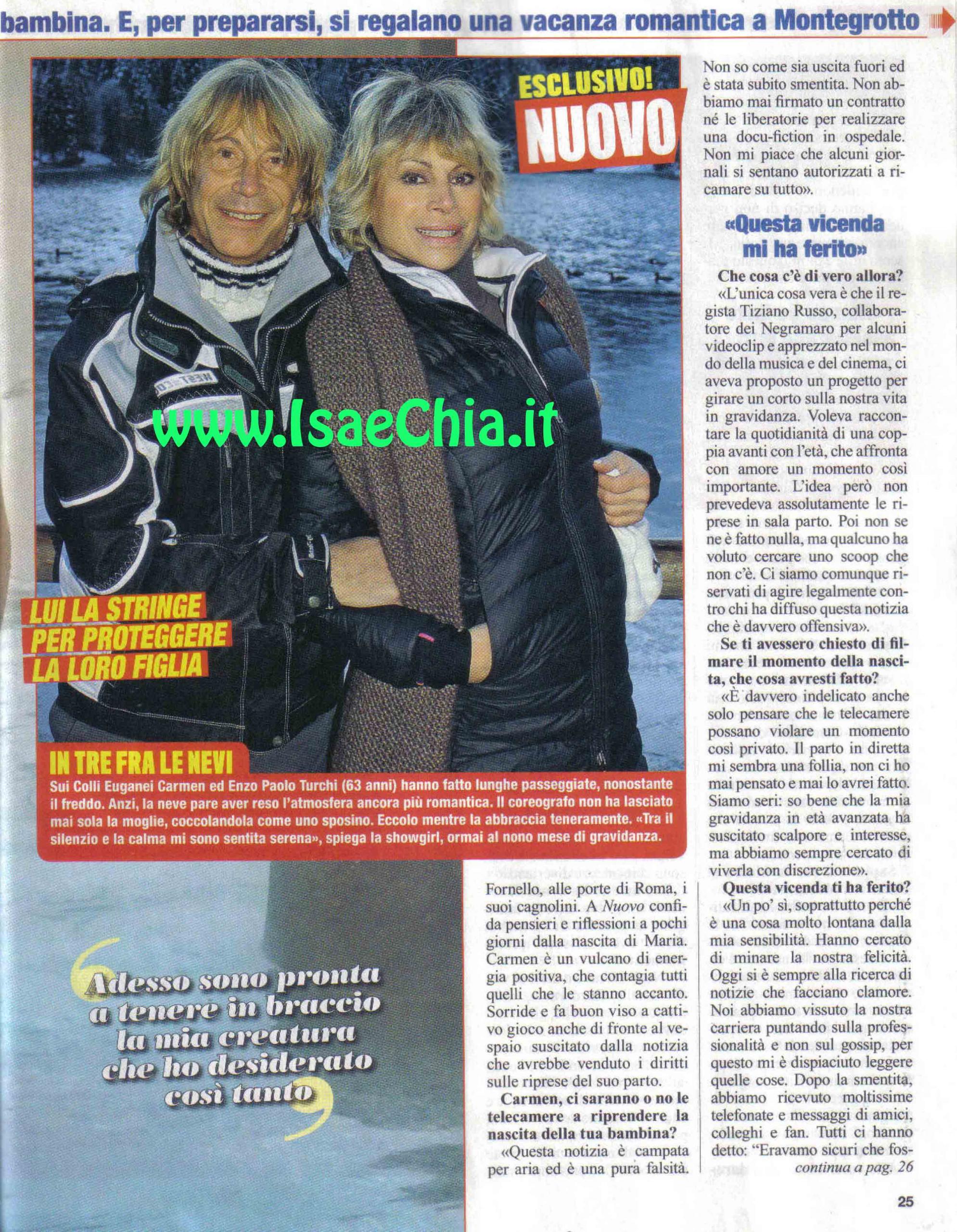 I naufraghi dell’Isola dei famosi Carmen Russo ed Enzo Paolo Turchi si sono concessi una vacanza alle terme. Al ritorno, raccontano i loro pensieri a pochi giorni dalla nascita della loro piccola Maria: “Non ci saranno le telecamere a riprendere la nascita: questa notizia è campata in aria e pura falsità; non abbiamo firmato contratti né liberatorie per un docu-reality in ospedale. Ci è stato proposto solo un corto per raccontare come una coppia avanti con l’età affronta l’attesa, ma non si è fatto più niente. Il parto in diretta mi sembra una follia e non ci ho mai pensato, è una cosa lontana dalla mia sensibilità. Abbiamo sempre cercato di puntare sulla professionalità e non sul gossip e per questoci dispiace. Enzo Paolo è molto emozionato e so che posso contare su di lui sempre. La sera quando sono stanca mi tiene la mano sulla pancia per sentire Maria, che avrà il nome della Madonna, che ci ha aiutato. Forse le daremo anche il nome di mia mamma, Giuseppina, che mi è sempre stata vicina. In linea di massima, il dottore mi ha indicato come giorno del parto il 14 febbraio, San Valentino e per evitare sforzi, mi ha consigliato il cesareo. E’ il giorno dell’amore e Maria è frutto dell’amore, ma è stata una divertente coincidenza. Il fratello di Enzo Paolo è venuto a mancare da poco e ci siamo sentiti impotenti davanti alla morte. Lui era felice per noi e quando ha saputo che ero incinta ha detto “Chissà se riuscirò a vederla”.
