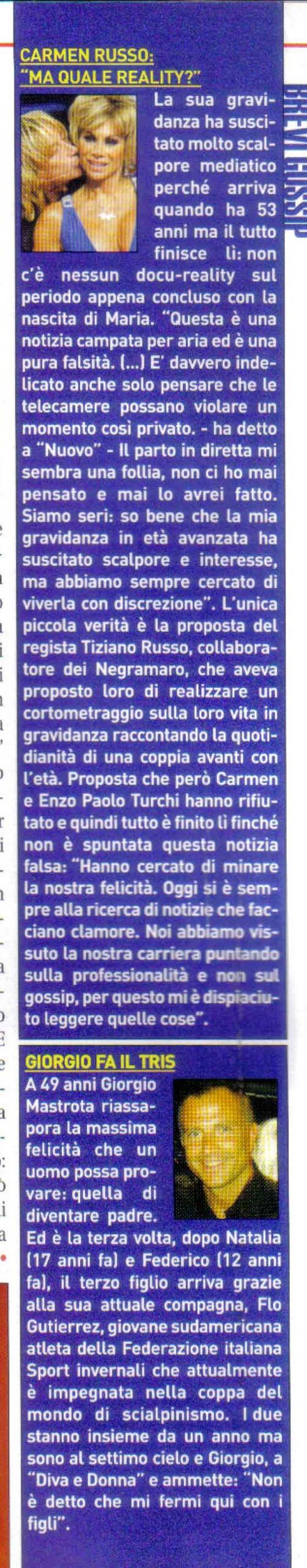 La due volta naufraga sull’Isola dei famosi Carmen Russo ha dichiarato indignata: “Non c’è nessun docu-reality su mia figlia. Questa notizia è campata in aria ed è pura falsità. E’ davvero indelicato pensare che le telecamere possano violare un momento così privato. Il parto in diretta mi sembra una follia e non ci ho mai pensato. Diciamoci la verità, so che la mia gravidanza a 53 anni ha provocato scalpore, ma abbiamo sempre cercato di viverla con discrezione!”. L’unica verità è che avevano ricevuto la proposta per un cortometraggio per raccontare la loro quotidianità: “Oggi si è sempre alla ricerca di notizie che facciano clamore. Noi abbiamo vissuto la nostra carriera puntando sulla professionalità e non sul gossip!”