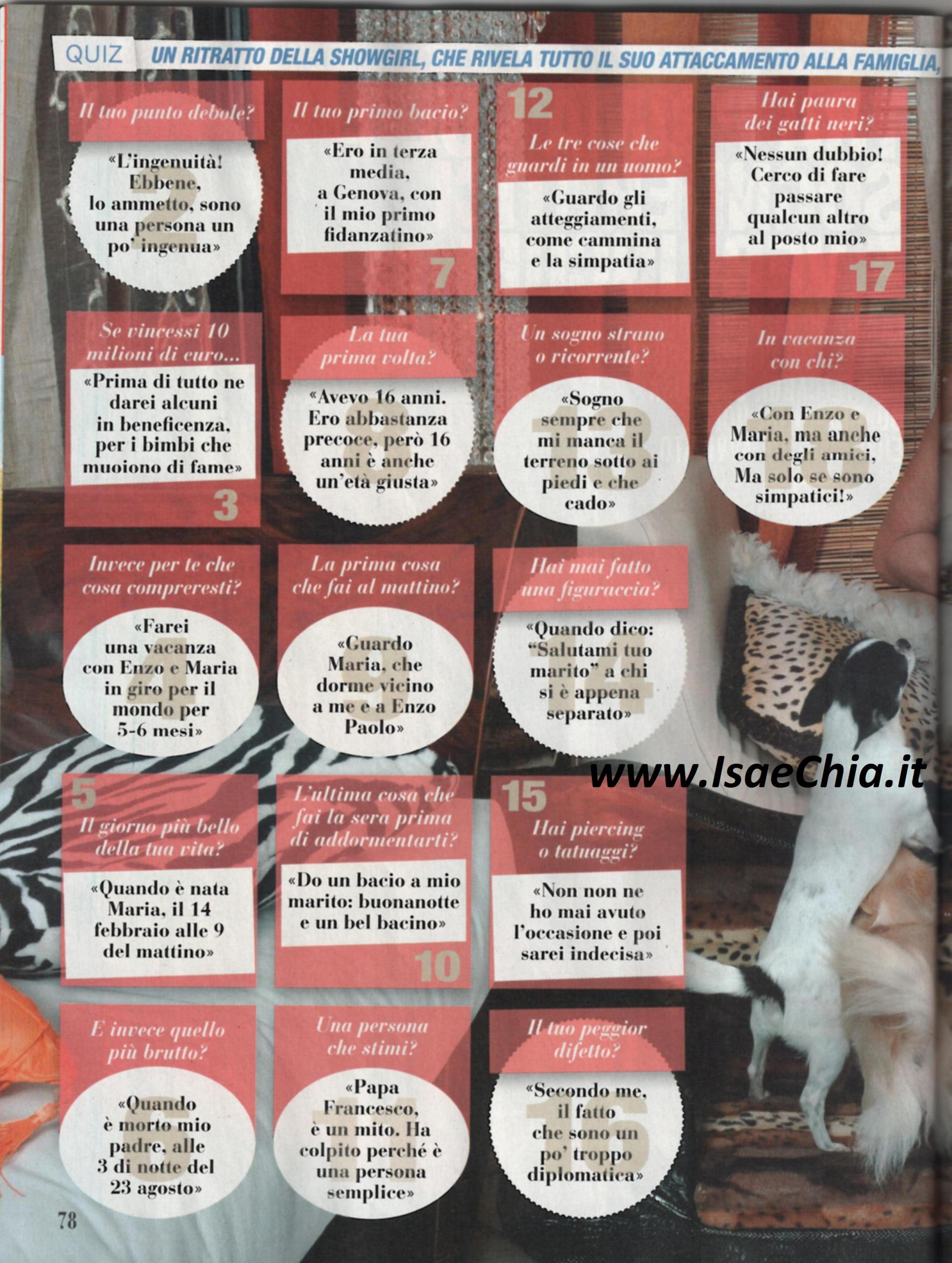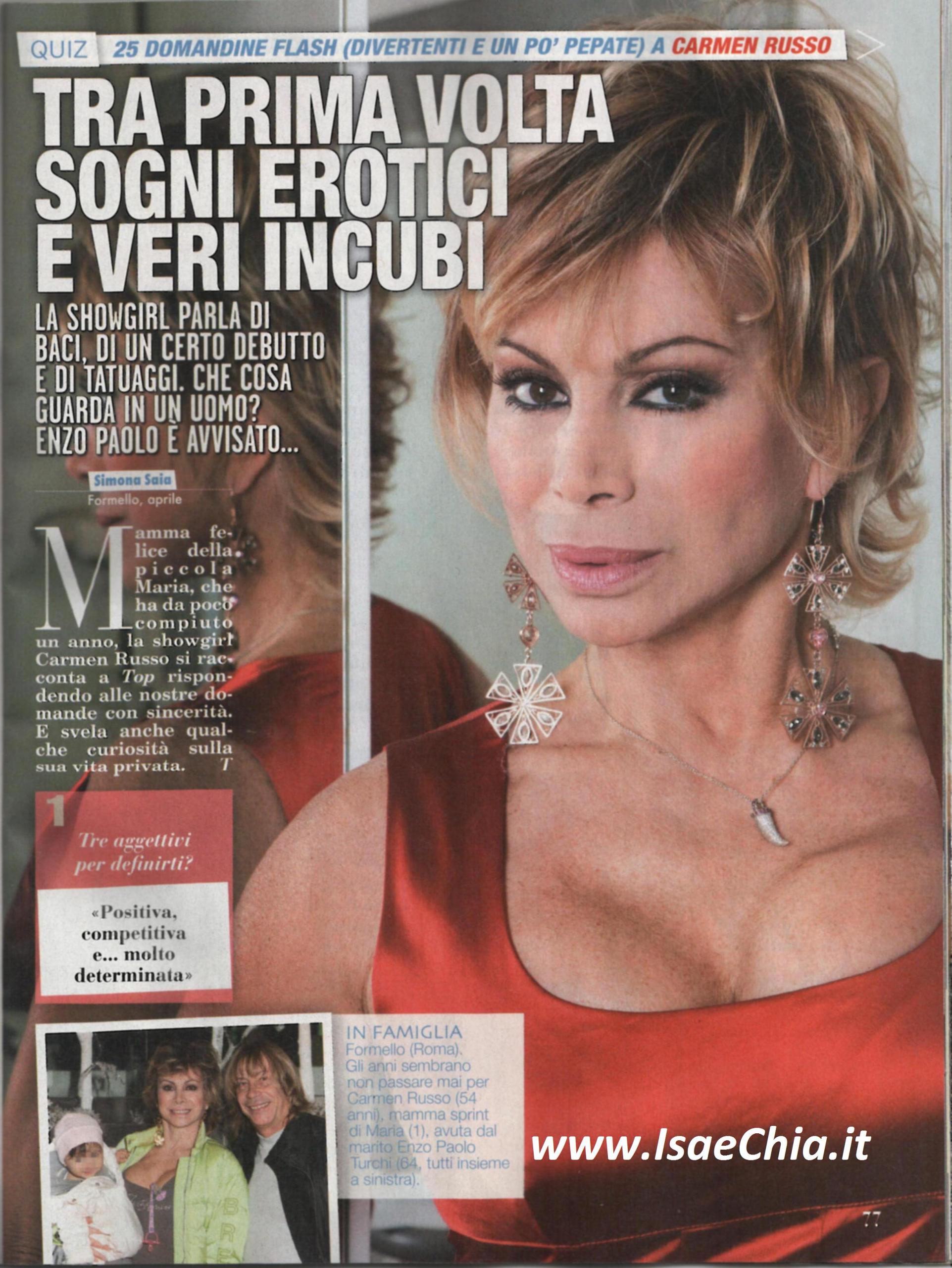 La sua piccola Maria ha da poco compiuto un anno e Carmen Russo si è scoperta nel nuovo ruolo di mamma. Ma in questa intervista composta da 25 domande flash, l’ex naufraga si confessa a 360 gradi: “Sono positiva, competitiva e determinata, ma i miei difetti sono l’ingenuità e l’essere troppo diplomatica. Se vincessi 10 milioni, li darei in beneficenza, e me ne andrei con Enzo Paolo Turchi e Maria in giro per il mondo. Il giorno più bello della mia vita è stato il 14 febbraio 2013, quando è nata lei. Il più brutto la morte di mio padre”. Poi si lascia andare a qualche domanda più piccante: “Il primo bacio era in terza media, a Genova, al mio primo fidanzatino. La prima volta? A 16 anni. Ero abbastanza precoce, però 16 anni è anche un’età giusta. In un uomo mi colpiscono gli atteggiamenti, come cammina e la simpatia. Ho un sogno erotico, ma non lo rivelo e aspetto che si avveri!”. Dopo aver raccontato figuracce e discusso di superstizioni, rivela un lato molto dolce: “La prima cosa che faccio al mattino è guardare Maria, l’ultima è dare un bacino e la buonanotte a Enzo Paolo. Nella vita ciò che conta di più è svegliarsi e trovare sempre l’entusiasmo di fare. Non ho mai rincorso i soldi; ciò che conta è la salute, al resto si trova una soluzione!”