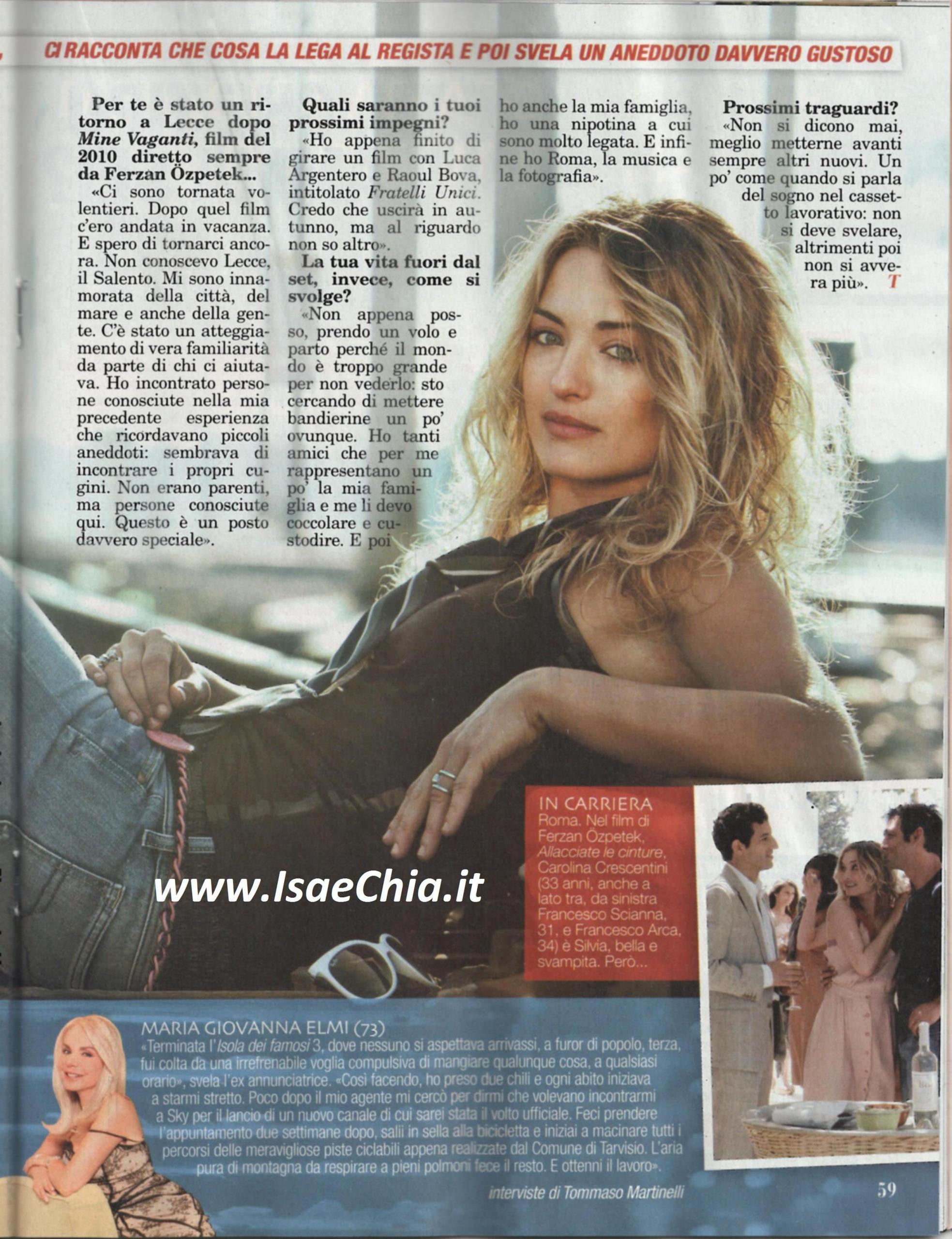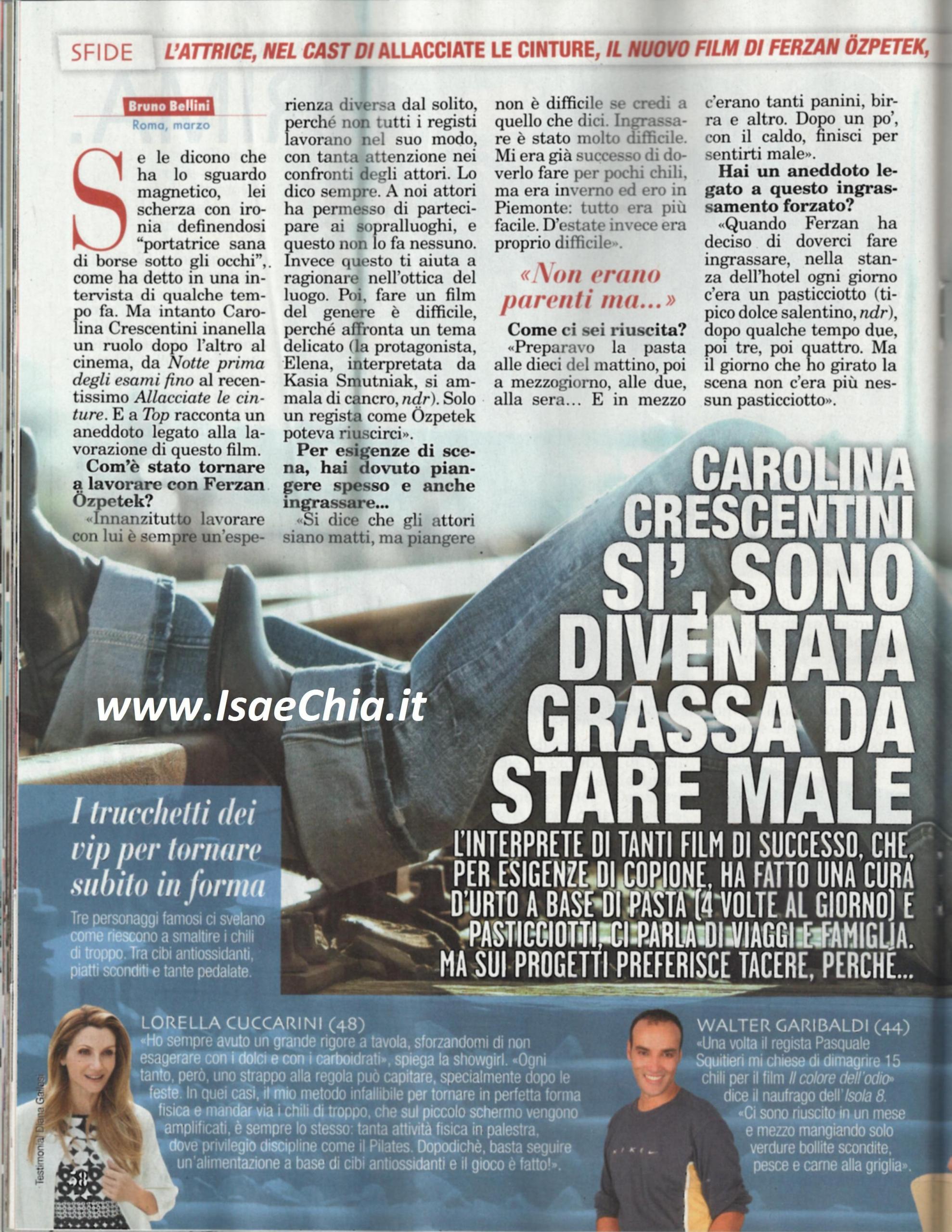 Oltre a Francesco Arca e Kasia Smutniak, tra i protagonisti del film Allacciate le cinture c’è anche l’attrice italiana Carolina Crescentini: “Lavorare con Ferzan Ozpetek è sempre un’esperienza dal solito perché non tutti i registi danno tanta attenzione agli attori, ad esempio facendoci fare dei sopralluoghi o trattando un tema come il cancro. Per il mio ruolo ho dovuto piangere spesso e anche ingrassare. Piangere non è difficili se credi in quello che dici. Ingrassare è stato difficile: mi era già capitato, di pochi chili, ma era inverno ed ero in Piemonte. In estate è più difficile. Preparavo la pasta alle 10 del mattino, poi a mezzogiorno, alle due, alla sera…E in mezzo c’erano panini, birra e dopo un po’, col caldo, finisci per sentirti male. Ogni giorno nella stanza dell’albergo Ferzan mi faceva trovare un pasticciotto, tipico dolce salentino, dopo qualche tempo due, tre, quattro…Quando ho girato la scena, non c’era più nessun pasticciotto. Sono tornata a Lecce dopo esserci stata per girare Mine vaganti nel 2010. Mi sono innamorata della città e del Salento e le persone sono come dei vecchi parenti. Non appena posso, prendo un volo e vado via: il mondo è troppo grande per non vederlo. Poi ho la mia famiglia, la musica e la fotografia. Ho appena finito di girare un film con Luca Argentero e Raoul Bova, ma non svelo i prossimi traguardi: non si svelano i sogni nel cassetto, o non si realizzano più”.