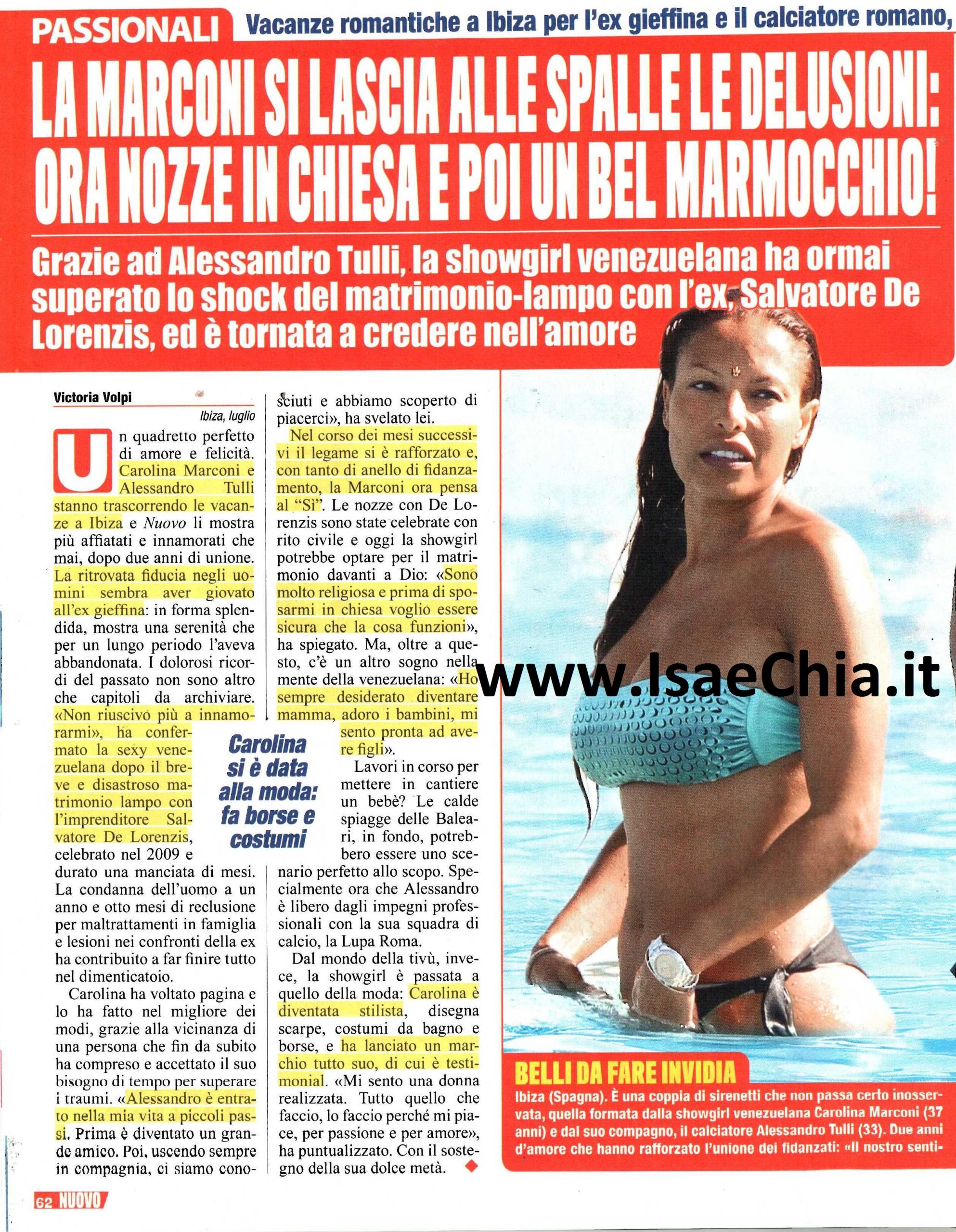 Un quadro perfetto di amore e felicità: Carolina Marconi e il suo fidanzato, il calciatore Alessandro Tulli, stanno trascorrendo le vacanze ad Ibiza e dopo due anni insieme, i due sono più affiatati e felici che mai. La ritrovata fiducia negli uomini sembra aver giovato all’ex gieffina, che, in forma splendida, sembra aver dimenticato i dolorosi ricordi del passato, legati al matrimonio lampo con Salvatore De Lorenzis, celebrato nel 2009 e durato una manciata di mesi: “Non riuscivo più ad innamorarmi” dichiara la bella venezuelana. Poi, la condanna dell’ex marito a un anno e otto mesi per maltrattamenti in famiglia e lesioni nei confronti della ex ha contribuito a far finire tutto nel dimenticatoio. E ora Carolina è di nuovo felice: “Alessandro è entrato nella mia vita a piccoli passi. Prima è diventato un grande amico. Poi, uscendo sempre in compagnia, ci siamo conosciuti meglio e abbiamo scoperto di piacerci” racconta lei. Quando le si chiede se con lui sarebbe pronta anche a pronunciare di nuovo il sì, lei risponde: “Sono molto credente e prima di sposarmi in chiesa voglio essere sicura che la cosa funzioni. Ho sempre desiderato diventare mamma, adoro i bambini e mi sento pronta ad avere figli“. Beh, data la passione che c’è tra di loro, non ci stupirebbe che i due stiano già al lavoro per avere un figlio tutto loro! Nel frattempo, la showgirl, dopo aver esordito nel mondo della musica, porta avanti anche la sua carriera nella moda, disegnando scarpe, borse e costumi da bagno e lanciando un marchio tutto suo: “Mi sento una donna realizzata. Tutto quello che faccio, lo faccio perché mi piace, per passione e con amore“.