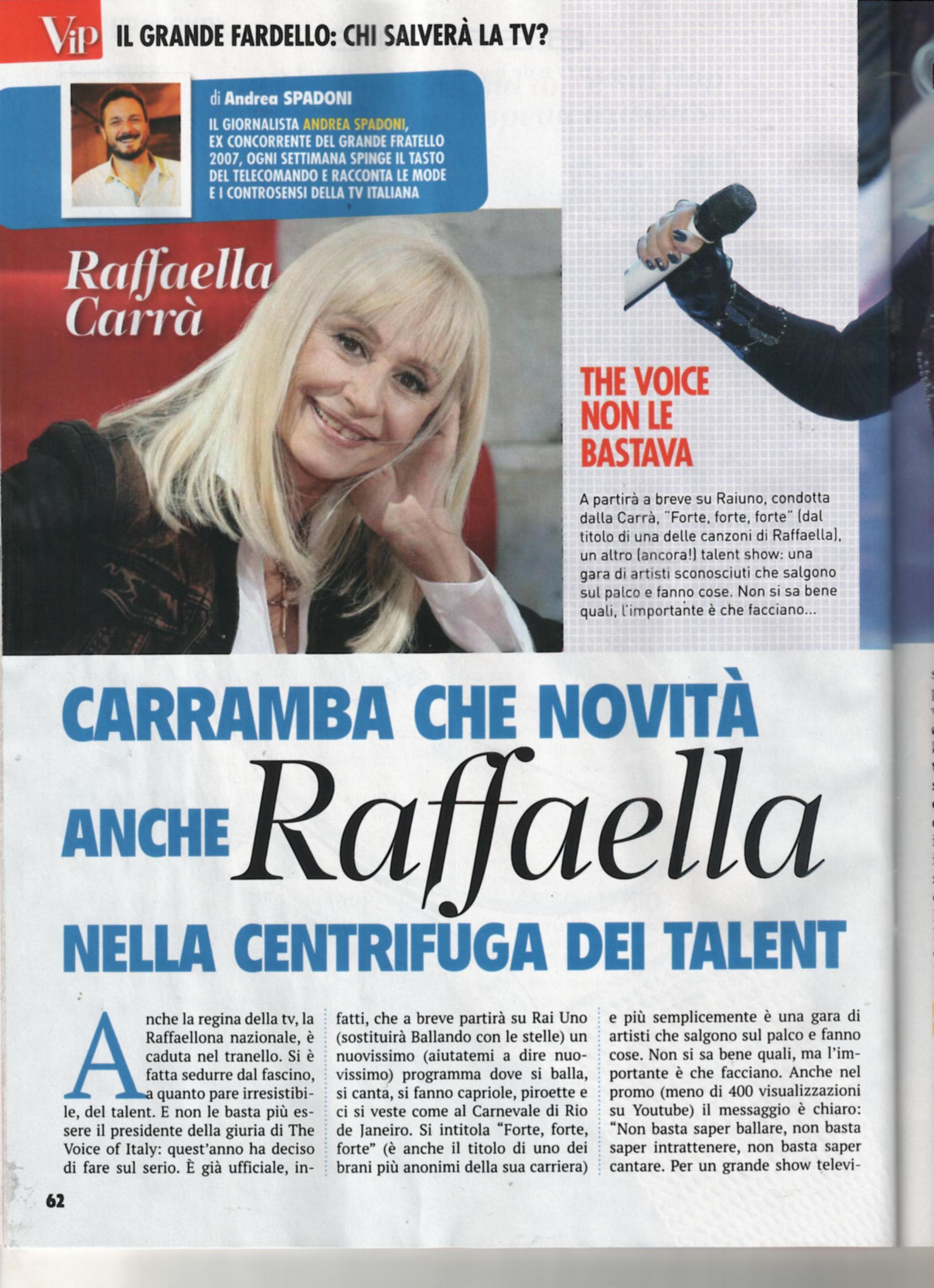 Anche Raffaella Carrà, regina della televisione italiana, ha ceduto alla tentazione e al fascino irresistibile del talent: dopo aver fatto da giudice a The Voice of Italy per due anni, ha deciso, però, di fare un talent tutto suo. Quando Ballando con le stelle finirà, infatti, Raffaella lo sostituirà con un nuovissimo programma dove si balla, canta, si fanno capriole e piroette e ci si veste come al Carnevale di Rio: Forte forte (prendendo il nome da un successo della Carrà). Nel promo del programma, il messaggio è chiaro: “Non basta saper ballare, saper cantare, saper intrattenere. Per un grande show televisivo devi saper fare tutto!” ha dichiarato lei. E quindi, dopo The voice, Amici, X Factor e i format come Italia’s got talent e Tu sì que vales, arriverà un altro talent. E chissà che grazie alla Raffa nazionale non nasca un nuovo talento come Emma, Alessandra Amoroso, Marco Mengoni o Noemi. Peccato che, almeno per ora, non pare ci siano idee particolarmente innovative. L’unica indiscrezione trapelata è che, come impone la moda, ci sarà un rapper in giuria, e si tratterà di Emis Killa.