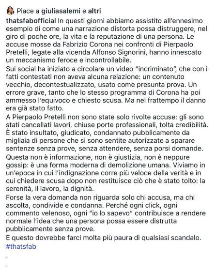 Era doveroso fare questo post, perché negli ultimi giorni purtroppo mi trovo protagonista di una vicenda sconcertante, nella quale non avrei assolutamente voluto metterci il naso. Però purtroppo mi trovo protagonista di questa roba qui. In relazione a quanto detto da Fabrizio Corona nella puntata di Falsissimo, voglio precisare una cosa. Io non ho mai subito nessun tipo di abuso, non ho mai subito nessun tipo di ricatto, non ho mai subito nessun tipo di violenza e non ho mai ricevuto nessun tipo di regalo. Inoltre, ci tengo a dire anche che non c’è stato nessun incontro segreto tra me e Alfonso, se non a Cinecittà, in più occasioni, ma non da soli, sempre in presenza di altri autori o altri assistenti. Sono disponibile al 100% a riferire quello che ho detto e a documentare nelle sedi opportune, la verità di questo racconto, anche perché le registrazioni delle tante chiamate che ho ricevuto da parte di Fabrizio le ho anche io, perché non ce n’è stata solo una, le chiamate sono più di una, più di due, più di tre. Le persone magari non hanno la vera linea dei fatti e quindi poi è facile dare un giudizio in base a quello che vi viene raccontato, però non sempre è la verità.
