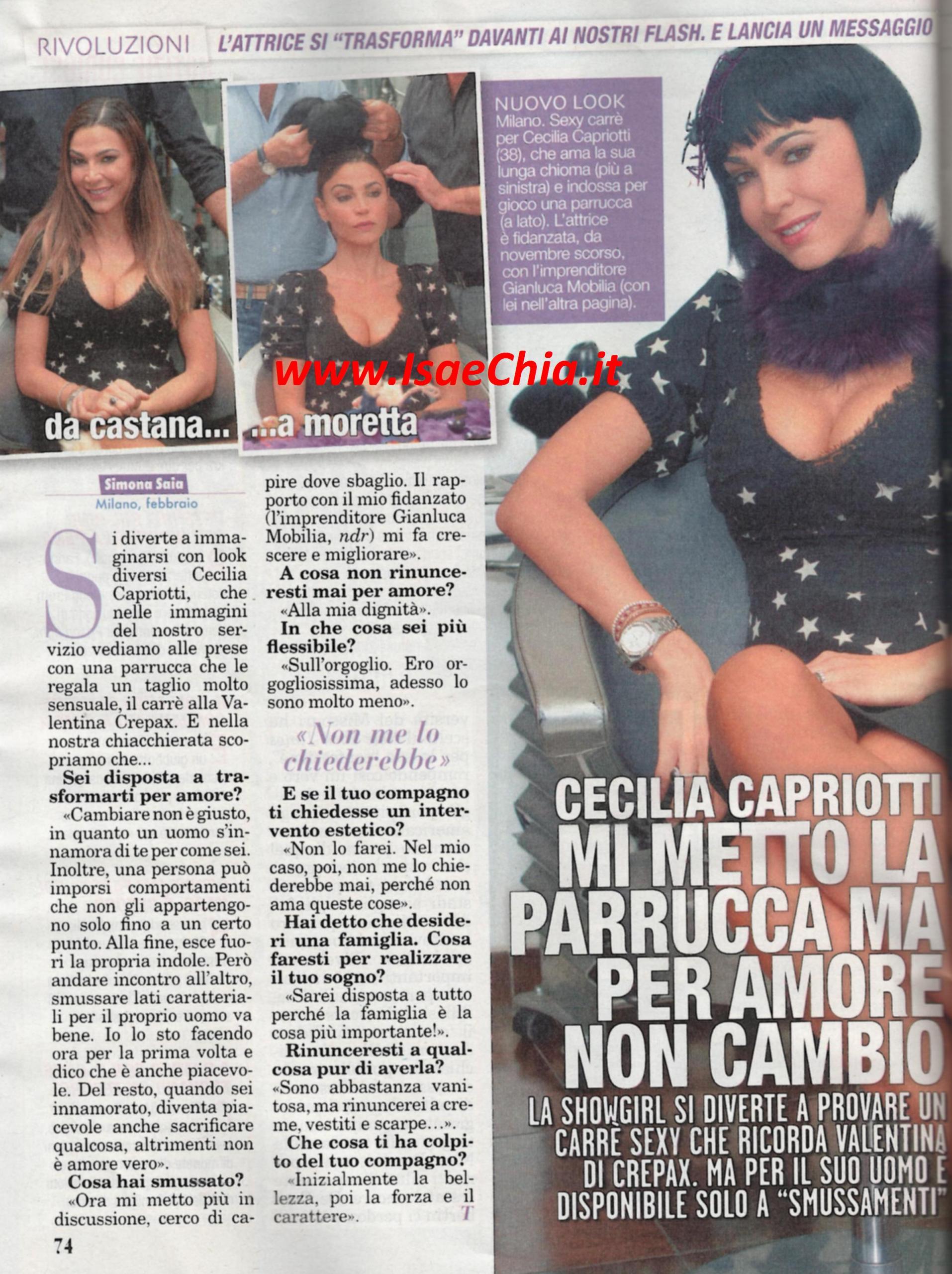 La bella Cecilia Capriotti, che dopo l’esperienza a Jump! è stata nel cast de I segreti di Borgo Larici, fiction in costume di Mediaset. E adesso, posa per un servizio fotografico con un carré alla Valentina Crepax, ma è disposta a cambiare solo per gioco: “Cambiare non è giusto, in quanto un uomo si innamora di te per come sei. Una persona può imporsi comportamenti che non le appartengono solo fino ad un certo punto. Andare incontro l’uno all’altro e smussare i propri lati caratteriali, invece, va bene. Io lo sto facendo per la prima volta e dico che è anche piacevole. Mi metto più in discussione, cerco di capire dove sbaglio” dice lei, annunciando la sua storia con l’imprenditore Gianluca Mobilia. “Ero orgogliosissima, ora lo sono di meno. Ma non rinuncerei mai alla dignità. Se lui mi chiedesse un intervento estetico, non lo farei. Nel mio caso, non lo farebbe mai, perché non gli piacciono queste cose. Per la famiglia rinuncerei a tutto: per me è la cosa più importante. Per averne una, rinuncerei a creme, vestiti e scarpe, nonostante la mia vanità”. E infine, quando le si chiede cosa l’ha fatta innamorare, risponde: “Inizialmente la bellezza, poi la forza e il carattere”.