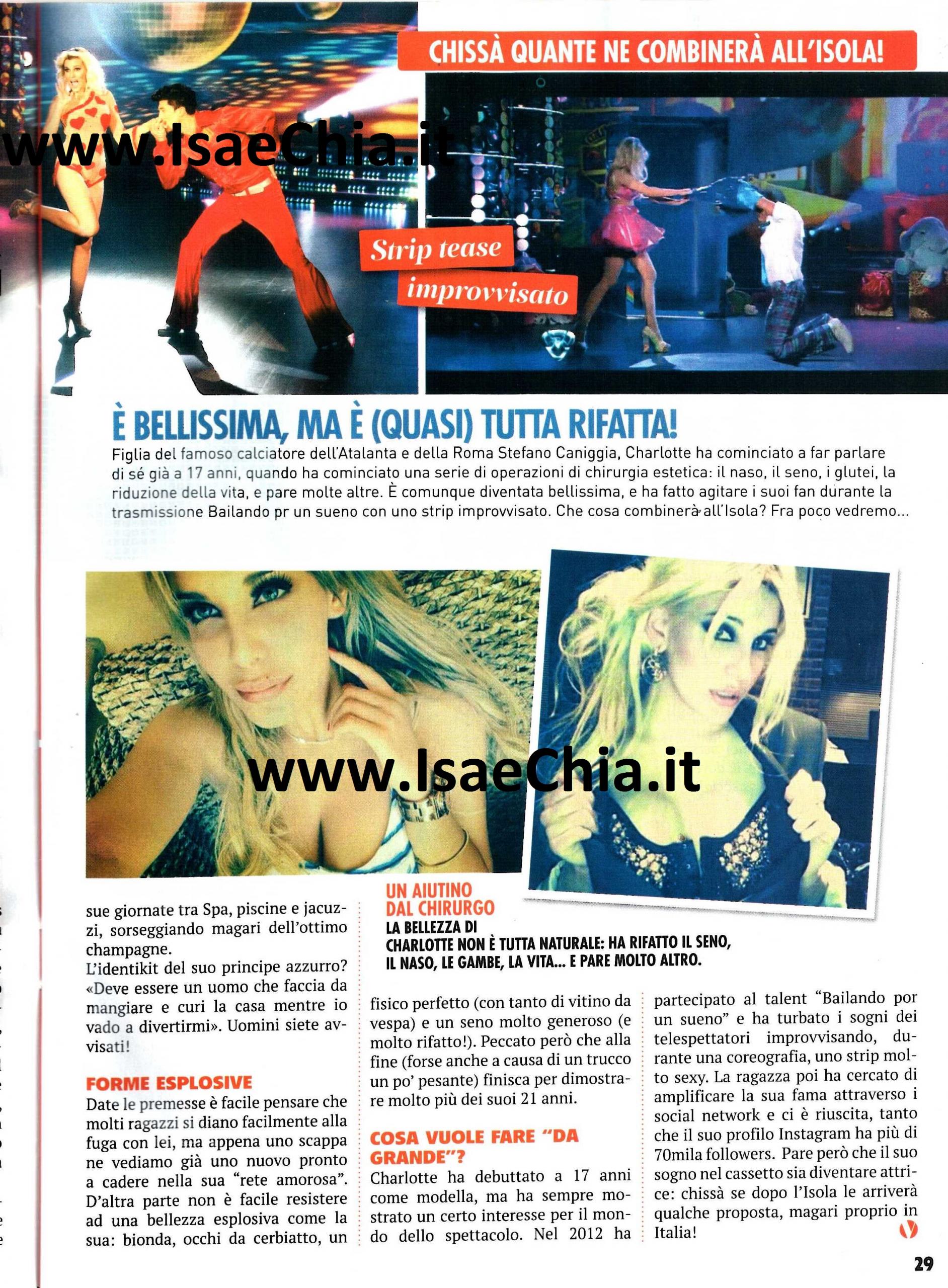 Lunedì 26 gennaio sarà finalmente in onda su Canale 5 l’attesissima prima puntata della decima edizione dell’Isola dei famosi. Il cast è ormai noto (QUA per leggerli tutti), e tra questi spicca anche quello di Charlotte Caniggia, la bella figlia del calciatore Claudio Caniggia. Quasi sconosciuta in Italia, è una vera celebrità in Argentina, tanto da essere stata definita la “Paris Hilton argentina”. Proprio come la ricca ereditiera, Charlotte è molto viziata e si è lasciata andare a dichiarazioni tipo “Io e mio fratello non abbiamo bisogno di lavorare, tanto ci mantiene la carta di credito di papà”. Suo fratello Alexander, però, vanta anche un lavoro prestigioso presso l’ambasciata argentina. Lei, invece, ama le spa e lo shopping e il suo uomo ideale “deve fare da mangiare e curare la casa mentre io vado a divertirmi!“. Date le premesse, si penserebbe che tutti gli uomini scappino a gambe levate da lei, ma non è facile resistere alla sua bellezza esplosiva: occhi da cerbiatta, curve prosperose…Ma poco è dono di madre natura: ha rifatto il seno, il naso, le gambe, la vita e forse anche altro. A 17 anni, Charlotte ha debuttato come modella ma ha rivelato di essersi sottoposta agli interventi appena compiuti i 18 anni. Nel 2012 ha partecipato a Bailando por un sueno, dove ha improvvisato uno strip molto sexy. E ora, che di anni ne ha 21, rischia di sembrare molto più grande di quello che è! Nel frattempo, però, ha raccolto oltre 70.000 followers sul suo profilo Instagram e sogna di fare l’attrice… Chissà che l’Italia, dopo L’Isola non le dia quest’occasione!