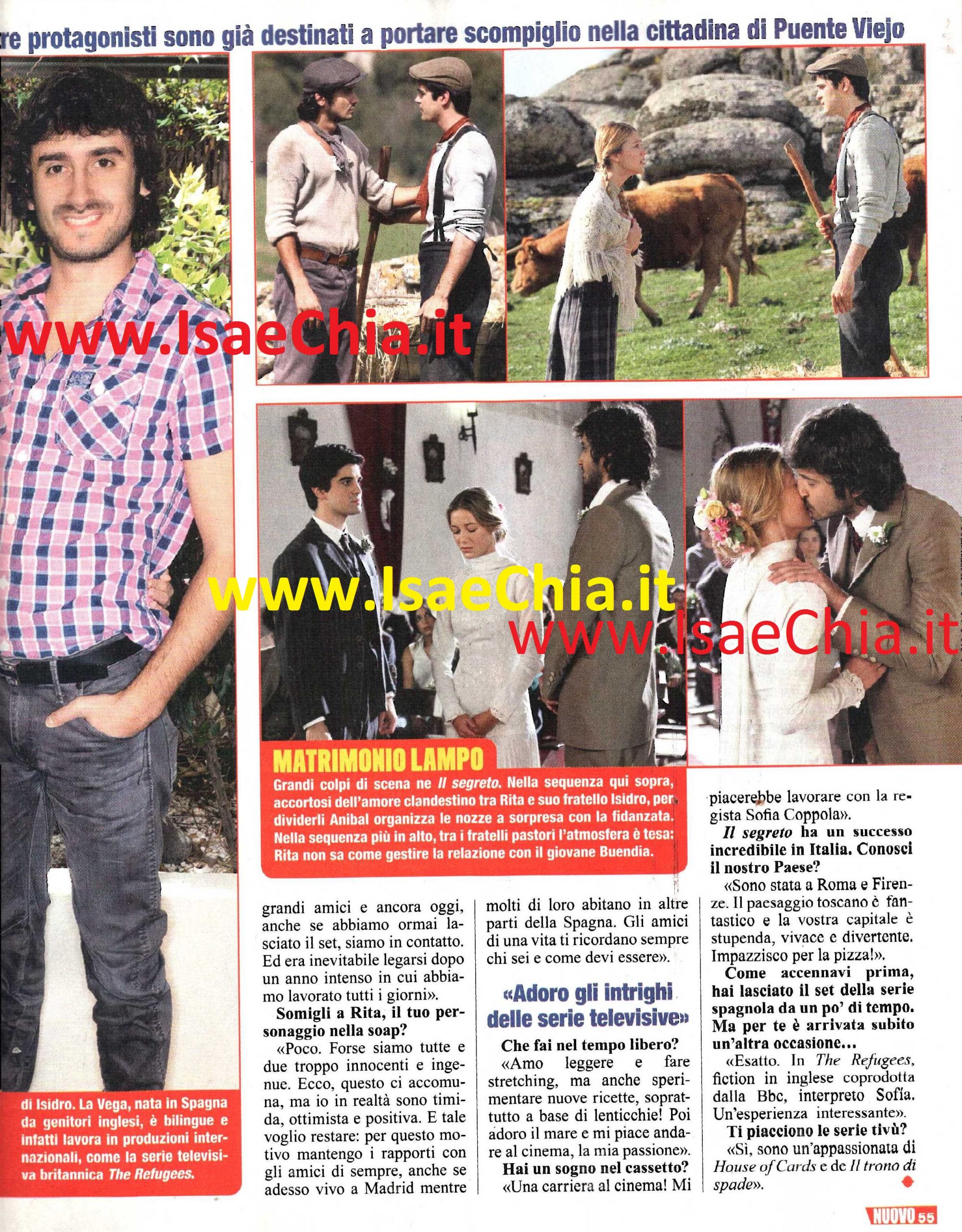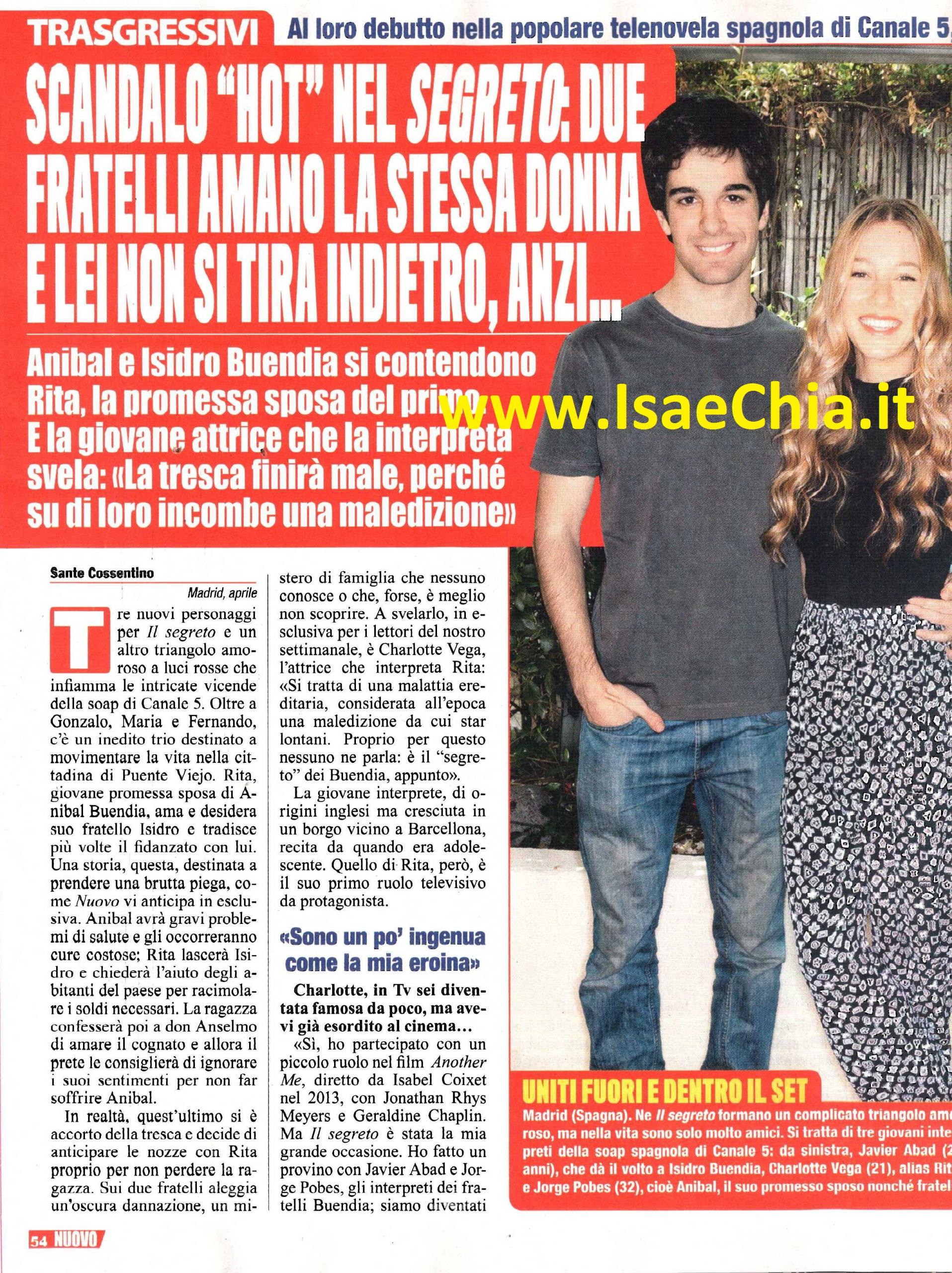 Nell’amatissima soap di Canale 5 Il segreto, tre nuovi personaggi hanno intrecciato un nuovo triangolo amoroso, che segue quello di Maria, Gonzalo e Fernando. Si tratta della bella Rita, contesa tra i due fratelli Anibal e Isidro Buendia. La ragazza, promessa sposa al primo, lo tradisce col il fratello minore. Grazie alle anticipazioni delle puntate già andate in onda in Spagna, sappiamo che Anibal avrà problemi di salute e avrà bisogno di cure costose. Perciò Rita lascerà Isidro e chiederà aiuto agli abitanti del paese per racimolare soldi. Poi confesserà a don Anselmo di essere innamorata del cognato e il prete le consiglierà di ignorare i suoi sentimenti per non far soffrire Anibal. Nel frattempo, però, quest’ultimo si è accorto della tresca e decide di anticipare il matrimonio con Rita proprio per non perderla. Intervistata, Charlotte Vega, l’attrice che interpreta Rita, rivela qual è la maledizione che aleggia sulla famiglia Buendia: “Si tratta di una malattia ereditaria, considerata all’epoca una maledizione da cui stare lontani. Proprio per questo nessuno ne parla: è ‘il segreto’ dei Buendia!“. La 22enne di origini inglesi ma cresciuta Barcellona è diventata popolare grazie a questo ruolo, ma aveva già esordito al cinema: “Sì, ho avuto un piccolo ruolo nel film Another Me, con Jonathan Rhys Meyers, ma Il segreto è stata la mia grande occasione. Ho fatto un provino con Javier Abad e Jordan Pobes, gli interpreti dei fratelli Buendia; siamo diventati grandi amici e ancora oggi, anche se abbiamo ormai lasciato il set, siamo in contatto. Era inevitabile legarsi dopo un anno intero in cui abbiamo lavorato tutti i giorni” racconta. Quando le si chiede se somiglia al suo personaggio, Charlotte risponde: “Poco. Forse siamo tutte e due troppo innocenti e ingenue. Ecco, questo ci accomuna, ma io sono timida, ottimista e positiva. E tale voglio restare: per questo conservo i rapporti con gli amici di sempre, anche se abitano in altre parti della Spagna. Nel tempo libero amo leggere e fare stretching, ma anche sperimentare nuove ricette, adoro il mare e il cinema. Il mio sogno nel cassetto, infatti, è una carriera nel cinema: mi piacerebbe lavorare con la regista Sofia Coppola. Dopo aver lasciato Il segreto, adesso interpreto Sofia in The Refugees, serie in inglese coprodotta con la BBC. Un’esperienza interessante. Mi piacciono le serie tv e sono appassionata di House of Cards e Il trono di spade”.