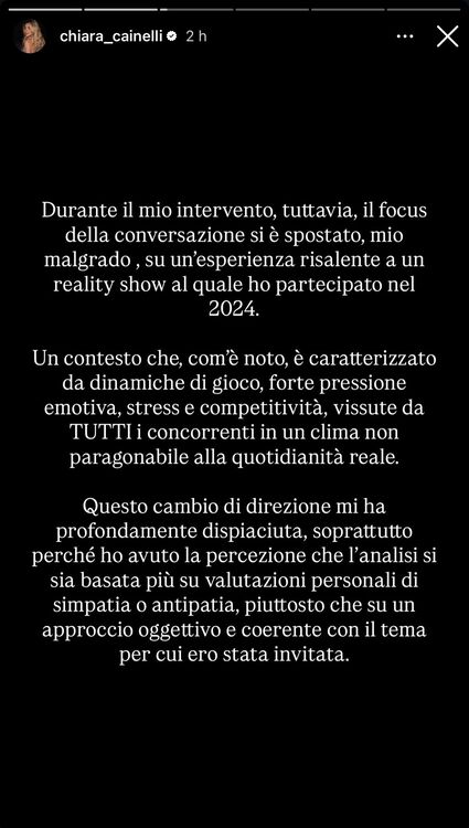 Durante il mio intervento, tuttavia, il focus della conversazione si è spostato, mio malgrado, su un’esperienza risalente a un reality show al quale ho partecipato nel 2024. Un contesto che, com’è noto, è caratterizzato da dinamiche di gioco, forte pressione emotiva, stress e competitività, vissute da TUTTI i concorrenti in un clima non paragonabile alla quotidianità reale. Questo cambio di direzione mi ha profondamente dispiaciuta, soprattutto perché ho avuto la percezione che l’analisi si sia basata più su valutazioni personali di simpatia o antipatia, piuttosto che su un approccio oggettivo e coerente con il tema per cui ero stata invitata.