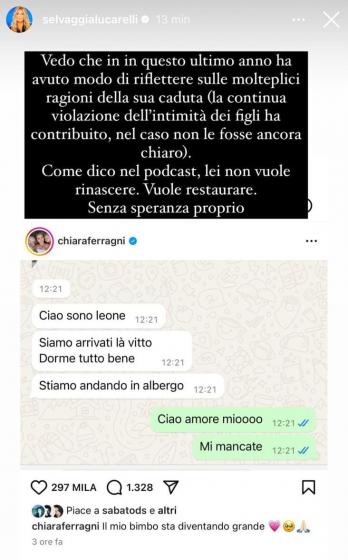 Anche la giornalista e scrittrice Selvaggia Lucarelli ha commentato nelle sue stories Instagram il post con la chat Whatsapp tra Chiara ed il figlio: