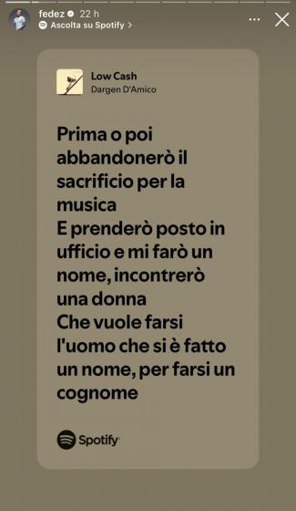 Nelle scorse ore infatti il rapper ha condiviso in una storia Instagram alcune strofe di una canzone di Dargen D’Amico. Parole che sembrerebbero a tutti gli effetti una frecciatina alla Ferragni: