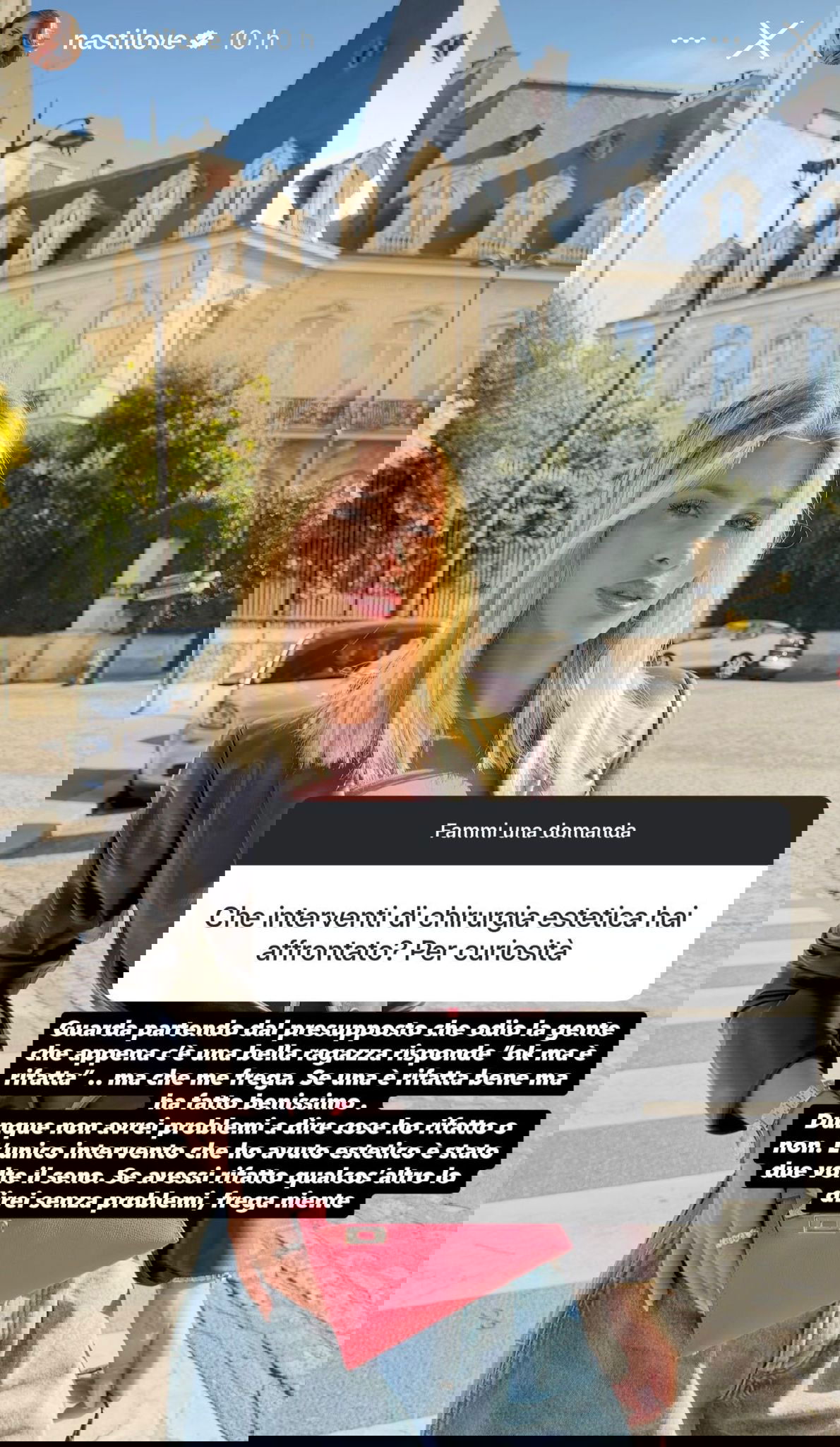 Guarda, partendo dal presupposto che 0dio la gente che appena c’è una bella ragazza risponde “ok, ma è rifatta“, ma che me frega! Se una è rifatta bene ha fatto benissimo. Dunque non avrei problemi a dire cose ho rifatto o non. L’unico intervento che ho avuto estetico è stato due volte il seno. Se avessi rifatto qualcos’altro lo direi senza problemi, frega niente.