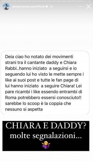 Deia ciao ho notato dei movimenti strani tra il cantante Deddy e Chiara Rabbi. Hanno iniziato a seguirsi e io seguendo lui ho visto le mette sempre i like ai suoi post. Tutte le fanpage di lui hanno iniziato a seguire Chiara! Lei pare ricambi i like, essendo entrambi di Roma potrebbero essersi conosciuti! Sarebbe lo scoop, è la coppia che nessuno si aspetta.