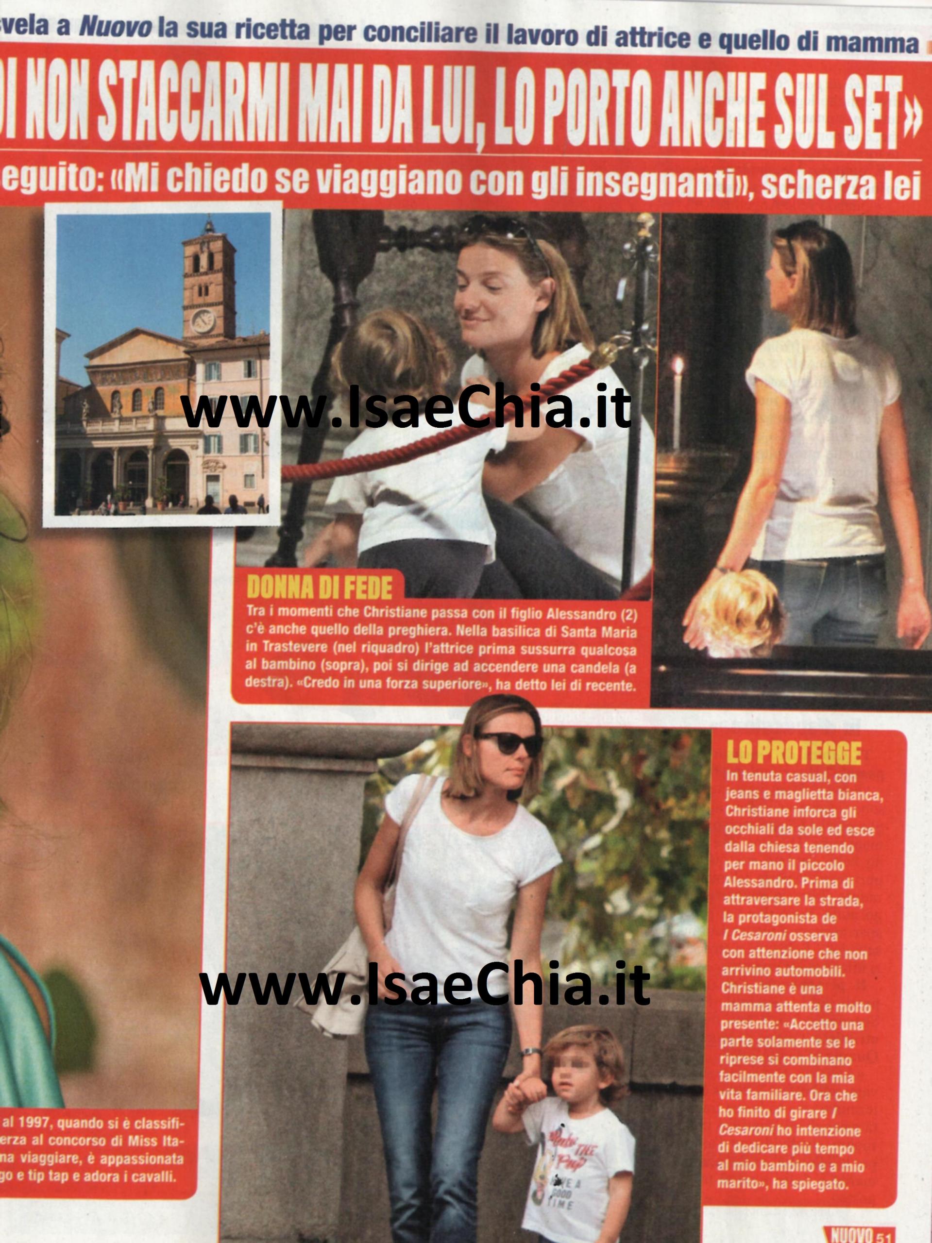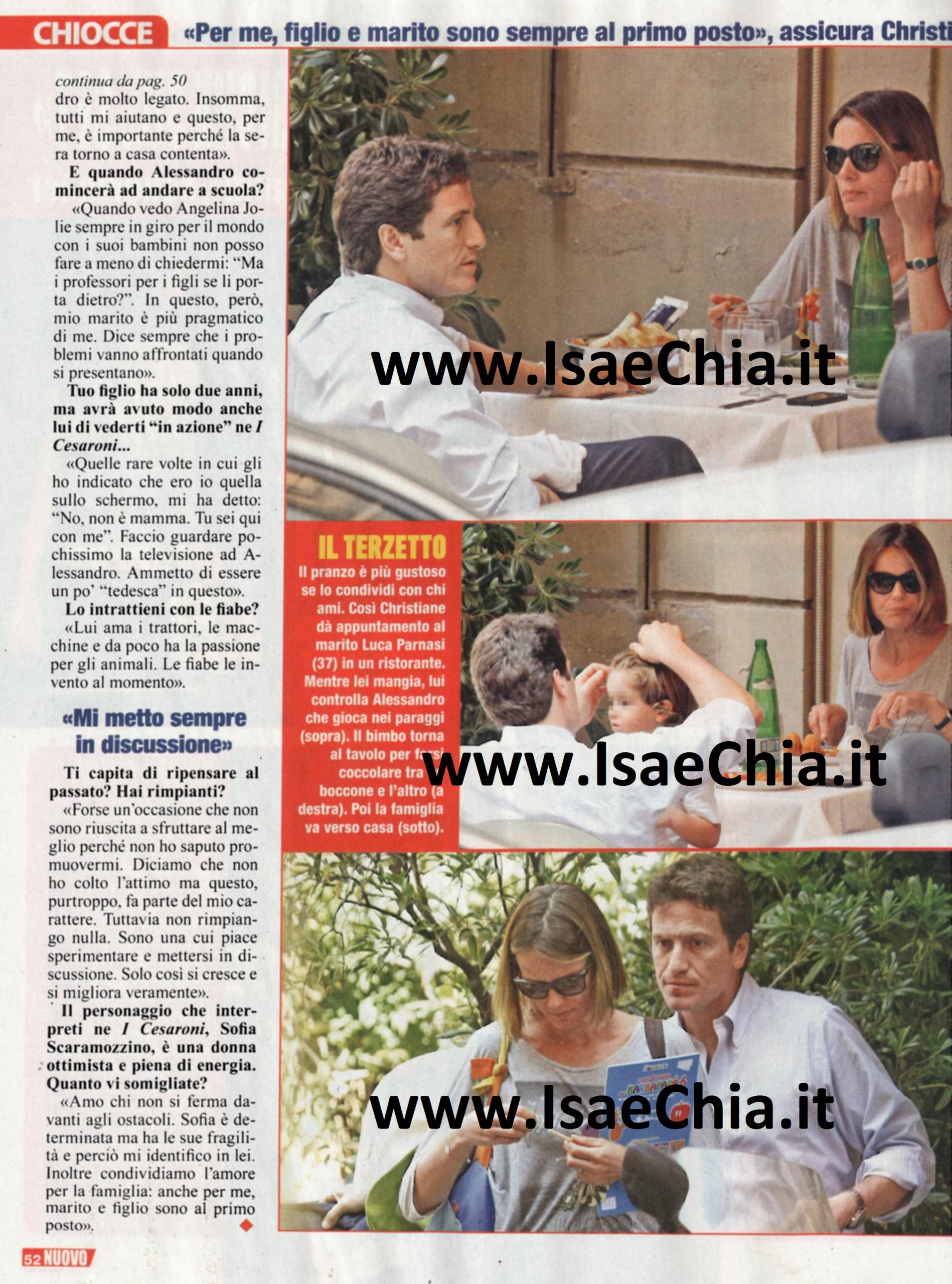 Christiane Filangieri è uno dei volti nuovi nella nuova serie de I Cesaroni: “Il punto forte della serie è che a differenza di tutte le serie americane, non ci sono persone palestrate, ma una famiglia normale, in cui gli Italiani si identificano. I suoi componenti commettono errori, parlano in dialetto, si emozionano” dice lei. Quando le si fa notare che molte sue colleghe attrici hanno dichiarato di provare sensi di colpa per aver lasciato i figli a casa per lavoro, racconta: “Per fortuna mio figlio è ancora piccolo. Mi è capitato di recente di lavorare a Belgrado e l’ho portato con me. I Cesaroni, invece, sono girati a Roma, quindi gioco in casa. Comunque, posso contare sull’aiuto di mia mamma e di mia sorella. E poi c’è la tata, a cui Alessandro è molto affezionato. Quando vedo Angelina Jolie andare in giro per il mondo con tutti i suoi figli dietro, mi chiedo: ‘Ma i professori per i figli se li porta dietro?’. Ma mio marito mi ricorda sempre che per mio figlio non è ancora il momento di pensare alla scuola. Quando gli indico che sono io in tv, mio figlio risponde: “No, non sei tu. Mamma è qui con me”. Ma gli faccio guardare pochissima tv: ammetto di essere “tedesca” in questo” dice la bella attrice di origini bavaresi. Infine, quando le si chiede se ha dei rimpianti del passato, risponde: “Forse un’occasione che non sono riuscita a sfruttare al meglio perché non ho saputo muovermi: non ho colto l’attimo. Tuttavia non rimpiango niente: mi piace sperimentare e mettermi in discussione, perché solo così si cresce e si impara. Amo chi non si ferma davanti agli ostacoli, come Sofia, il personaggio che interpreto ne I Cesaroni. Con lei condivido anche l’amore per la famiglia”.