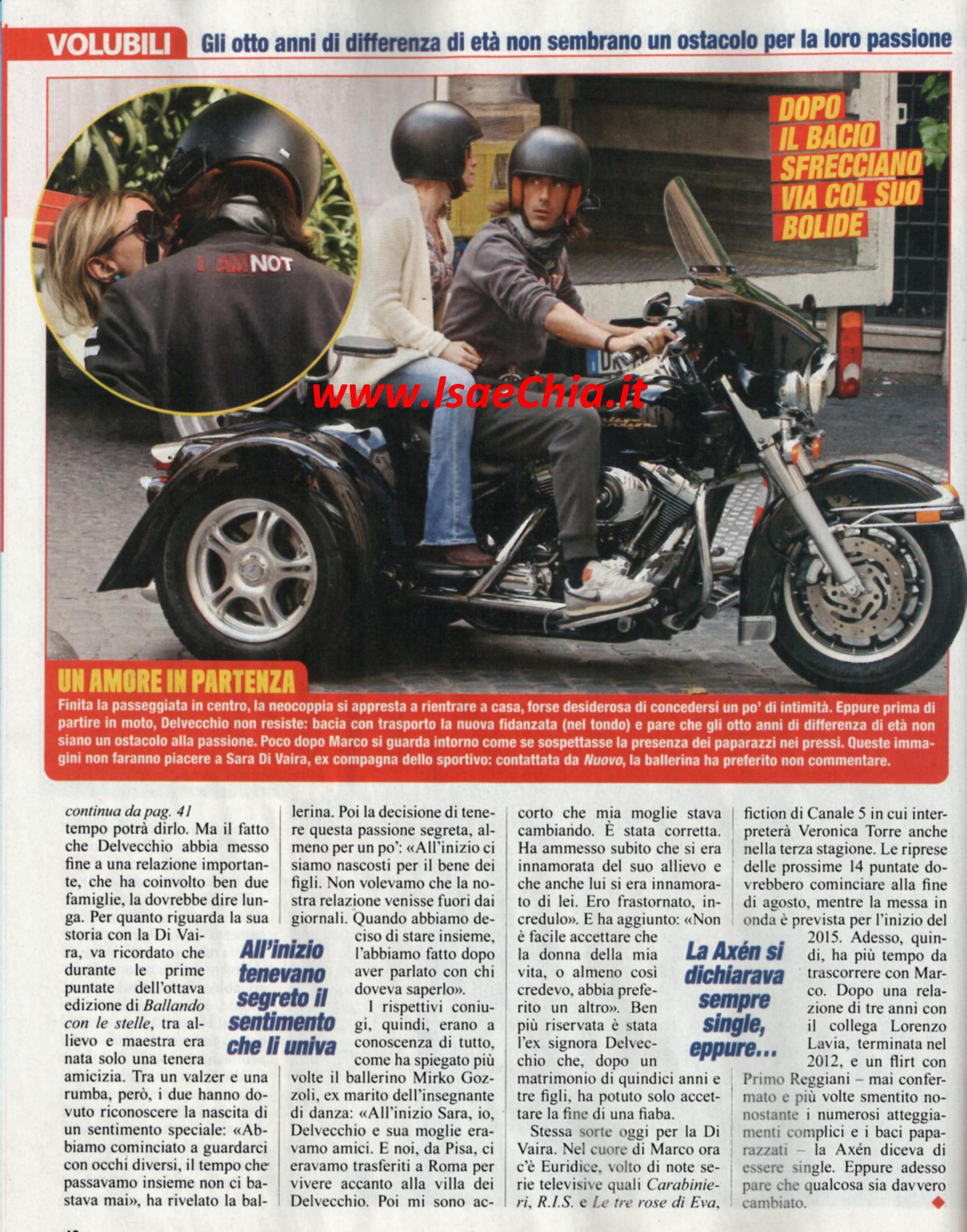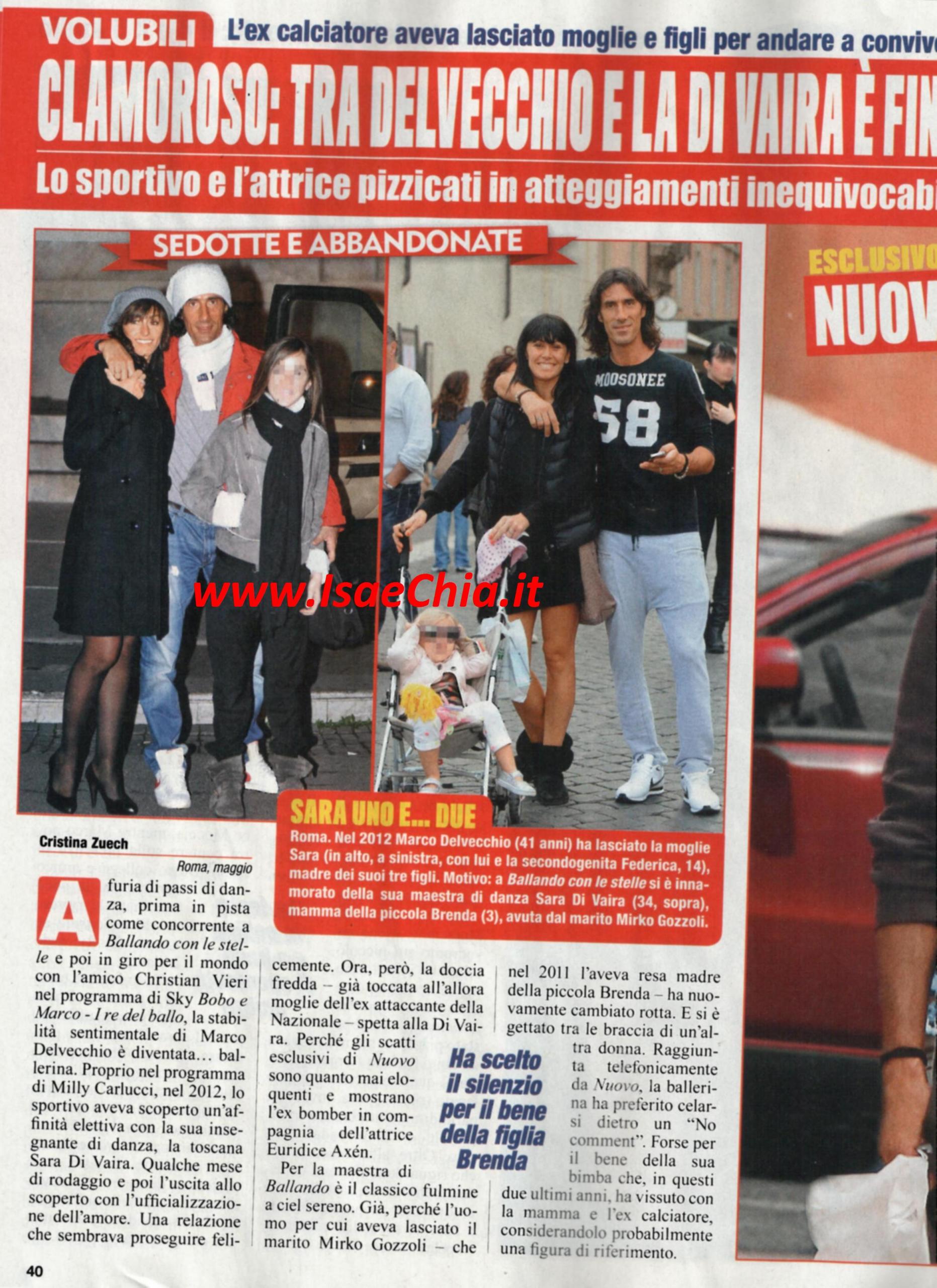 Nel 2012 aveva fatto scalpore la storia del calciatore Marco Delvecchio e la ballerina Sara di Vaira, che, conosciutisi a Ballando con le stelle, a programma concluso avevano lasciato i rispettivi coniugi per vivere il loro amore: lui era sposato da 15 anni e aveva avuto dal matrimonio tre figli; lei dal marito Mirko Gozzoli aveva avuto la piccola Brenda. Ora, un’altra doccia fredda: pare che la loro storia, che finora sembrava procedere a gonfie vele, sia finita. Ecco il calciatore in giro per Roma con l’attrice Euridice Axen (figlia dell’attrice svedese Eva Axen e del bello degli sceneggiati anni ’70 Adalberto Maria Merli), volto di Carabinieri, R.I.S. e Le tre rose di Eva. I due non si preoccupano di occhi indiscreti e vanno in giro a braccetto, poi lui la bacia con trasporto e montano in sella alla moto di lui. La Di Vaira, contattata da Nuovo, ha preferito non commentare.