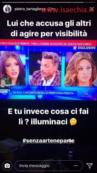 AGGIORNAMENTO – Pietro Tartaglione, fidanzato della Perrotta, a proposito del battibecco avuto dalla sua compagna con Interrante oggi in trasmissione, ha condiviso questa Instagram Stories: