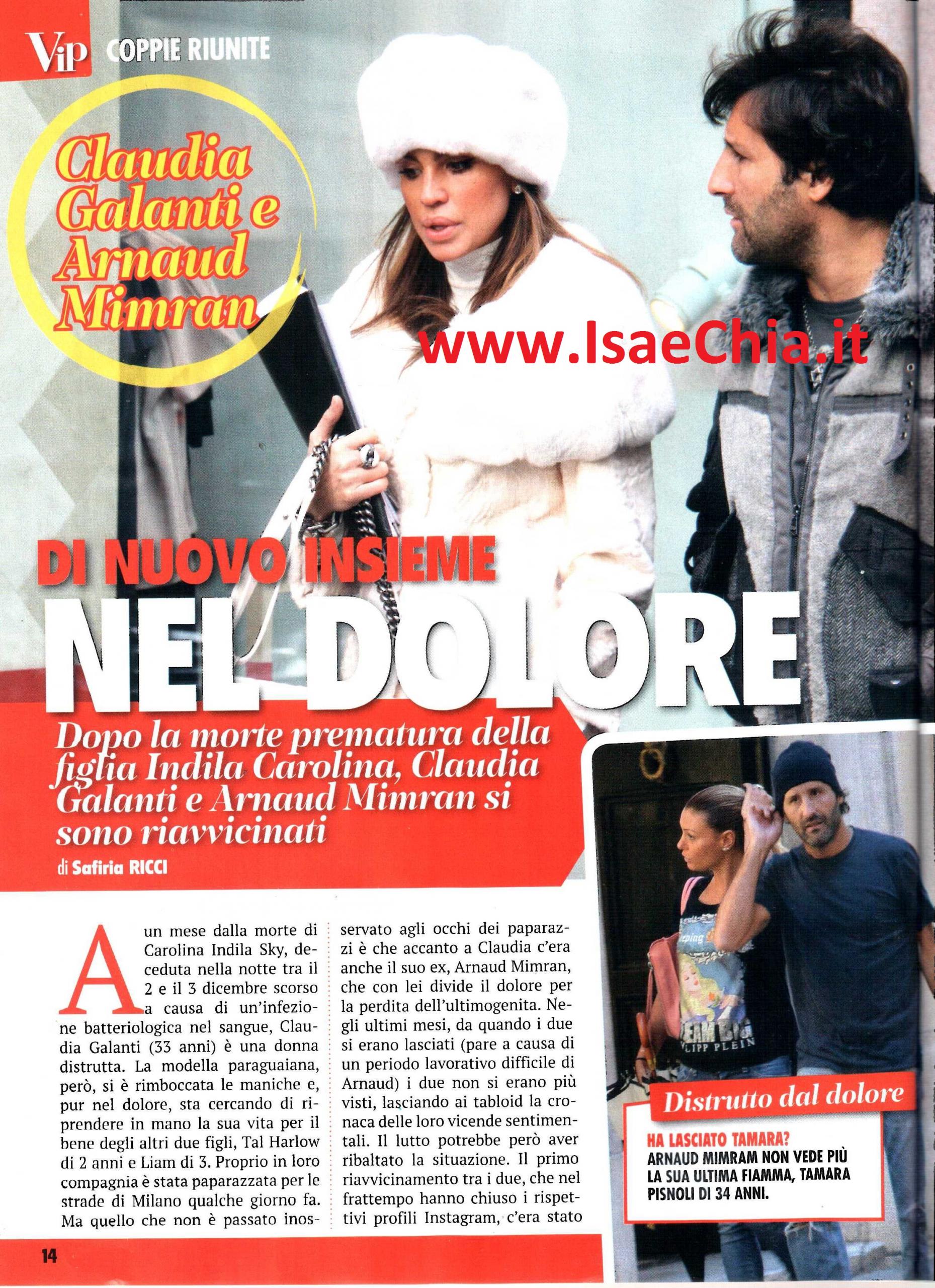 Lo scorso mese, l’ex naufraga dell‘Isola dei famosi Claudia Galanti è stata colpita da una tragedia: la perdita improvvisa della figlia Indila Carolina, di soli nove mesi (QUI l’articolo in cui ne avevamo parlato). Inizialmente la sua morte era stata attribuita a problemi di respirazione o ad un’asfissia nel sonno, probabilmente causata da un rigurgito. Ma la modella ha presto smentito, precisando che la causa era un’infezione del sangue di origine batterica (QUI per leggere la sua smentita). Seppur paralizzata nel suo dolore, la bella paraguaiana sta riprendendo in mano la sua vita, se non altro per il bene dei suoi altri due figli, Tal Harlow e Liam, avuti dall’ormai ex compagno, il ricco imprenditore Arnaud Mimran. Negli ultimi mesi, infatti, Claudia e Arnaud si erano improvvisamente separati (secondo alcuni per un periodo lavorativamente difficile per lui, secondo altri per infedeltà) e non si erano più visti. Eppure, i due si sono ritrovati a condividere un unico, grande dolore. Il primo riavvicinamento tra i due, che nel frattempo hanno chiuso i propri profili Instagram, c’era stato alcune settimane fa, proprio quando i genitori di Indila Carolina avevano firmato un comunicato stampa per spiegare le cause del decesso della loro bimba. Adesso, i due sono stati fotografati di nuovo insieme: al fianco di lui non c’è più Tamara Pisnoli, l’ex moglie di Daniele De Rossi, ma c’è di nuovo Claudia, avvolta da una pelliccia bianca, che ha lasciato la casa di Parigi, piena di tristi ricordi, e ha fatto ritorno a Milano. I due sono apparsi tristi, ma uniti come quando erano una famiglia. E non si sa mai che non vogliano ripartire da dove erano rimasti, ossia da quelle nozze annunciate e mai celebrate.