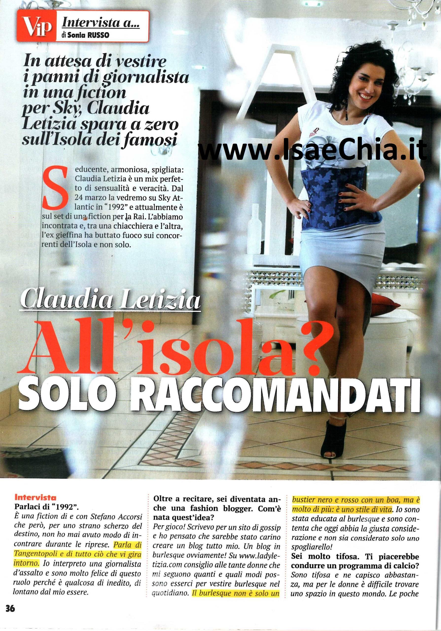 Vi ricordate Claudia Letizia, la sexy mamma burlesque del Grande Fratello 12? Dopo un periodo di assenza dalle scene, è pronta a tornare, e nel migliore dei modi: dal 24 marzo, la vedremo su Sky Atlantic in 1992 ed è sul set di una fiction per la Rai. “1992 è una fiction con e di Stefano Accorsi che però, per uno strano scherzo del destino, non ho avuto modo di incontrare durante le riprese. Parla di Tangentopoli ed io interpreto una giornalista d’assalto e sono contenta di questo ruolo, perché è qualcosa di nuovo, lontano dal mio essere“. Ma oltre a fare l’attrice, Claudia è diventata anche fashion blogger. Quando le si chiede come è successo, risponde: “E’ successo per gioco! Scrivevo per un sito di gossip e ho pensato che sarebbe stato carino creare un blog tutto mio. Su www.ladyletizia.com consiglio alle donne che mi seguono i modi per vestirsi burlesque anche nel quotidiano. Il burlesque non è solo bustini e boa, è molto di più, è uno stile di vita e sono contenta che oggi non sia più considerato solo uno spogliarello. Sono tifosa di calcio e ne capisco abbastanza, ma per una donna è difficile trovare uno spazio in questo mondo. Poi ti ci ritrovi le fidanzate dei calciatori e sono proprio loro a farci perdere la visibilità. Guarda Ilaria D’Amico: da quando è fidanzata con Gigi Buffon è passata da giornalista sportiva a barzelletta“. Parlando di tv, quando le si chiede se sta seguendo l’Isola dei famosi, Claudia risponde: “Ci ho provato, ma mi annoia da morire! So solo che Rocco Siffredi si sta deperendo e mi dispiace moltissimo perché è l’unico vero famoso sull’Isola. Ad esempio, Cristina Buccino. Che cosa ha fatto? Da dove arriva? Cecilia Rodriguez è la sorella di Belén, ma non ha niente a che vedere con lei. Belén è molto sensuale, mentre Cecilia la trovo volgare. Persino la Buccino è più bella di lei . Penso che se non portasse il cognome della sorella maggiore, non sarebbe da nessuna parte. Raccomandata? Assolutamente. Anche Belén lo era, ma almeno è talentuosa, sua sorella nemmeno quello. Non è una novità comunque. Le persone che lavorano in tv senza raccomandazione sono pochissime. Io raccomandata? Ma magari! Non faccio la moralista, non mi è mai capitata l’occasione. Infatti faccio solo piccole cose. Sono come il prezzemolo: sta ovunque ma in piccole dosi. Mi piace The Voice. In giro si dice che se non si porta il padre Roby dietro, Francesco Facchinetti non sia in grado di fare niente. Ma io l’ho conosciuto e posso dire che tra “i figli di” è l’unico che ha senso di esistere“. Infine, quando le si chiede del suo rapporto con i social, spiega: “E’ ottimo, li gestisco da sola e mi piace cosa la gente pensa di me. Al Grande fratello non ero capita, oggi ricevo complimenti sia da uomini che da donne e sono proprio queste ultime la mia forza!“