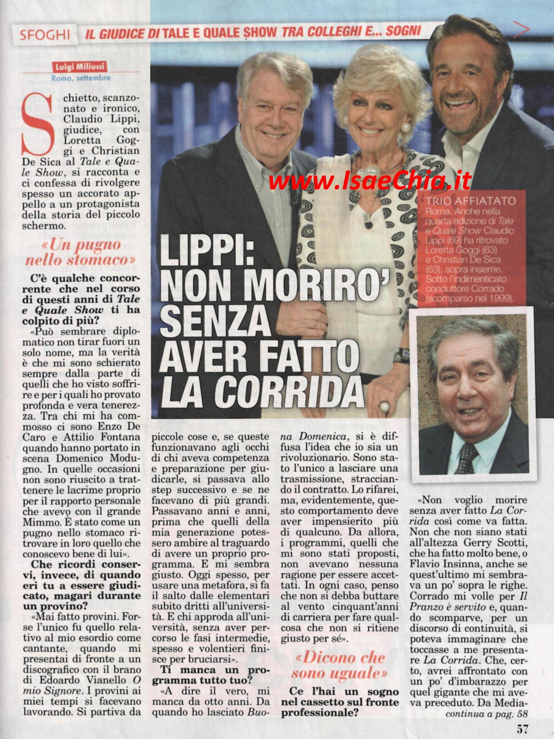 Il conduttore Claudio Lippi è uno dei tre giudici di Tale e quale show, insieme a Loretta Goggi e Christian De Sica. Quando gli si chiede se qualcuno dei concorrenti lo ha colpito in modo particolare, risponde: “Potrei sembrare diplomatico se non tiro fuori un nome, ma la verità è che mi sono sempre schierato dalla parte di chi ho visto soffrire, per cui ho provato tenerezza. In passato mi sono commosso con Enzo De Caro e Attilio Fontana quando hanno imitato il grande Domenico Modugno: con entrambi mi sono commosso, per il rapporto di amicizia che avevo con Mimmo”. Ripercorrendo invece la sua carriera, invece, racconta: “Ai miei tempi non c’erano provini, si facevano lavorando. Si partiva da piccole cose e se queste andavano bene a chi di competenza, allora si passava agli step successivi; ci volevano anni, ma era giusto così. Oggi si fa spesso il salto dalle elementari all’Università, saltando i passaggi intermedi. Da quando ho lasciato Buona domenica, otto anni fa, mi manca un programma tutto mio. Sono stato l’unico ad aver lasciato la trasmissione stracciando il contratto, così il mio comportamento deve aver impensierito più di qualcuno. I programmi che mi sono stati proposti non avevano ragione di essere accettati. Il mio sogno? Non voglio morire senza fare la Corrida così come va fatta. Non che non l’abbiano fatta bene Gerry Scotti o Flavio Insinna, anche se quest’ultimo era un po’ sopra le righe. Corrado volle me per Il pranzo è servito e quando scomparve, per continuità, si poteva pensare a me. Mediaset, però, mi disse che ero troppo uguale e non ho ancora capito cosa volesse dire. Ogni tanto mi ritrovo a pregare Corrado e gli dico: “Solo tu puoi fare qualcosa! Illumina la testa di questi!”. Ma i rapporti con Mediaset non sono più ottimi…”