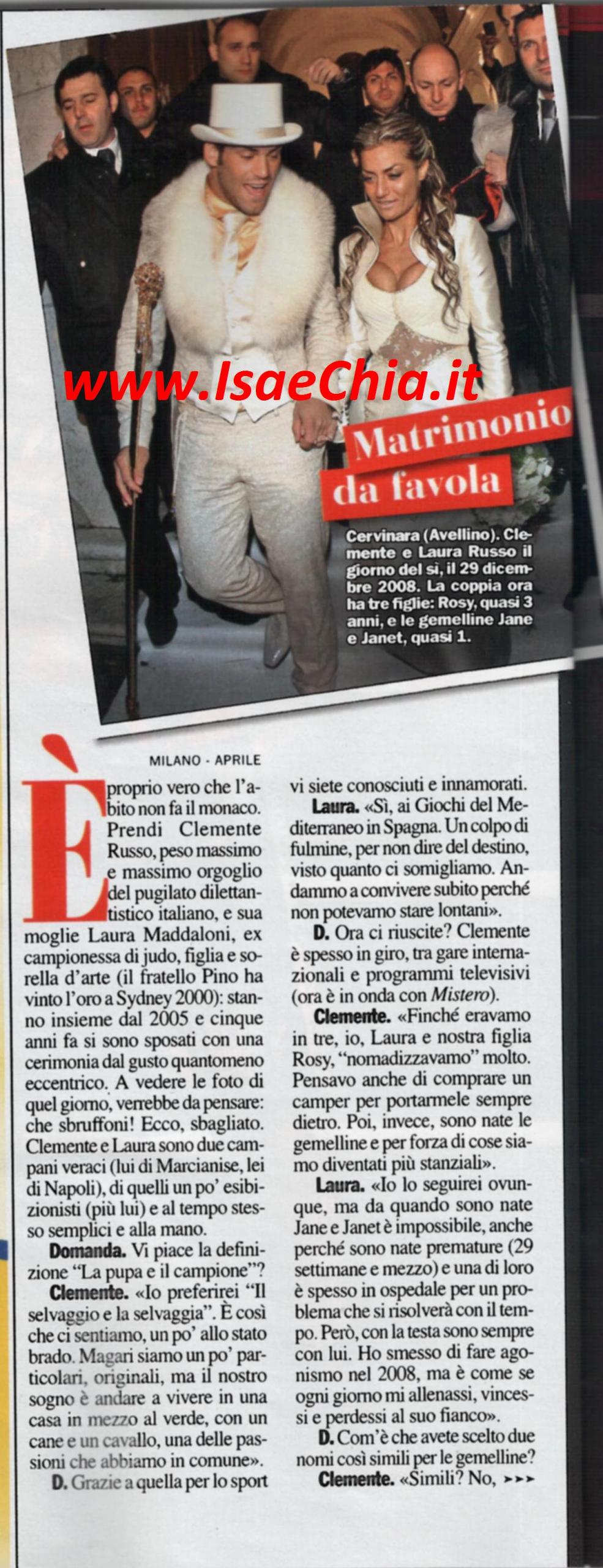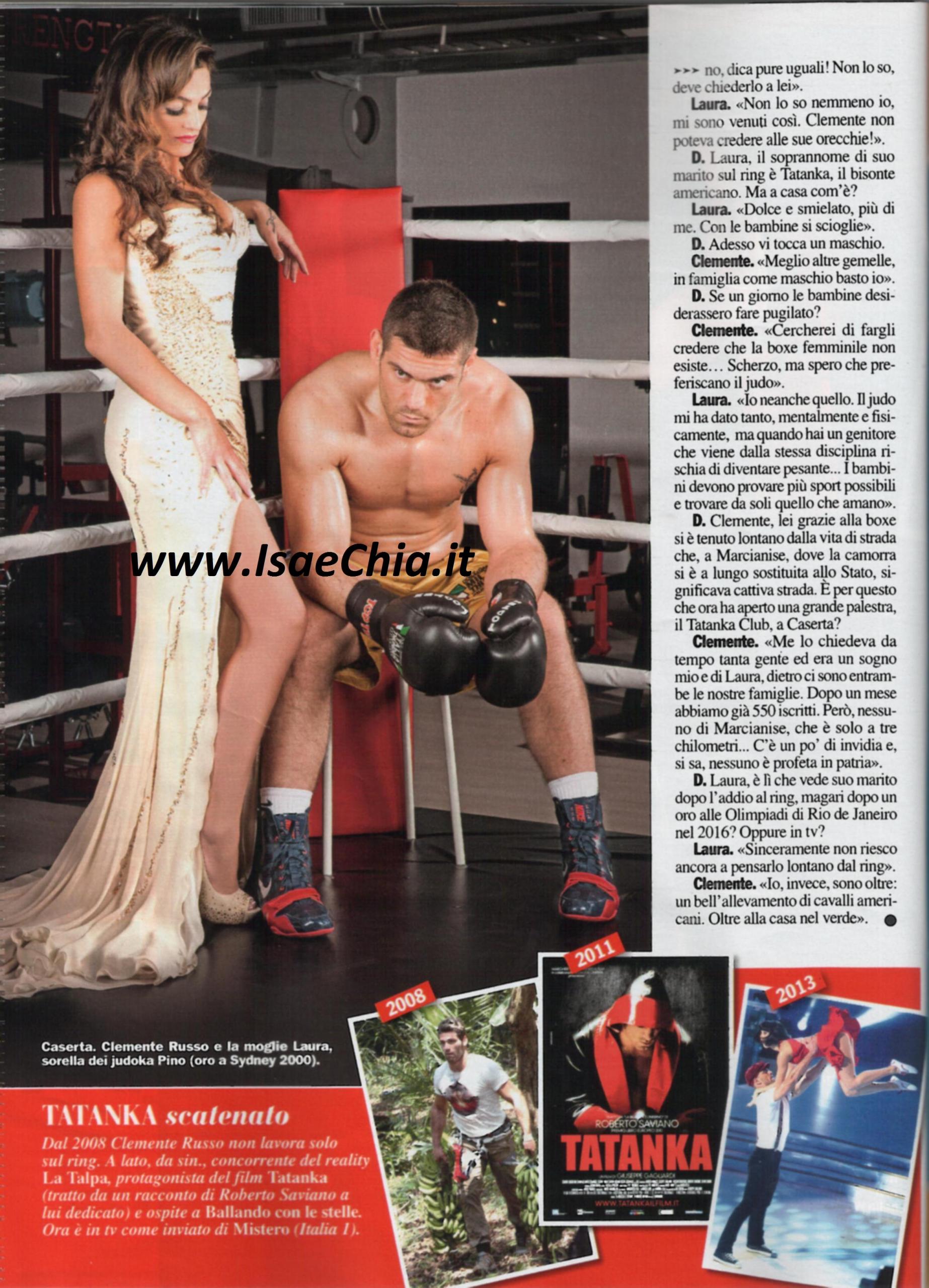 A vedere le foto del loro matrimonio di cinque anni fa, si direbbe che Clemente Russo e Laura Maddaloni sono due sbruffoni. Quando gli si propone la definizione “la pupa e il campione”, lui risponde: “Preferirei “il selvaggio e la selvaggia”: è così che ci sentiamo e il nostro sogno è andare a vivere in una casa in mezzo al verde, con un cane e un cavallo” dice il campione di pugilato, mentre lei racconta: “Ci siamo conosciuti ai Giochi dei Mediterraneo in Spagna; è stato un colpo di fulmine e siamo andati a convivere subito”. Ora che lui è sempre in giro tra gare internazionali e il programma Mistero, però, sono diventati stanziali: “Prima eravamo più nomadi, quando avevamo solo Rosy, ma con l’arrivo delle gemelline è impossibile. Una di loro è spesso in ospedale perché sono nate prematuramente. Però con la testa sono sempre con lui. Ho smesso di fare agonismo nel 2008, ma è come se ogni giorno mi allenassi con lui”. Quando le si chiede se lui è così duro anche a casa, lei risponde: “No, è dolce e smielato, più di me. Con le figlie si scioglie”. Quando si chiede loro come reagirebbero se le figlie volessero seguirli nel loro sport, Clemente dice: “Cercherei di fargli credere che la boxe femminile non esiste! Al pugilato preferirei il judo”, mentre Laura risponde: “Io nemmeno quello. Quando i tuoi genitori vengono dalla tua stessa disciplina, si rischia di diventare pesanti; preferirei che provassero altri sport”. Clemente si è tenuto lontano dalla vita di strada grazie allo sport e ha aperto una palestra a Caserta: “Ce la chiedevano in tanti: in un mese abbiamo 550 iscritti. Però nessuno del mio paese, Marcianise, che è a pochi chilometri. C’è un po’ d’invidia”.