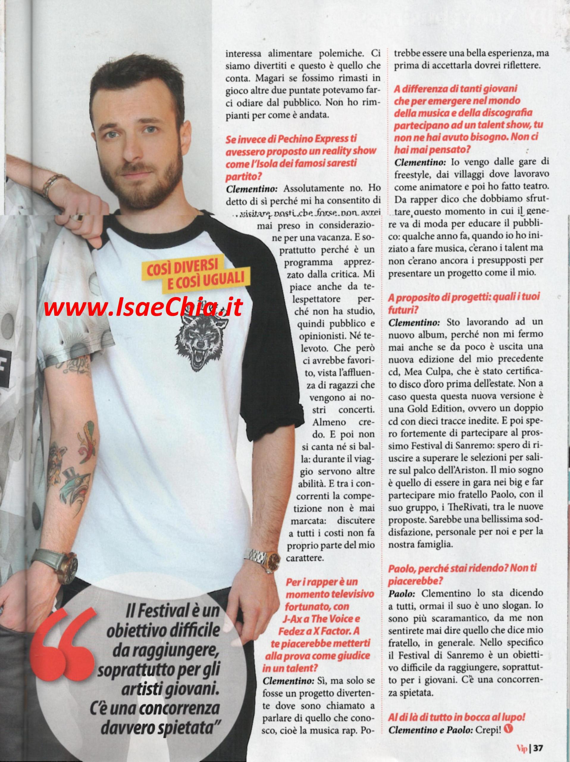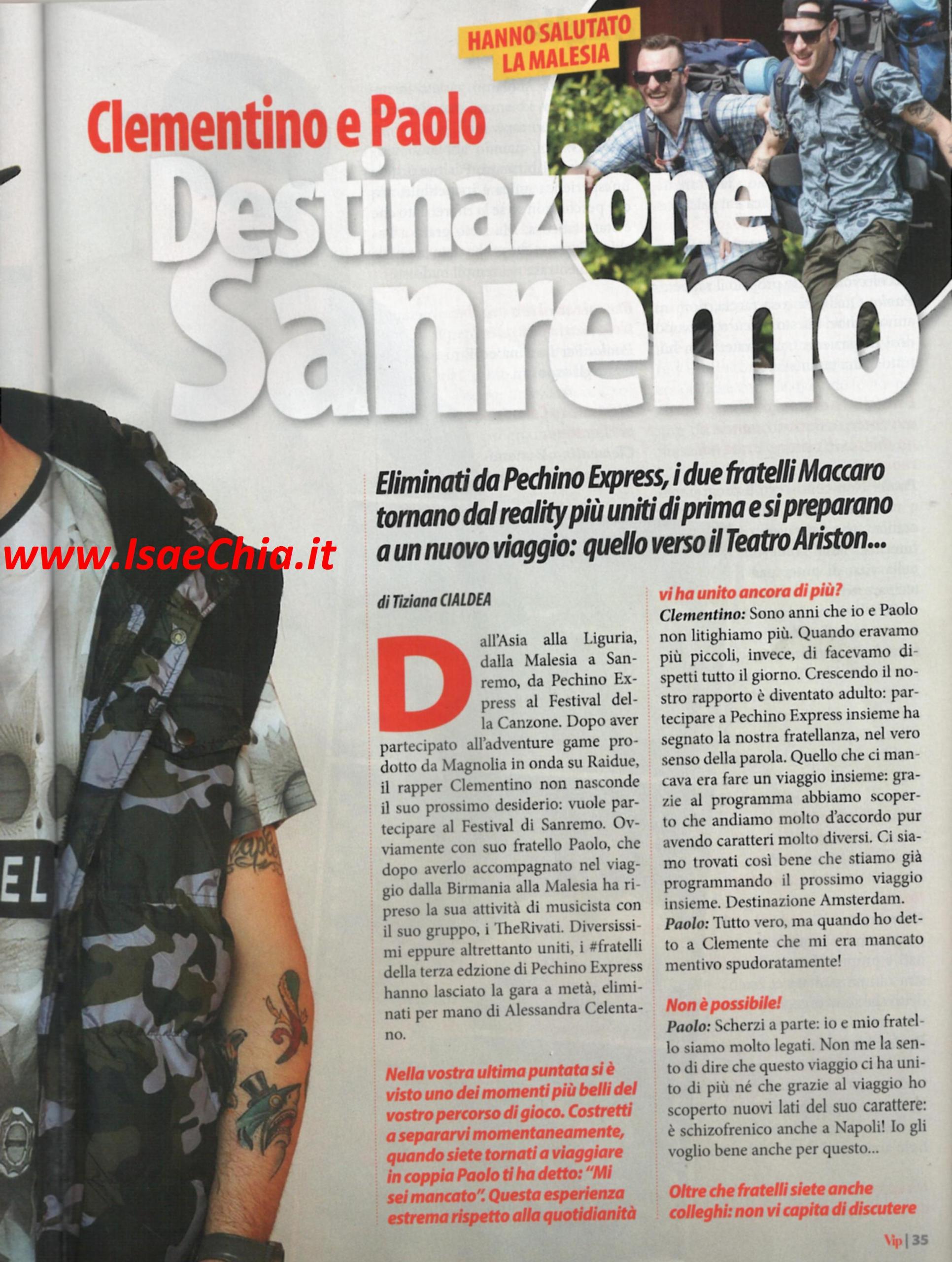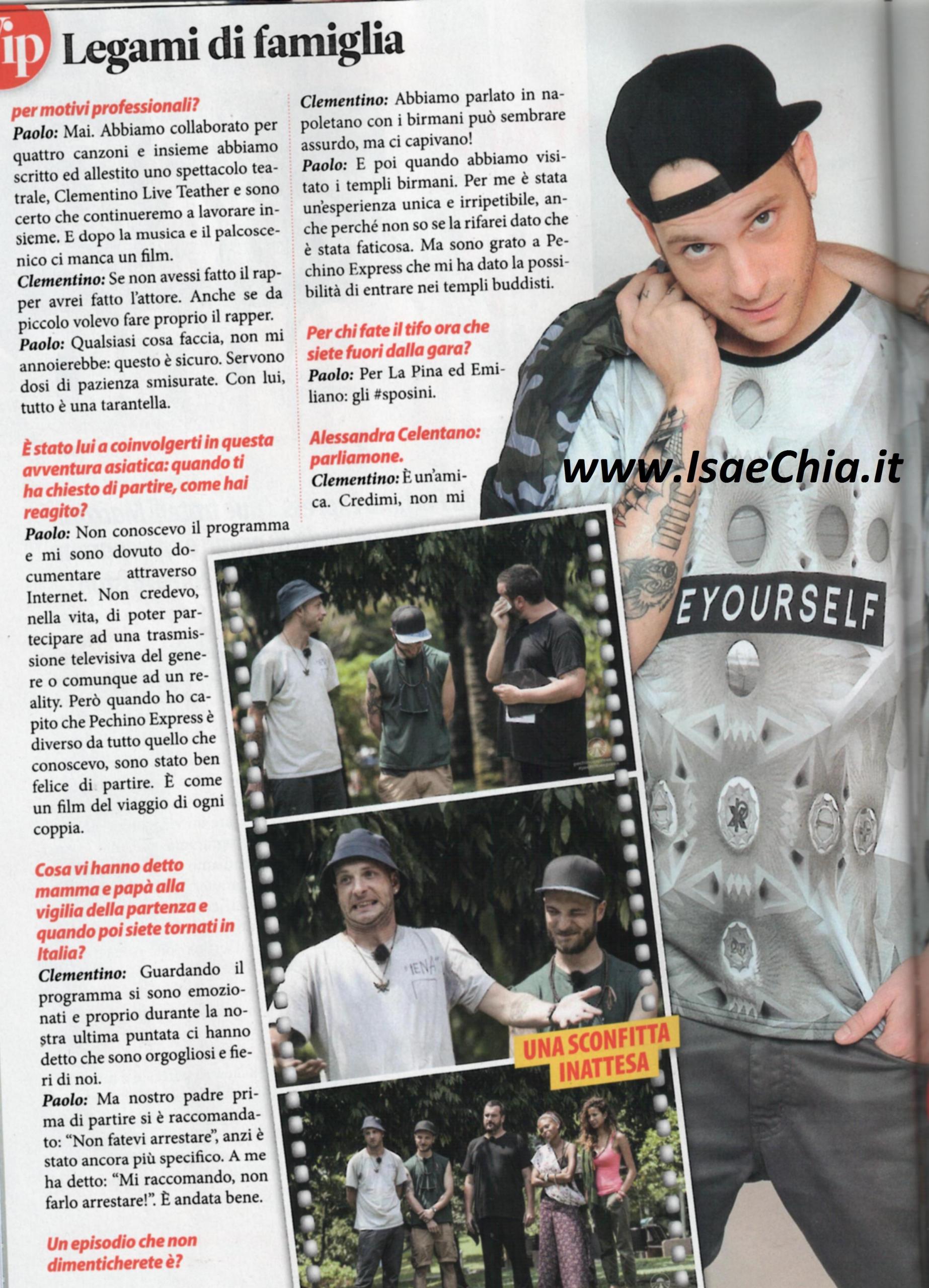 I Fratelli di Pechino Express, ossia la coppia formata dal rapper napoletano Clementino e suo fratello Paolo Maccaro, si sono fermati a metà gara, eliminati per mano dell’insegnante di Amici Alessandra Celentano. Quando i due si sono ritrovati dopo esser stati momentaneamente separati per una regola del gioco, si sono detti: “Mi sei mancato”. Oggi, infatti, i due raccontano il loro rapporto:” Sono anni che non litighiamo, ma quando eravamo più piccoli, invece, ci facevamo i dispetti tutti i giorni. Partecipare a Pechino Express ha segnato la nostra fratellanza, quello che ci mancava era fare un viaggio insieme: grazie al programma abbiamo scoperto che andiamo molto d’accordo anche se abbiamo caratteri molto diversi. Ci siamo trovati così bene che stiamo programmano il prossimo viaggio insieme: Amsterdam” rivela Clemente. Paolo però, osserva: “Non me la sento di dire che il viaggio ci ha uniti di più o che ho scoperto altri lati del suo carattere: è schizofrenico anche a Napoli! Io gli voglio bene anche per questo!”. I due, oltre che fratelli, sono anche colleghi di lavoro: “Abbiamo collaborato per 4 canzoni e lo spettacolo teatrale Clementino Live Theatre. Qualsiasi cosa faccia, Clementino non mi annoierebbe, questo è sicuro, ma servono dosi di pazienza smisurate: con lui, tutto è una tarantella”. Anche per Pechino Express, infatti, è stato lui a fare la proposta: “Non conoscevo il programma e mi sono documentato su internet. Non credevo di poter partecipare a un reality o a una trasmissione del genere nella vita, ma Pechino Express è diverso da tutto ciò che conoscevo e sono stato felice di partire. I nostri genitori si sono emozionati guardandolo e alla fine dell’ultima puntata ci hanno detto che sono orgogliosi i noi. Prima di partire, invece, papà ha detto: “Non fatevi arrestare!”. L’episodio che non dimenticheremo? Abbiamo parlato napoletano coi birmani e …Incredibile, ma ci capivano! E poi, quano abbiamo visto i templi birmani”. Parlando degli altri concorrenti, rivelano: “Tifiamo per gli Sposini, La Pina ed Emiliano Pepe. Alessandra Celentano è un’amica, non mi interessa alimentare polemiche. Ci siamo ivertiti e questo è quello che conta. Magari se fossimo rimasti altre due puntate, ci saremmo fatti odiare dal pubblico!”. Quando gli si chiede se avrebbe partecipato al atri reality o talent, Clementino risponde: “Assolutamente no. Pechino Express l’ho preso in considerazione perché piace al telespettatore e alla critica, non ha studio, opinionisti, né televoto, che forse, dati i ragazzini che vengono ai nostri concerti, ci avrebbe favorito. Non si canta né si balla, servono altre abilità e la competizione non è mai marcata. Come giudice accetterei, ma solo se fosse un progetto divertente, in cui devo parlare di ciò che conosco, cioè la musica rap”. Infine, qualche progetto futuro: “E’ in uscita la nuova edizione del mio cd Mea culpa e sto lavorando all’album nuovo. E poi spero fortemente i partecipare al prossimo Festival di Sanremo: spero di riuscire a superare le selezioni. Il mio sogno è partecipare come Big e far partecipare mio fratello Paolo, con il suo gruppo, i TheRivati, tra le nuove proposte. Sarebbe una bellissima soddisfazione, personale e per la nostra famiglia” . Ma Paolo ride: “Clementino lo sta dicendo a tutti! Io sono più scaramantico. Il festival è un obiettivo difficile da raggiungere, soprattutto per i giovani, c’è una concorrenza spietata!”