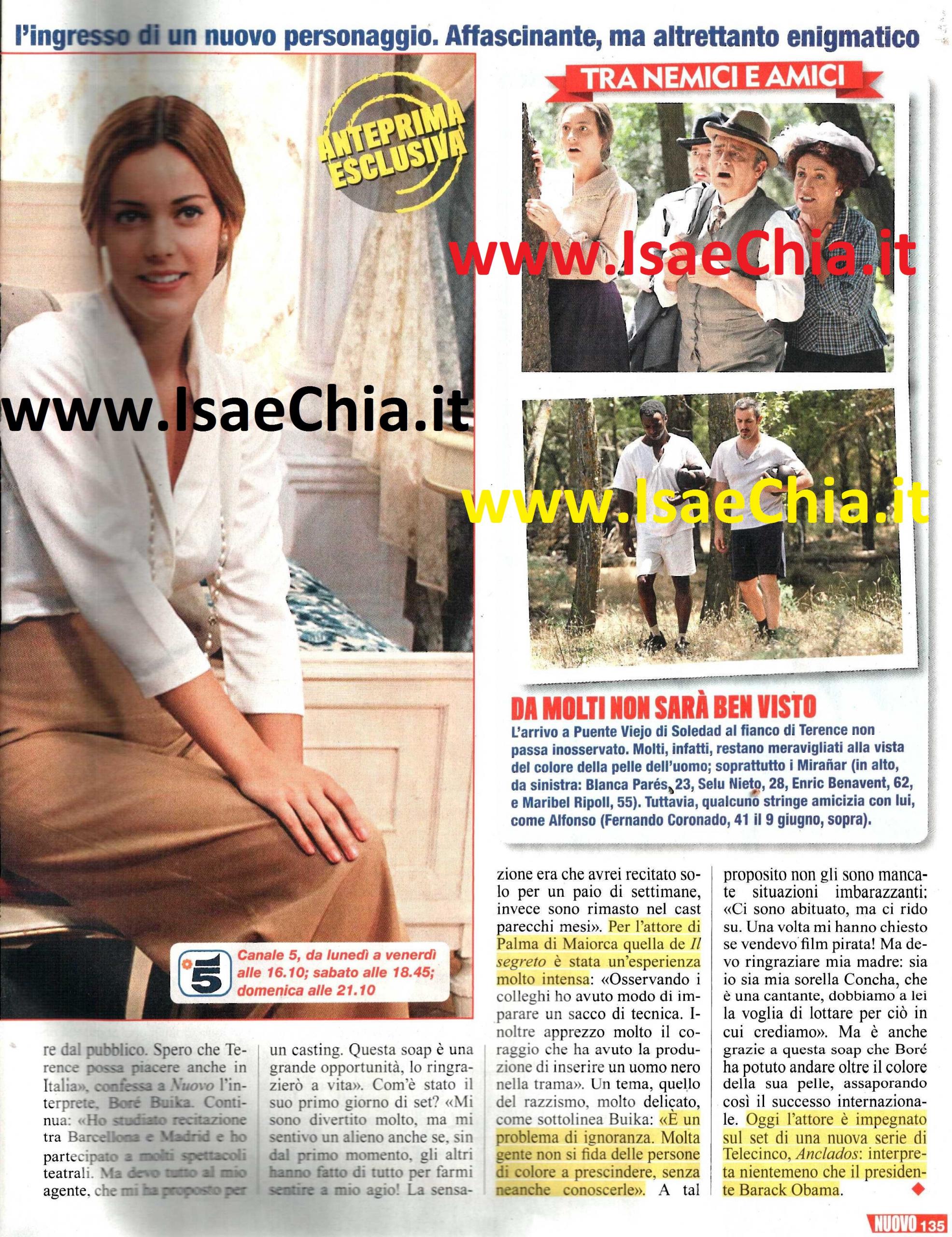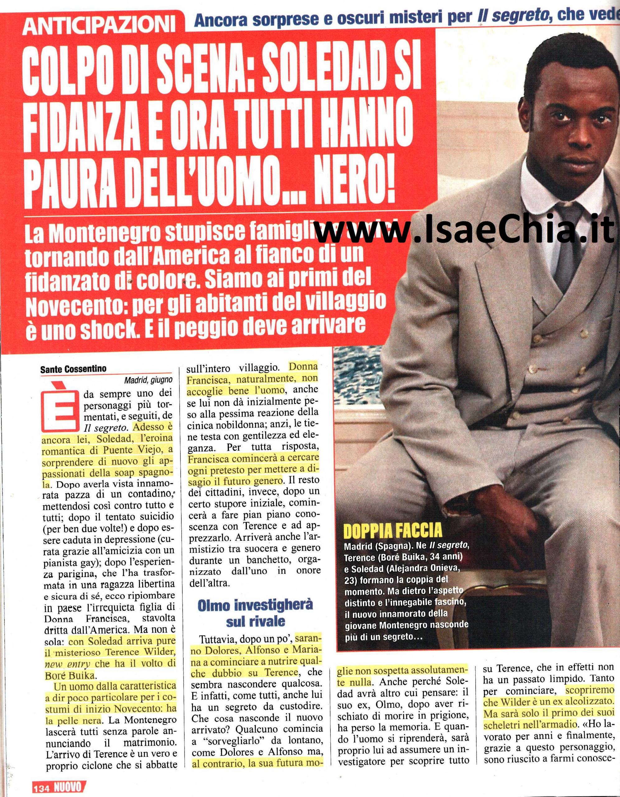Con Soledad arriverà il misterioso Terence Wilder, un uomo che ha una caratteristica particolare per i primi del Novecento: ha la pelle nera. E la giovane Montenegro lascerà tutti senza parole annunciando il matrimonio con lui. La madre di Soledad, donna Francisca, ovviamente, non accoglie bene l’uomo, anche se lui, inizialmente, non dà peso alla reazione della nobildonna, anzi, le tiene testa con gentilezza ed eleganza. Per tutta risposta, Francisca cercherà ogni pretesto per mettere a disagio il futuro genero. Il resto dei cittadini, dopo uno stupore iniziale, comincerà a fare conoscenza con Terence e ad apprezzarlo. Tuttavia, dopo un po’, saranno Dolores, Alfonso e Mariana ad avere dei dubbi su Terence, che sembra nascondere qualcosa. E infatti, come tutti i personaggi della soap, anche lui ha un segreto da custodire. Dolores e Alfonso cominciano a sorvegliarlo da lontano, mentre Soledad non sospetta di nulla. Anche perché avrà altro a cui pensare: il suo ex, Olmo, dopo aver rischiato di morire in prigione, ha perso la memoria. E quando la recupererà, sarà proprio lui ad assumere un investigatore per scoprire tutta la verità su Terence. Tanto per cominciare, scopriremo che il nuovo fidanzato di Soledad è un ex alcolizzato, ma sarà solo il primo dei suoi scheletri nell’armadio. “Ho lavorato per anni e finalmente, grazie a questo personaggio, sono riuscito a farmi conoscere dal pubblico. Spero che Terence possa piacere anche in Italia” dice l’attore Boré Buika, che presta il volto al personaggio. “Ho studiato recitazione tra Barcellona e Madrid e ho preso parte a molti spettacoli teatrali, ma devo tutto al mio agente, che mi ha proposto il casting. Questa soap è una grande opportunità e lo ringrazierò a vita. Il primo giorno sul set mi sono divertito molto, anche se mi sentivo un alieno! La sensazione era che avrei recitato solo un paio di settimane, invece sono rimasto nel cast parecchi mesi! Osservando i colleghi ho avuto modo di imparare un sacco di tecnica. Inoltre apprezzo il coraggio della produzione di inserire un uomo di colore nella trama. Il razzismo è un problema di ignoranza. Molta gente non si fida delle persone a prescindere, senza conoscere. Sono abituato alle situazioni imbarazzanti: una volta mi hanno chiesto se vendevo film pirata! Ma devo ringraziare mia madre: io e mia sorella Concha, che è una cantante, dobbiamo a lei la voglia di lottare per ciò in cui crediamo“. E a quanto pare, ha fatto bene: dopo Il segreto, Boré è ora sul set di un’altra serie di Telecinco, Anclados, in cui interpreterà addirittura il Presidente Barack Obama.