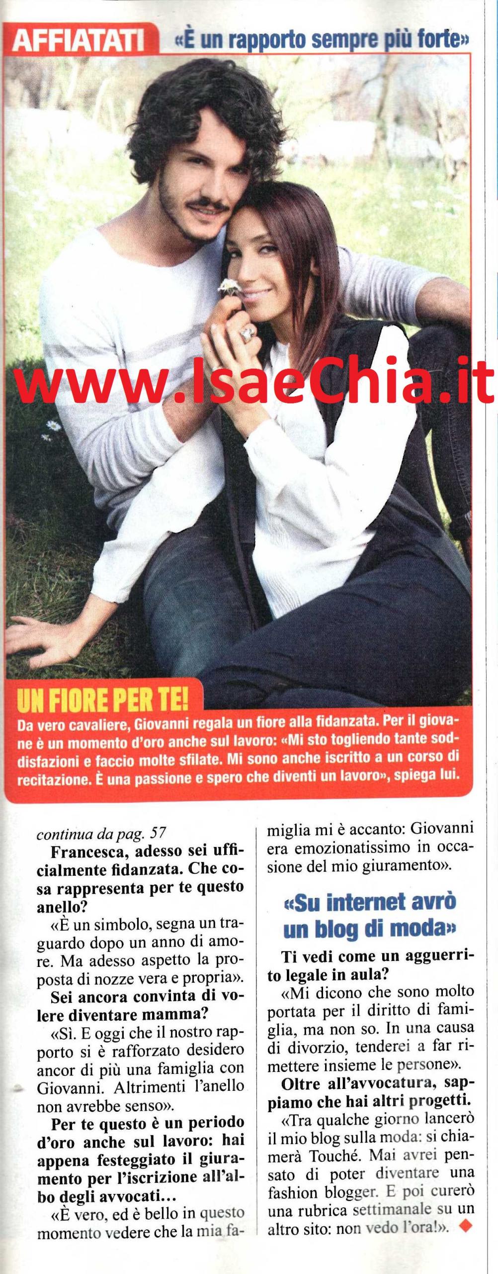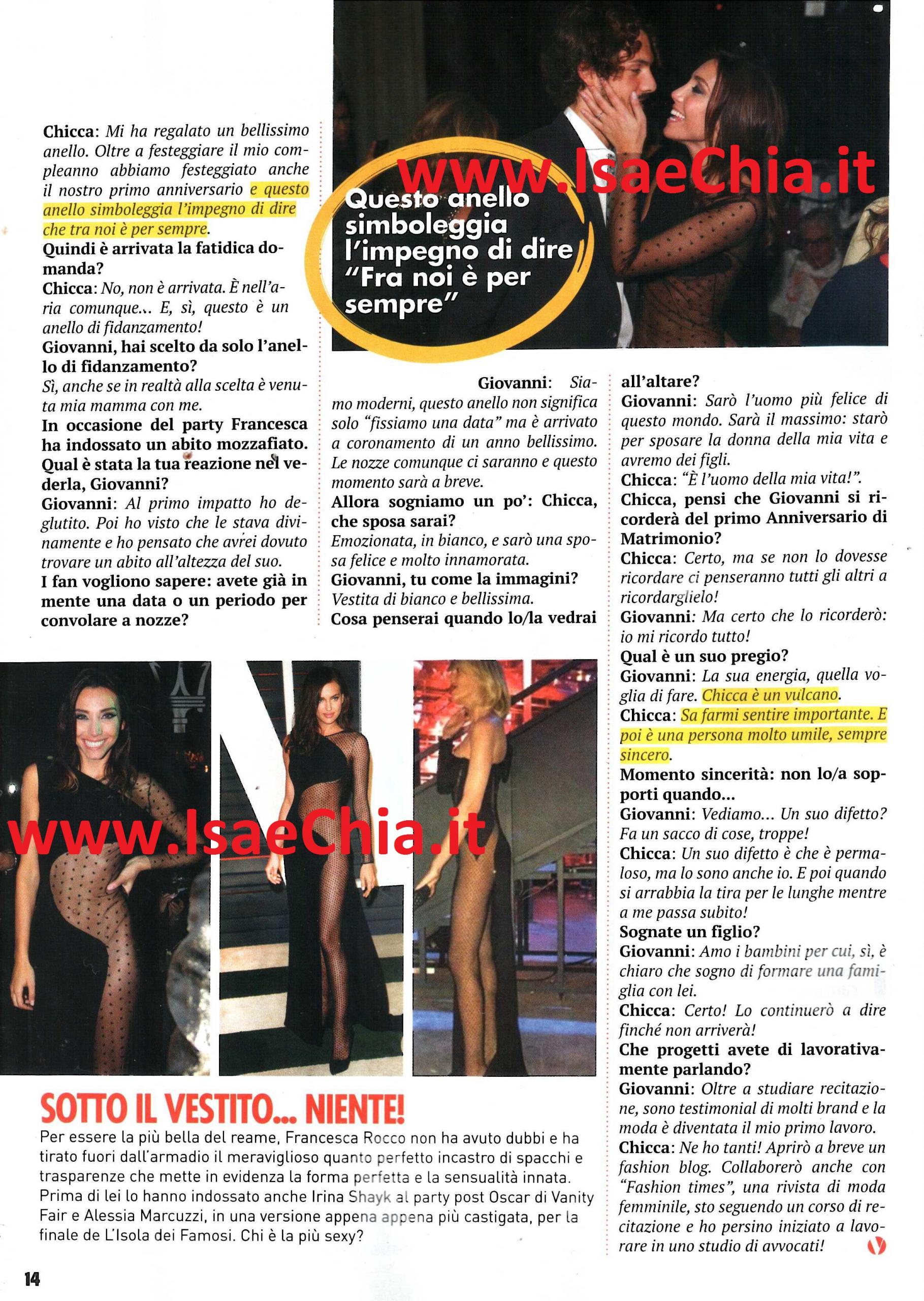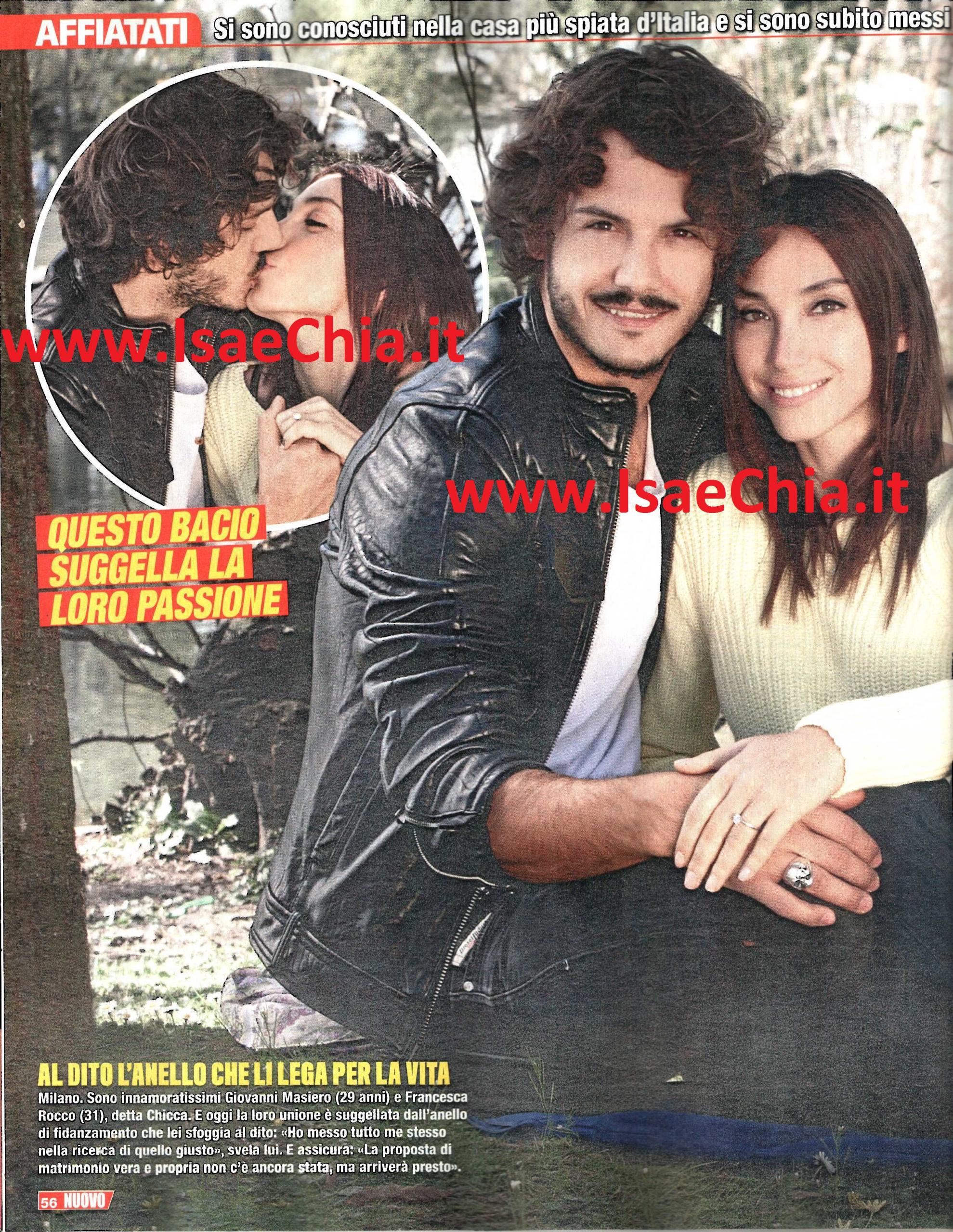 E’ passato un anno da quando Francesca Rocco, detta Chicca, e Giovanni Masiero si sono fidanzati nella Casa del Grande fratello 13. Non tutti credevano nella loro storia, eppure i due si sono dimostrati sempre più legati anche fuori dal programma. Al punto che sono pronti a fare un grande passo: per il compleanno di lei, lui le ha regalato un “brillocco”, un anello di fidanzamento. “La chimica si è creata nella Casa, che è un mondo fatato, magico. Se ci fossimo conosciuti al di fuori, forse non avrebbe avuto la stessa efficacia. All’inizio ero frenato, c’era questa ragazza con un’energia incredibile che cercava di entrarmi nell’anima, ma poi mi sono lasciato andare completamente” dice Giovanni. “A furia di dire che ci avrebbero scommesso in pochi eppure siamo qua, mi porterete sfiga!” scherza lei, che aggiunge: “Non capisco perché le persone debbano scommettere su una coppia. Ci amiamo e stiamo bene insieme e questo è il nostro segreto, come tutte le altre coppie. Per noi è così naturale stare insieme che ho dimenticato che è una storia nata in un reality. Viviamo lontani, io a Milano e lui a Verona e per noi riuscire a ritagliarci dei momenti per stare insieme, anche se sul lavoro, è solo positivo“. A questo punto sorge spontanea la domanda: come mai non convivono? “La convivenza non è ufficialissima, ma in pratica siamo sempre insieme. E’ sarà una cosa bellissima avere una nostra tana da condividere anche con gli amici. Abbiamo avuto miliardi di cose da fare in questo anno, siamo stati sempre in giro insieme e non abbiamo sentito molto la distanza e, di conseguenza, la convivenza non ci è parsa una priorità” rispondono. Quando si chiede loro come mai hanno rifiutato di partecipare al programma Temptation Island l’anno scorso, Nino e Nina (così si chiamano nell’intimità), rispondono: “E’ stato molto difficile dire di no a Maria De Filippi, quasi come se stessimo rifiutando un mostro sacro della tv. Ma tenevano troppo l’uno all’altra per separarci così presto! Saremmo dovuti partire una settimana dopo esser usciti dalla Casa, mentre noi volevamo stare fuori dalla situazione televisiva. Non ci conoscevamo ancora abbastanza e abbiamo preferito vivere la nostra quotidianità. Col senno di poi, abbiamo fatto bene a rifiutare perché abbiamo fatto cose bellissime e la nostra storia è cresciuta molto. Se me lo proponessero adesso, non andrei comunque perché non rientra nelle cose che voglio fare con lui, ma sicuramente non avrei gli stessi timori di un anno fa” aggiunge Chicca. Dopo aver parlato delle loro scenate di gelosia e del viaggio fatto insieme, Chicca commenta finalmente l’anello regalatole da Giovanni per il compleanno: “Oltre a festeggiare il mio compleanno abbiamo festeggiato anche il nostro primo anniversario e quest’anello simboleggia l’impegno di dire che tra di noi è per sempre. La fatidica domanda…non è arrivata ma è nell’aria! Questo è il nostro anello di fidanzamento. Il regalo in sé è stupendo, ma anche se mi avesse regalato un anellino di legno sarebbe stato lo stesso, perché ne ho apprezzato soprattutto il significato“. E lui aggiunge: “Questo non significa solo ‘fissiamo una data’, ma è arrivato a coronamento di un anno bellissimo.Le nozze comunque ci saranno e questo momento sarà a breve“. Dopo questa dichiarazione, quindi, i due futuri sposi si lasciano andare ai sogni: “Emozionata, in bianco, felice e molto innamorata”, si immagina lei. “Vestita di bianco e bellissima. Sarò l’uomo più felice del mondo, sarà il massimo: starò per sposare la donna della mia vita e avremo dei figli” immagina lui. E lei conferma: “Sì, è lui l’uomo della mia vita. Sa farmi sentire importante, è umile e sincero“. E poi, i due allargheranno la famiglia: “Vado matto per i bambini, di sicuro ne faremo” dice Giovanni, mentre Francesca racconta: “Sono cresciuta in una famiglia numerosa e tradizionale, ho una mamma giovane e quasi amica. Ho sempre desiderato avere dei figli, non voglio vivere solo per il lavoro. Professionalmente è un momento importante per me, perché ho fatto giuramento come avvocato e Giovanni era emozionatissimo in quel momento. Ma tra qualche giorno lancerò anche un blog di moda, Touché, e una rubrica settimanale su un altro sito e una rivista di moda“.