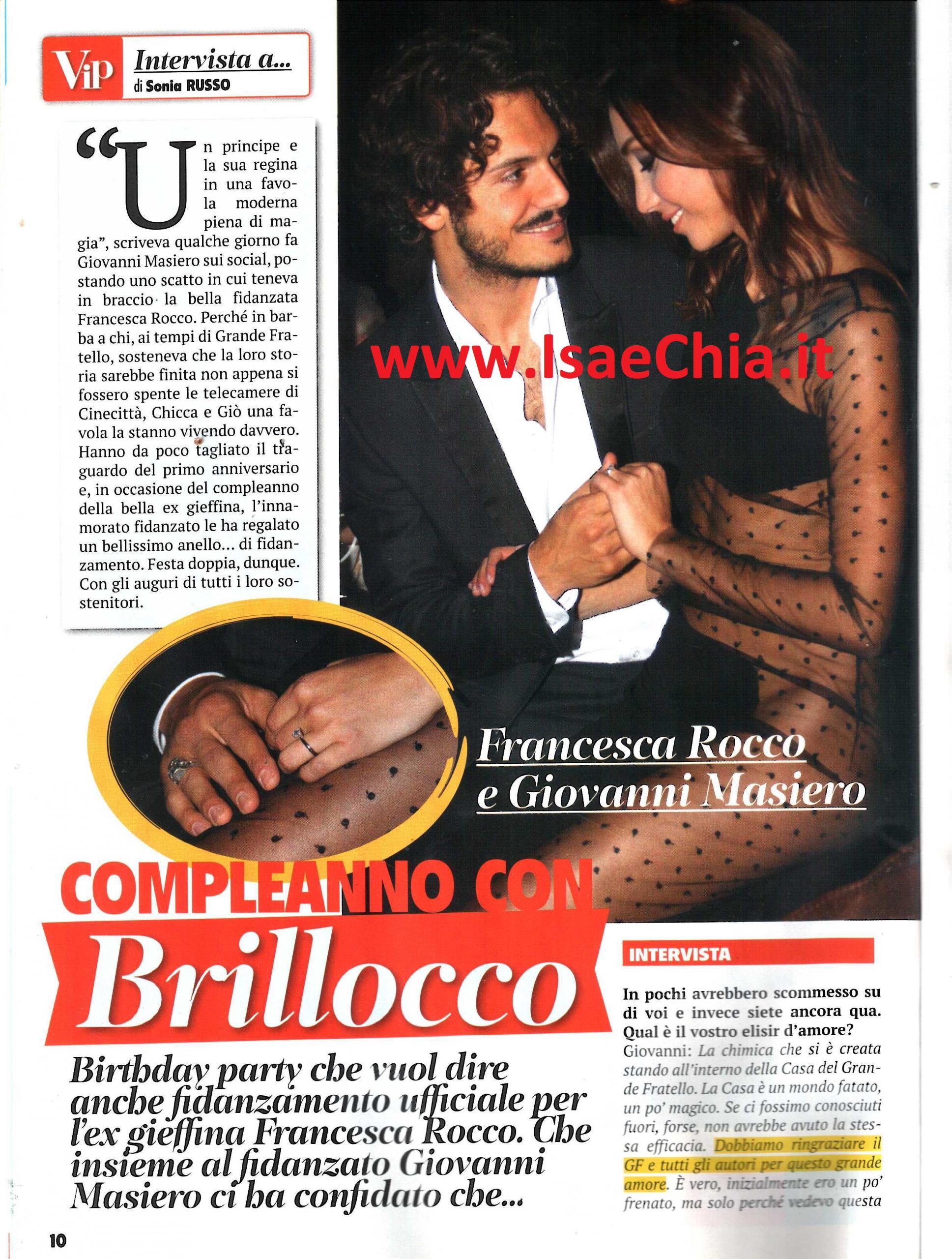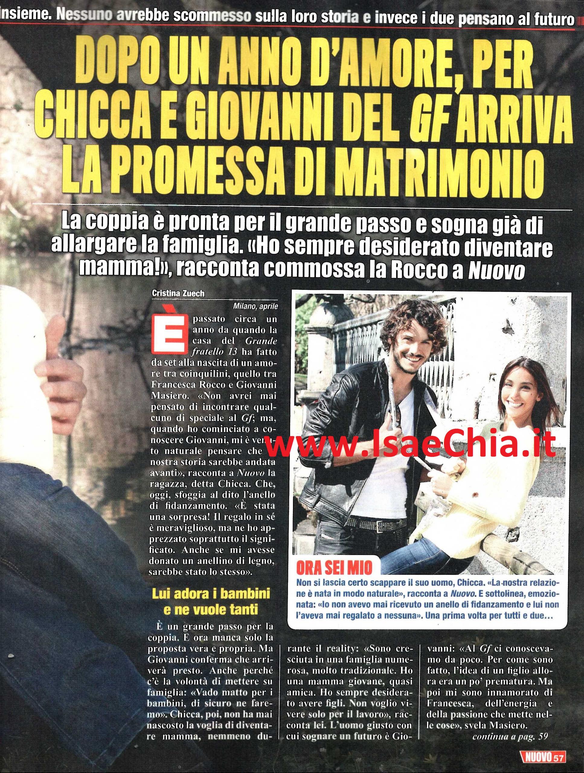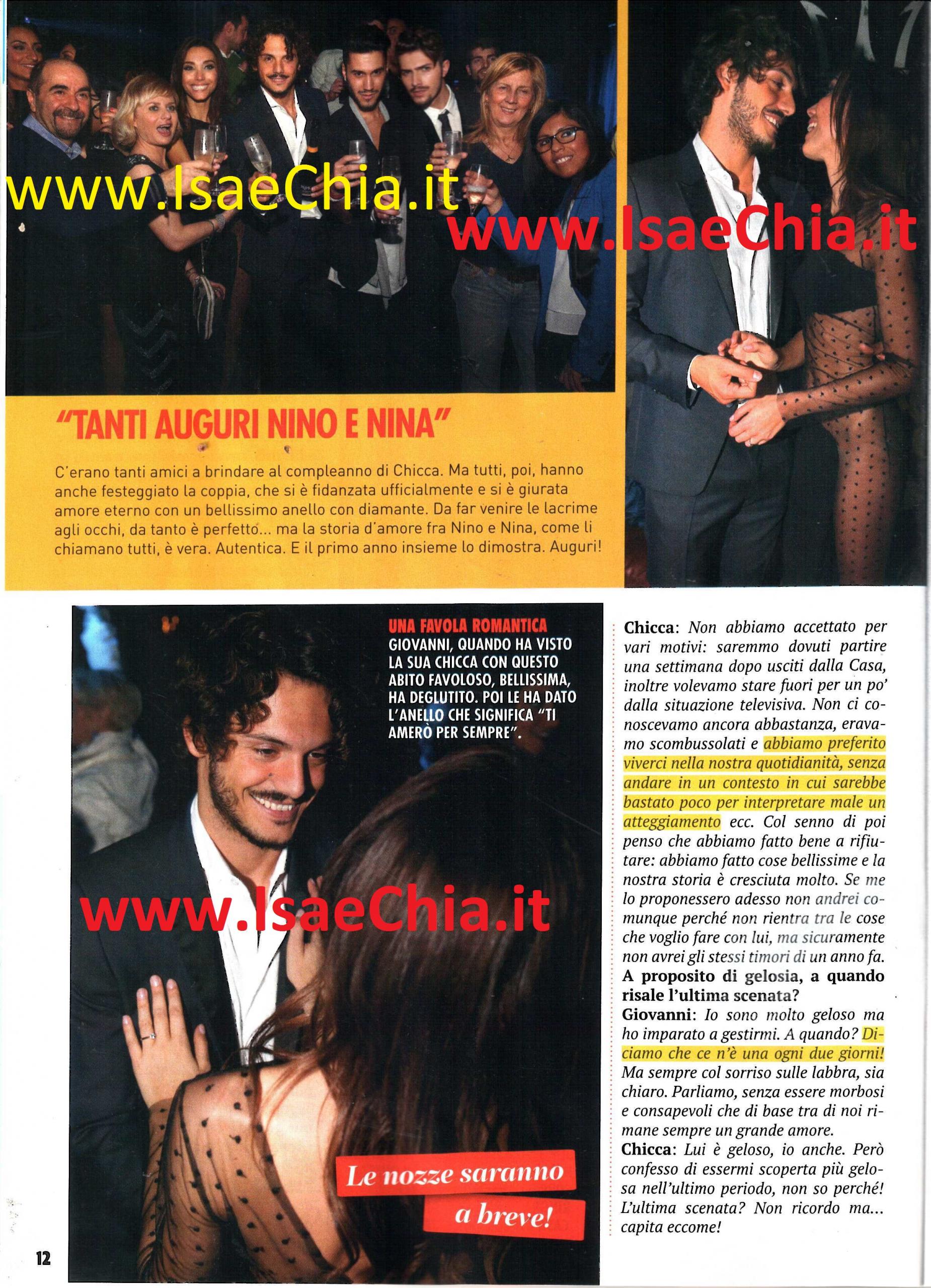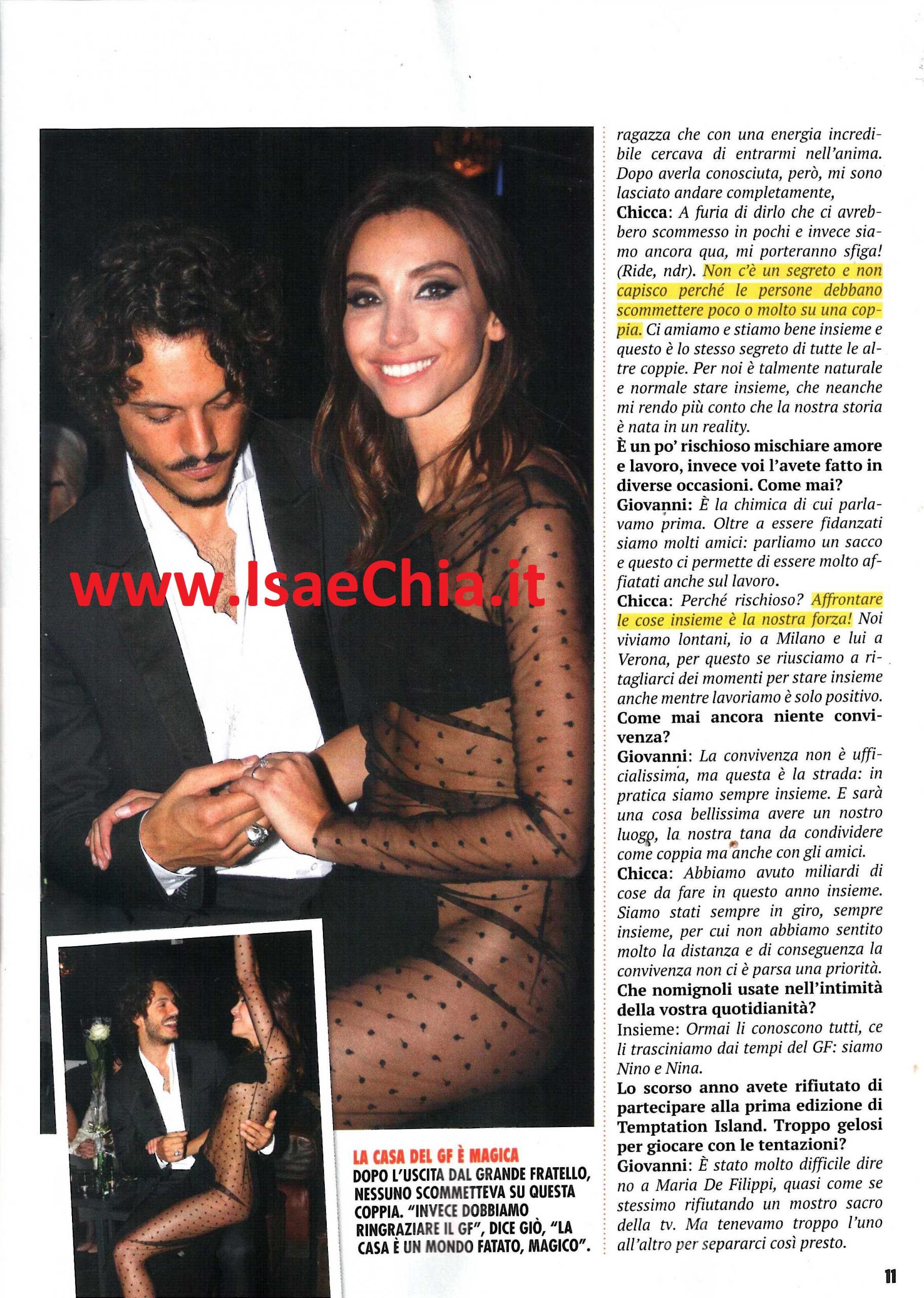E’ passato un anno da quando Francesca Rocco, detta Chicca, e Giovanni Masiero si sono fidanzati nella Casa del Grande fratello 13. Non tutti credevano nella loro storia, eppure i due si sono dimostrati sempre più legati anche fuori dal programma. Al punto che sono pronti a fare un grande passo: per il compleanno di lei, lui le ha regalato un “brillocco”, un anello di fidanzamento. “La chimica si è creata nella Casa, che è un mondo fatato, magico. Se ci fossimo conosciuti al di fuori, forse non avrebbe avuto la stessa efficacia. All’inizio ero frenato, c’era questa ragazza con un’energia incredibile che cercava di entrarmi nell’anima, ma poi mi sono lasciato andare completamente” dice Giovanni. “A furia di dire che ci avrebbero scommesso in pochi eppure siamo qua, mi porterete sfiga!” scherza lei, che aggiunge: “Non capisco perché le persone debbano scommettere su una coppia. Ci amiamo e stiamo bene insieme e questo è il nostro segreto, come tutte le altre coppie. Per noi è così naturale stare insieme che ho dimenticato che è una storia nata in un reality. Viviamo lontani, io a Milano e lui a Verona e per noi riuscire a ritagliarci dei momenti per stare insieme, anche se sul lavoro, è solo positivo“. A questo punto sorge spontanea la domanda: come mai non convivono? “La convivenza non è ufficialissima, ma in pratica siamo sempre insieme. E’ sarà una cosa bellissima avere una nostra tana da condividere anche con gli amici. Abbiamo avuto miliardi di cose da fare in questo anno, siamo stati sempre in giro insieme e non abbiamo sentito molto la distanza e, di conseguenza, la convivenza non ci è parsa una priorità” rispondono. Quando si chiede loro come mai hanno rifiutato di partecipare al programma Temptation Island l’anno scorso, Nino e Nina (così si chiamano nell’intimità), rispondono: “E’ stato molto difficile dire di no a Maria De Filippi, quasi come se stessimo rifiutando un mostro sacro della tv. Ma tenevano troppo l’uno all’altra per separarci così presto! Saremmo dovuti partire una settimana dopo esser usciti dalla Casa, mentre noi volevamo stare fuori dalla situazione televisiva. Non ci conoscevamo ancora abbastanza e abbiamo preferito vivere la nostra quotidianità. Col senno di poi, abbiamo fatto bene a rifiutare perché abbiamo fatto cose bellissime e la nostra storia è cresciuta molto. Se me lo proponessero adesso, non andrei comunque perché non rientra nelle cose che voglio fare con lui, ma sicuramente non avrei gli stessi timori di un anno fa” aggiunge Chicca. Dopo aver parlato delle loro scenate di gelosia e del viaggio fatto insieme, Chicca commenta finalmente l’anello regalatole da Giovanni per il compleanno: “Oltre a festeggiare il mio compleanno abbiamo festeggiato anche il nostro primo anniversario e quest’anello simboleggia l’impegno di dire che tra di noi è per sempre. La fatidica domanda…non è arrivata ma è nell’aria! Questo è il nostro anello di fidanzamento. Il regalo in sé è stupendo, ma anche se mi avesse regalato un anellino di legno sarebbe stato lo stesso, perché ne ho apprezzato soprattutto il significato“. E lui aggiunge: “Questo non significa solo ‘fissiamo una data’, ma è arrivato a coronamento di un anno bellissimo.Le nozze comunque ci saranno e questo momento sarà a breve“. Dopo questa dichiarazione, quindi, i due futuri sposi si lasciano andare ai sogni: “Emozionata, in bianco, felice e molto innamorata”, si immagina lei. “Vestita di bianco e bellissima. Sarò l’uomo più felice del mondo, sarà il massimo: starò per sposare la donna della mia vita e avremo dei figli” immagina lui. E lei conferma: “Sì, è lui l’uomo della mia vita. Sa farmi sentire importante, è umile e sincero“. E poi, i due allargheranno la famiglia: “Vado matto per i bambini, di sicuro ne faremo” dice Giovanni, mentre Francesca racconta: “Sono cresciuta in una famiglia numerosa e tradizionale, ho una mamma giovane e quasi amica. Ho sempre desiderato avere dei figli, non voglio vivere solo per il lavoro. Professionalmente è un momento importante per me, perché ho fatto giuramento come avvocato e Giovanni era emozionatissimo in quel momento. Ma tra qualche giorno lancerò anche un blog di moda, Touché, e una rubrica settimanale su un altro sito e una rivista di moda“.