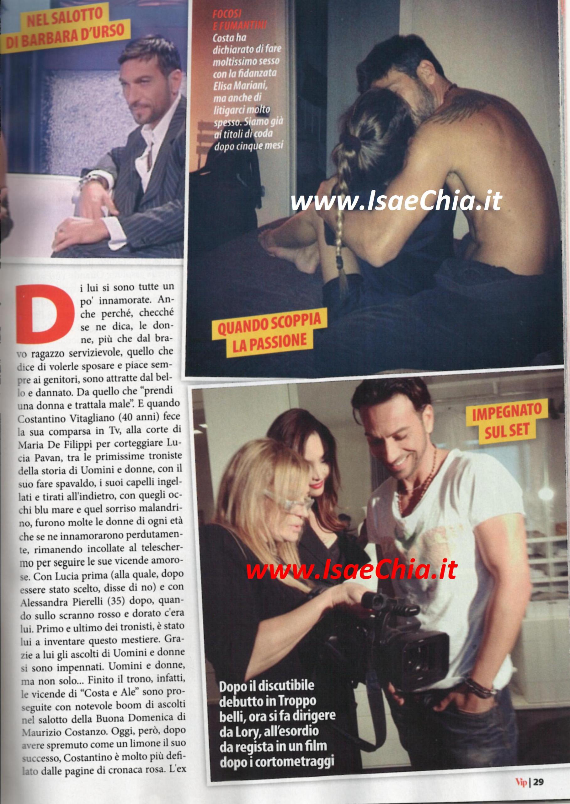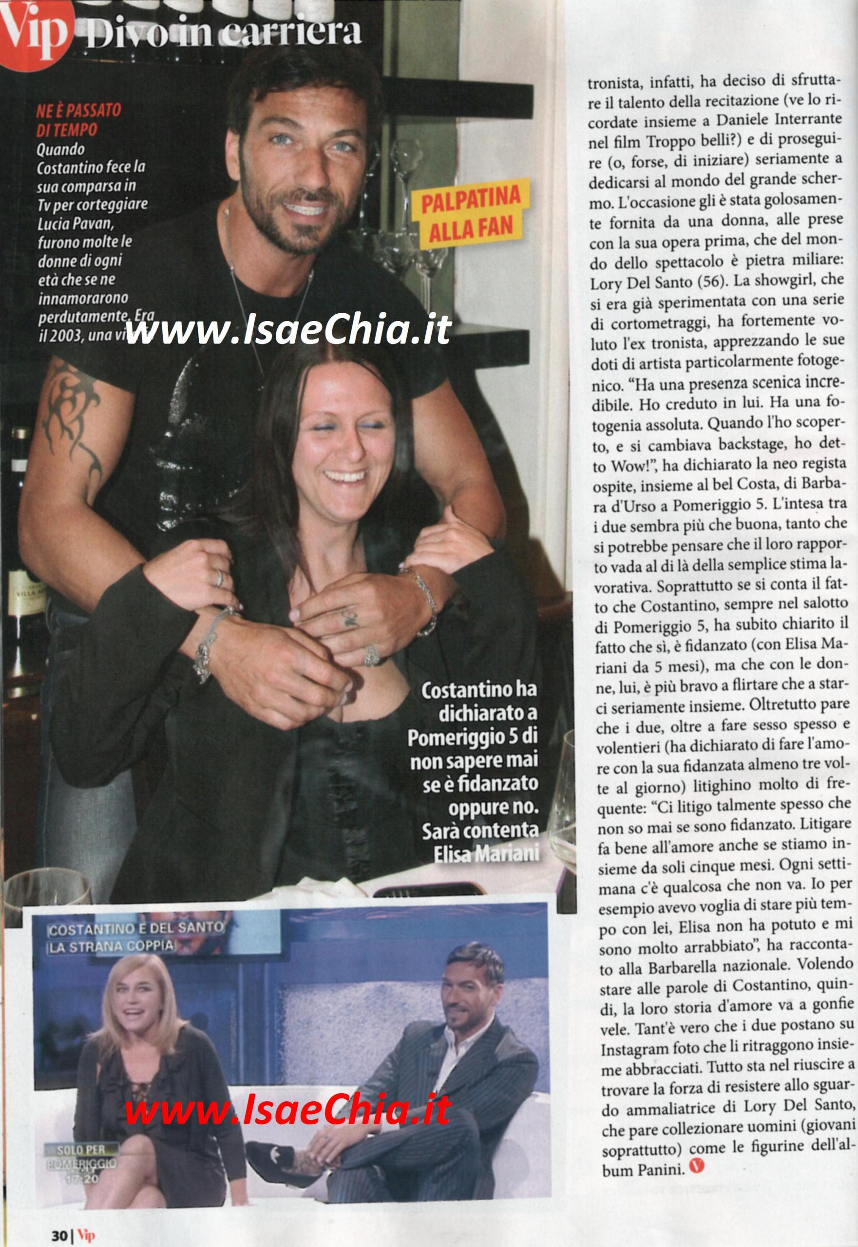 E’ passato tanto tempo da quando Costantino Vitagliano era il ragazzo dagli occhi blu e i capelli ingellati e tirati all’indietro che faceva impazzire il pubblico femminile. E’ stato lui a inventare il mestiere del “tronista” e dopo aver abitato i salotti di Buona domenica con le vicende sue e di Alessandra Pierelli e aver fatto a prezzemolino in tanti programmi e riviste, oggi la sua presenza nella cronaca rosa è sempre minore. Il tronista, infatti, ha deciso di sfruttare il suo talento nella recitazione (come dimenticare il film Troppo belli, in coppia con Daniele Interrante?) e di cominciare a dedicarsi seriamente al grande schermo. L’occasione gli è stata golosamente fornita da Lory Del Santo, l’ex showgirl che ora è produttrice e regista e ha apprezzato le doti di Costa: “Ha una presenza scenica incredibile, una fotogenia assoluta, ho creduto in lui. Quando l’ho scoperto e si cambiava backstage, ho detto Wow!” ha dichiarato la vincitrice dell’Isola dei famosi 3 nel salotto pomeridiano di Barbara D’Urso. Ma guai a insinuare che tra i due ci sia qualcosa! Vitagliano ha precisato che è di nuovo innamorato di un’altra, Elisa Mariani, da cinque mesi. E, proprio come Lory, che non tiene per sé i dettagli sulla passione con il suo toy boy Marco Cucolo (clicca QUI e QUI per rileggere le sue ultime dichiarazioni), anche Costa ha rivelato che lui e la sua nuova fiamma fanno l’amore almeno tre volte al giorno, ma anche che litigano di frequente: “Ci litigo talmente spesso che non so se sono fidanzato. Ogni settimana c’è qualcosa che non va. Per esempio, io volevo stare più tempo con lei, lei non ha potuto e io mi sono arrabbiato” ha rivelato lui. Beh, date queste premesse, speriamo che resisterà alla ammaliatrice Lory!