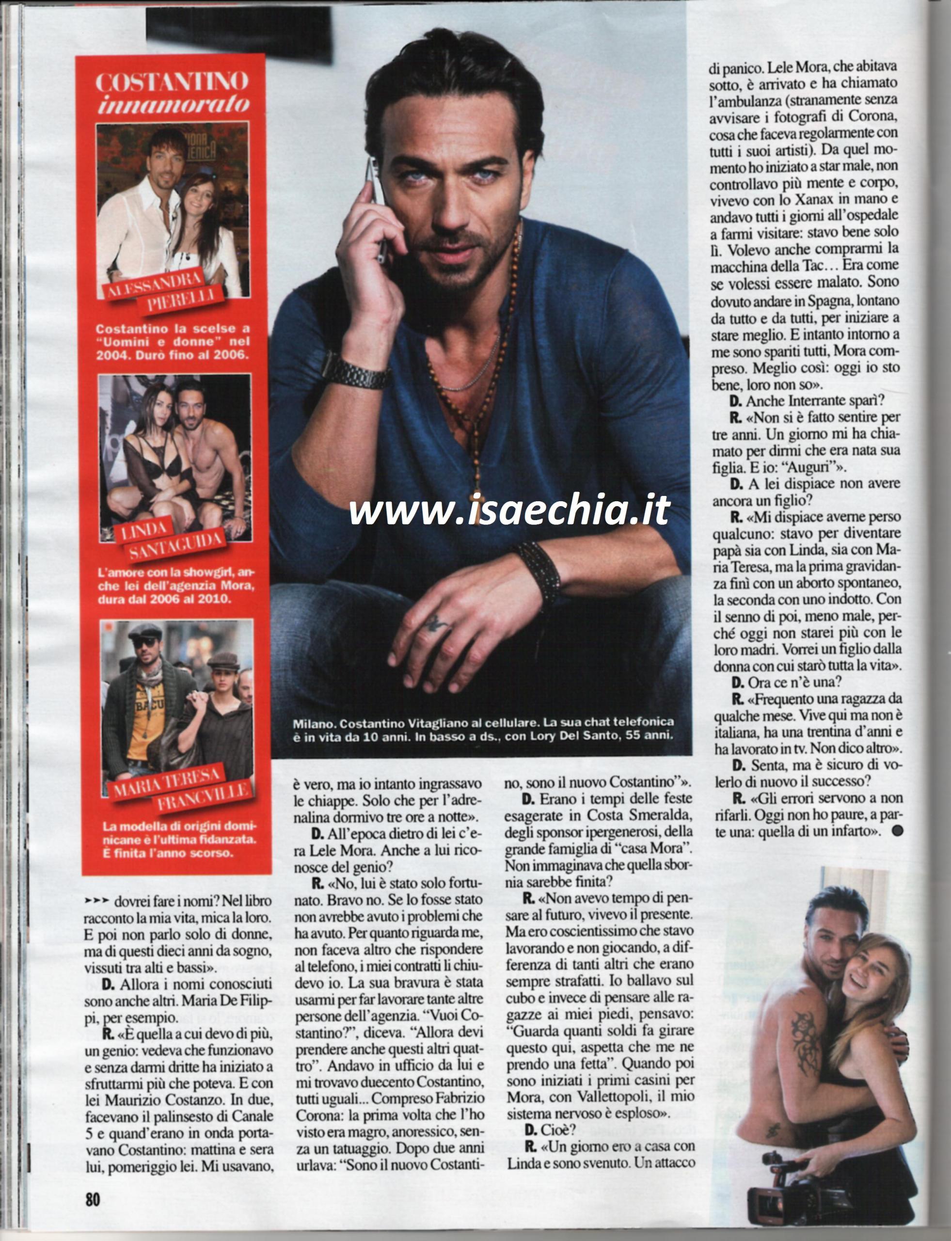 A dieci anni dal suo boom mediatico, l’ex tronista Costantino Vitagliano tenta il rilancio iscrivendosi all’agenzia Silvia Ranzi, partecipando ad un cortometraggio di Lory Del Santo e con un libro suo, Ho avuto tante donne ma non ne ho mai amata nessuna: “Non ho contato quanto ne ho avute, sarebbe impossibile. Ho cominciato a 16 anni a fare l’animatore e la mia prima esperienza l’avevo avuta a 14. Quando lavoravo nei locali, ogni notte avevo una donna diversa. Che fosse sesso o amore, lo si faceva, dappertutto: nei bagni, in macchini, nei camerini, per le scale, in palestra. Nel libro cito le tre donne famose: Alessandra Pierelli, Linda Santaguida e Maria Teresa Francville. Ho avuto anche altre donne potenti dello spettacolo e dell’imprenditoria, ma perché dovrei fare i nomi? Racconto la mia vita, non la loro. Maria De Filippi è la donna a cui devo di più, è un genio. Capiva che funzionavo e senza darmi dritte ha iniziato a sfruttarmi più che poteva. E con lei Maurizio Costanzo. Mi usavano, è vero, ma intanto io ingrassavo le chiappe. Lele Mora è stato solo fortunato, bravo no: se lo fosse stato, non avrebbe avuto i problemi che ha avuto. Mi usava per far lavorare le altre persone della sua agenzia, dicendo: “Vuoi Costantino? Allora devi prendere anche questi altri quattro”. E tra loro c’era anche Fabrizio Corona: era magrissimo, senza un tatuaggio. Dopo due anni urlava “Sono il nuovo Costantino”. Non avevo il tempo di pensare al futuro. Ero coscientissimo che stavo lavorando, al contrario di altri che stavano sempre fatti. Quando sono cominciati i primi casini con Mora e Vallettopoli, il mio sistema nervoso è scoppiato. Una volta ho avuto un attacco d’ansia e sono svenuto e ho cominciato a vivere con lo Xanax in mano e mi sentivo bene solo in ospedale. Daniele Interrante non si è fatto sentire per tre anni, mi ha richiamato solo per dirmi che era nata sua figlia. A me dispiace di aver perso dei figli, da Linda e da Maria Teresa, ma oggi non starei con nessuna delle due, mentre io vorrei un figlio dalla donna con cui starò tutta la vita. Frequento una ragazza che vive qui ma non è italiana, ha una trentina d’anni e ha lavorato in tv”.